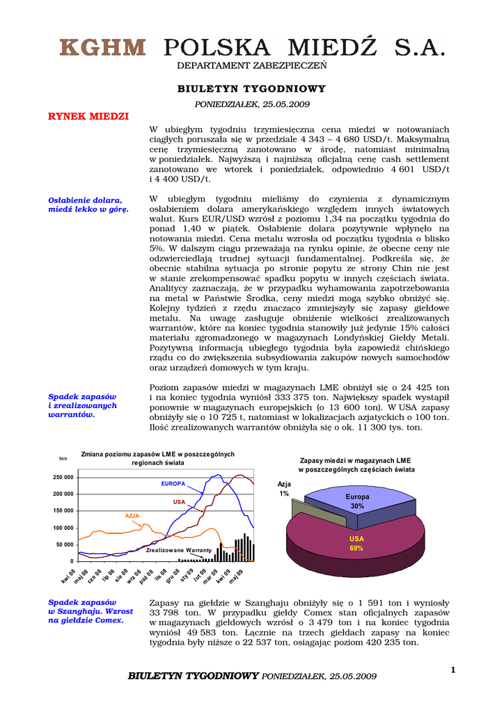 DEPARTAMENT ZABEZPIECZEŃ BIULETYN TYGODNIOWY PONIEDZIAŁEK, 25.05.2009 RYNEK MIEDZI W ubiegłym tygodniu trzymiesięczna cena miedzi w notowaniach ciągłych poruszała się w przedziale 4 343 – 4 680 USD/t. Maksymalną cenę trzymiesięczną zanotowano w środę, natomiast minimalną w poniedziałek. Najwyższą i najniższą oficjalną cenę cash settlement zanotowano we wtorek i poniedziałek, odpowiednio 4 601 USD/t i 4 400 USD/t. W ubiegłym tygodniu mieliśmy do czynienia z dynamicznym osłabieniem dolara amerykańskiego względem innych światowych walut. Kurs EUR/USD wzrósł z poziomu 1,34 na początku tygodnia do ponad 1,40 w piątek. Osłabienie dolara pozytywnie wpłynęło na notowania miedzi. Cena metalu wzrosła od początku tygodnia o blisko 5%. W dalszym ciągu przeważają na rynku opinie, że obecne ceny nie odzwierciedlają trudnej sytuacji fundamentalnej. Podkreśla się, że obecnie stabilna sytuacja po stronie popytu ze strony Chin nie jest w stanie zrekompensować spadku popytu w innych częściach świata. Analitycy zaznaczają, że w przypadku wyhamowania zapotrzebowania na metal w Państwie Środka, ceny miedzi mogą szybko obniżyć się. Kolejny tydzień z rzędu znacząco zmniejszyły się zapasy giełdowe metalu. Na uwagę zasługuje obniżenie wielkości zrealizowanych warrantów, które na koniec tygodnia stanowiły już jedynie 15% całości materiału zgromadzonego w magazynach Londyńskiej Giełdy Metali. Pozytywną informacją ubiegłego tygodnia była zapowiedź chińskiego rządu co do zwiększenia subsydiowania zakupów nowych samochodów oraz urządzeń domowych w tym kraju. Osłabienie dolara, miedź lekko w górę. Poziom zapasów miedzi w magazynach LME obniżył się o 24 425 ton i na koniec tygodnia wyniósł 333 375 ton. Największy spadek wystąpił ponownie w magazynach europejskich (o 13 600 ton). W USA zapasy obniżyły się o 10 725 t, natomiast w lokalizacjach azjatyckich o 100 ton. Ilość zrealizowanych warrantów obniżyła się o ok. 11 300 tys. ton. Spadek zapasów i zrealizowanych warrantów. Zmiana poziomu zapasów LME w poszczególnych regionach świata ton Zapasy miedzi w magazynach LME w poszczególnych częściach świata 250 000 EUROPA 200 000 USA 150 000 Azja 1% Europa 30% AZJA 100 000 50 000 Zrealizow ane W arranty USA 69% 0 pa 8 ź 08 lis 0 gr 8 u 08 st y 09 lu t0 m 9 ar 0 kw 9 i0 m 9 aj 09 08 rz w 08 e si 08 e cz l ip 08 aj m kw i0 8 0 Spadek zapasów w Szanghaju. Wzrost na giełdzie Comex. Zapasy na giełdzie w Szanghaju obniżyły się o 1 591 ton i wyniosły 33 798 ton. W przypadku giełdy Comex stan oficjalnych zapasów w magazynach giełdowych wzrósł o 3 479 ton i na koniec tygodnia wyniósł 49 583 ton. Łącznie na trzech giełdach zapasy na koniec tygodnia były niższe o 22 537 ton, osiągając poziom 420 235 ton. BIULETYN TYGODNIOWY PONIEDZIAŁEK, 25.05.2009 1 DEPARTAMENT ZABEZPIECZEŃ WBMS – bilans rynku miedzi rafinowanej za 3 miesiące 2009 roku Rynek miedzi rafinowanej odnotował nadwyżkę podaży nad popytem wielkości 187 tys. ton w ciągu pierwszych trzech miesięcy 2009 roku. W analogicznym okresie ubiegłego roku bilans rynku wskazywał na deficyt 95 tys. ton miedzi rafinowanej. Produkcja górnicza miedzi w okresie styczeń - marzec wyniosła 3,80 mln ton i była rok do roku 3% wyższa. Produkcja miedzi rafinowanej wzrosła o 2,3% r/r do poziomu 4,58 mln ton. Produkcja rafinowana w Chinach zwiększyła się o 66,3 tys. ton, w Bułgarii, Zambii i Chile łącznie wzrosła o 138 tys. ton w stosunku do ubiegłego roku, zaś w Indiach i Japonii obniżyła się odpowiednio o 11 i 63 tys. ton. Globalna konsumpcja metalu w ciągu pierwszych trzech miesięcy 2009 roku ukształtowała się na poziomie 4,39 mln ton i była o 3,9% mniejsza aniżeli w analogicznym okresie w roku ubiegłym. Zużycie metalu w Chinach wzrosło do poziomu 1,68 mln ton z 1,27 mln ton w analogicznym okresie roku ubiegłego. Tak wysoki wzrost w Państwie Środka może wskazywać na odbudowywanie zapasów (nieoficjalnych), ponieważ zużycie miedzi przez przetwórców w Chinach wzrosło w tym okresie jedynie o 12,7%. Konsumpcja miedzi rafinowanej w Unii Europejskiej wyniosła 0,78 mln ton i była 19% poniżej zużycia w okresie styczeń-marzec 2008. W samym marcu produkcja miedzi rafinowanej wyniosła 1,55 i była na takim samym poziomie jak wielkość zużycia. Wyliczenia zużycia miedzi bazują na danych oficjalnych i nie biorą pod uwagę zmian w stanie zapasów nieoficjalnych (zapasy chińskiej Agencji Rezerw Materiałowych, zapasy producentów, konsumentów i spółek handlowych), które mogą odgrywać znaczącą rolę, zwłaszcza w okresie destockingu lub restockingu. Chiny będą subsydiować zakupy nowych pojazdów i urządzeń domowych Szacowana produkcja górnicza miedzi w Chile w 2009 roku wyniesie 5,5 mln ton Krótka niekomercyjna pozycja netto na giełdzie Comex We wtorek w ubiegłym tygodniu rząd chiński zapowiedział, że Chiny zamierzają rozszerzyć obecny program subsydiowania zakupów nowych samochodów oraz urządzeń domowych w celu pobudzenia konsumpcji w tym kraju. Państwo Środka zamierza przeznaczyć 5 miliardów yuanów (733 mln dolarów) na dopłaty dla osób, które wymienia stare pojazdy na nowe. 2 miliardy yuanów będzie przeznaczone na subsydia do zakupów telewizorów, zmywarek, klimatyzatorów oraz komputerów osobistych – dopłaty wyniosą około 10% wartości nabywanego sprzętu. Cochilco, chilijska komisja rządowa zajmująca się analizą rynku miedzi w tym kraju, przedstawiła w ubiegłym tygodniu nowy raport kwartalny zawierający prognozy dotyczące produkcji górniczej miedzi. W 2009 roku Chile ma wyprodukować 5,5 mln ton metalu, co oznaczałoby wzrost o 3,7% tj. 195 tys. ton, w stosunku do roku ubiegłego. Wzrost ma się odbyć za sprawą zwiększonej produkcji miedzi w kopalniach Collahuasi, Spence i Gaby. Krótka niekomercyjna pozycja netto na 19 maja na giełdzie Comex zwiększy
