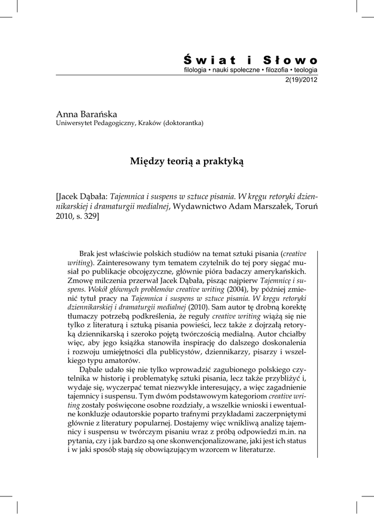 Świat i Słowo filologia • nauki społeczne • filozofia • teologia 2(19)/2012 Anna Barańska Uniwersytet Pedagogiczny, Kraków (doktorantka) Między teorią a praktyką [Jacek Dąbała: Tajemnica i suspens w sztuce pisania. W kręgu retoryki dziennikarskiej i dramaturgii medialnej, Wydawnictwo Adam Marszałek, Toruń 2010, s. 329] Brak jest właściwie polskich studiów na temat sztuki pisania (creative writing). Zainteresowany tym tematem czytelnik do tej pory sięgać musiał po publikacje obcojęzyczne, głównie pióra badaczy amerykańskich. Zmowę milczenia przerwał Jacek Dąbała, pisząc najpierw Tajemnicę i suspens. Wokół głównych problemów creative writing (2004), by później zmienić tytuł pracy na Tajemnica i suspens w sztuce pisania. W kręgu retoryki dziennikarskiej i dramaturgii medialnej (2010). Sam autor tę drobną korektę tłumaczy potrzebą podkreślenia, że reguły creative writing wiążą się nie tylko z literaturą i sztuką pisania powieści, lecz także z dojrzałą retoryką dziennikarską i szeroko pojętą twórczością medialną. Autor chciałby więc, aby jego książka stanowiła inspirację do dalszego doskonalenia i rozwoju umiejętności dla publicystów, dziennikarzy, pisarzy i wszelkiego typu amatorów. Dąbale udało się nie tylko wprowadzić zagubionego polskiego czytelnika w historię i problematykę sztuki pisania, lecz także przybliżyć i, wydaje się, wyczerpać temat niezwykle interesujący, a więc zagadnienie tajemnicy i suspensu. Tym dwóm podstawowym kategoriom creative writing zostały poświęcone osobne rozdziały, a wszelkie wnioski i ewentualne konkluzje odautorskie poparto trafnymi przykładami zaczerpniętymi głównie z literatury popularnej. Dostajemy więc wnikliwą analizę tajemnicy i suspensu w twórczym pisaniu wraz z próbą odpowiedzi m.in. na pytania, czy i jak bardzo są one skonwencjonalizowane, jaki jest ich status i w jaki sposób stają się obowiązującym wzorcem w literaturze. 318 Anna Barańska Niewątpliwą trudnością, z jaką musiał zmierzyć się autor, była konieczność rozpoznania powyższych kategorii „w ruchu”, oglądania ich z różnych punktów widzenia, poddania wieloaspektowej analizie. Dąbała poradził sobie z tym problemem świetnie, wzbogacając swoje rozważania o liczne przykłady z powieści przez wszystkich znanych i lubianych jak choćby często cytowana Ostatnia zagadka A. C. Doyle’a, Sokół maltański D. Hammett’a czy Frankenstein M. Shelly. Nie oznacza to bynajmniej, że badacz ograniczył się tylko do literatury z tzw. niższej półki. Na kartach pracy przewijają się także takie nazwiska jak M. Bułhakow czy U. Eco. Kolejną niedogodnością w studiach nad twórczym pisaniem była specyfika samego przedmiotu badań. Po pierwsze jest on nastawiony głównie na praktyczne wykorzystanie i z rzadka zajmuje się teorią i opisem zjawisk. Po drugie, sformułowania stosowane w obrębie creative writing mogą wydawać się niektórym, co poważniejszym teoretykom, zbyt uproszczone i oczywiste. Uważny czytelnik zauważy, że Tajemnica i suspens w sztuce pisania odsłaniają z jednej strony perspektywę badacza problemu, z drugiej zaś praktyka. Nie można przecież zapomnieć, że Jacek Dąbała jest zarówno wykładowcą i teoretykiem mass mediów, retoryki dziennikarskiej, komunikacji medialnej, jak i autorem dziewięciu powieści, z których warto przypomnieć choćby Pieszczochy losu, za które w 1997 roku otrzymał nagrodę literacką im. Bolesława Prusa. Czy to w jakiś sposób predestynuje go do badania mechanizmów creative writing? Wydaje się, że absolutnie tak. Łączenie ról twórcy i badacza pozwala spojrzeć na omawiane problemy ze szczególnej, rzadkiej u nas perspektywy, która odsłaniać może nowe, nieznane dotąd podejścia do twórczego pisania. Zapewne dzięki temu Jacek Dąbała był w stanie zauważyć wagę tajemnicy i suspensu, i rzeczywiście ogromne braki w polskiej teorii literatury, która tym zagadnieniom nie poświęcała dotąd zbyt wiele miejsca. Tymczasem, jak dowiódł nam autor, na świecie zarówno twórcze pisanie, jak też tajemnica i suspens doczekały się już niejednej głębokiej analizy i obszerniejszych studiów. Cieszy więc fakt, że także u nas zostały dostrzeżone i teraz możemy z niecierpliwością czekać na ciąg dalszy… a, że nastąpi, nie mam wątpliwości.