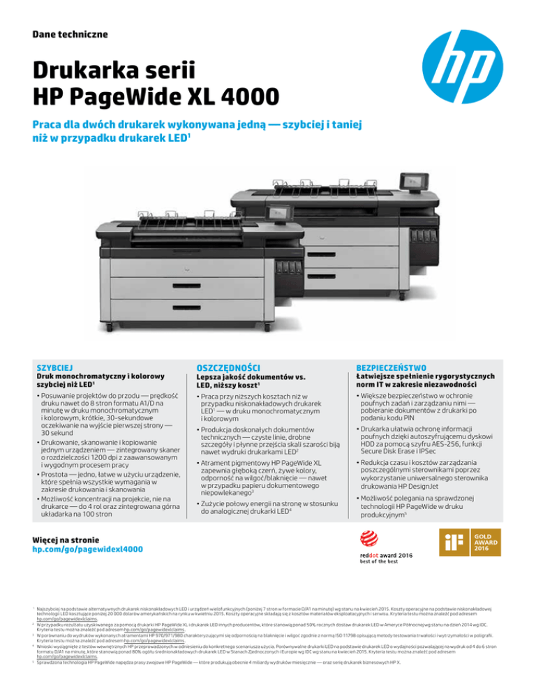 Dane techniczne Drukarka serii HP PageWide XL 4000 Praca dla dwóch drukarek wykonywana jedną — szybciej i taniej niż w przypadku drukarek LED1 SZYBCIEJ OSZCZĘDNOŚCI BEZPIECZEŃSTWO •Posuwanie projektów do przodu — prędkość druku nawet do 8 stron formatu A1/D na minutę w druku monochromatycznym i kolorowym, krótkie, 30-sekundowe oczekiwanie na wyjście pierwszej strony — 30 sekund •Drukowanie, skanowanie i kopiowanie jednym urządzeniem — zintegrowany skaner o rozdzielczości 1200 dpi z zaawansowanym i wygodnym procesem pracy •Prostota — jedno, łatwe w użyciu urządzenie, które spełnia wszystkie wymagania w zakresie drukowania i skanowania •Możliwość koncentracji na projekcie, nie na drukarce — do 4 rol oraz zintegrowana górna układarka na 100 stron •Praca przy niższych kosztach niż w przypadku niskonakładowych drukarek LED1 — w druku monochromatycznym i kolorowym •Większe bezpieczeństwo w ochronie poufnych zadań i zarządzaniu nimi — pobieranie dokumentów z drukarki po podaniu kodu PIN •Produkcja doskonałych dokumentów technicznych — czyste linie, drobne szczegóły i płynne przejścia skali szarości biją nawet wydruki drukarkami LED2 •Drukarka ułatwia ochronę informacji poufnych dzięki autoszyfrującemu dyskowi HDD za pomocą szyfru AES-256, funkcji Secure Disk Erase i IPSec •Atrament pigmentowy HP PageWide XL zapewnia głęboką czerń, żywe kolory, odporność na wilgoć/blaknięcie — nawet w przypadku papieru dokumentowego niepowlekanego3 •Redukcja czasu i kosztów zarządzania poszczególnymi sterownikami poprzez wykorzystanie uniwersalnego sterownika drukowania HP DesignJet Druk monochromatyczny i kolorowy szybciej niż LED1 Lepsza jakość dokumentów vs. LED, niższy koszt1 •Zużycie połowy energii na stronę w stosunku do analogicznej drukarki LED4 Łatwiejsze spełnienie rygorystycznych norm IT w zakresie niezawodności •Możliwość polegania na sprawdzonej technologii HP PageWide w druku produkcyjnym5 Więcej na stronie hp.com/go/pagewidexl4000 Najszybciej na podstawie alternatywnych drukarek niskonakładowych LED i urządzeń wielofunkcyjnych (poniżej 7 stron w formacie D/A1 na minutę) wg stanu na kwiecień 2015. Koszty operacyjne na podstawie niskonakładowej 1 technologii LED kosztujące poniżej 20 000 dolarów amerykańskich na rynku w kwietniu 2015. Koszty operacyjne składają się z kosztów materiałów eksploatacyjnych i serwisu. Kryteria testu można znaleźć pod adresem hp.com/go/pagewidexlclaims. W przypadku rezultatu uzyskiwanego za pomocą drukarki HP PageWide XL i drukarek LED innych producentów, które stanowią ponad 50% rocznych dostaw drukarek LED w Ameryce Północnej wg stanu na dzień 2014 wg IDC. Kryteria testu można znaleźć pod adresem hp.com/go/pagewidexlclaims. 3 W porównaniu do wydruków wykonanych atramentami HP 970/971/980 charakteryzującymi się odpornością na blaknięcie i wilgoć zgodnie z normą ISO 11798 opisującą metody testowania trwałości i wytrzymałości w poligrafii. Kryteria testu można znaleźć pod adresem hp.com/go/pagewidexlclaims. 4 Wnioski wyciągnięte z testów wewnętrznych HP przeprowadzonych w odniesieniu do konkretnego scenariusza użycia. Porównywalne drukarki LED na podstawie drukarek LED o wydajności pozwalającej na wydruk od 4 do 6 stron formatu D/A1 na minutę, które stanowią ponad 80% ogółu średnionakładowych drukarek LED w Stanach Zjednoczonych i Europie wg IDC wg stanu na kwiecień 2015. Kryteria testu można znaleźć pod adresem hp.com/go/pagewidexlclaims. 5 Sprawdzona technologia HP PageWide napędza prasy zwojowe HP PageWide — które produkują obecnie 4 miliardy wydruków miesięcznie — oraz serię drukarek biznesowych HP X. 2 Dane techniczne | Drukarka serii HP PageWide XL 4000 Poprawa produktywności w pracy. Drukarki serii HP PageWide XL 4000 łączą w sobie druk monochromatyczny i kolorowy, a także możliwość drukowania, skanowania i kopiowania jednym urządzeniem. Szybka produkcja wysokiej jakości dokumentów pozwala skupić się na posuwaniu projektów do przodu. • Poprawa wydajności pracy • Nowy standard jakościowy dokumentów technicznych • Oszczędność miejsca, prostsza praca • Łatwość obsługi, łatwość zarządzania • Lepszy wybór do biura — i dla środowiska Drukarka serii HP PageWide XL 4000 Poprawa wydajności pracy Drukarki serii HP PageWide XL 4000 opracowano z myślą o zwiększeniu produktywności, niezależnie od tego, czy mamy do czynienia z dużym projektem drukarskim czy z krótkim zadaniem. • Brak czasu nagrzewania i ultraszybkie przetwarzanie sprawiają, że drukarek serii HP PageWide XL 4000 można użyć do wykonania większości zadań w czasie, w którym inne urządzenia wciąć przygotowywałyby się do wydruku pierwszej strony • Dzięki prędkości druku do 8 stron w formacie A1/D na minutę zarówno w przypadku stron monochromatycznych, jak i kolorowych, radzenie sobie z lawiną zadań i realizacja dużych projektów nie stanową już wyzwania Nowy standard jakościowy dokumentów technicznych Celem głowic drukujących HP 841 PageWide XL pracujących z atramentami pigmentowymi HP PageWide XL jest osiągnięcie wysokiej jakości rezultatów o głębokich odcieniach czerni, neutralnych szarościach i żywych kolorach, które będą odporne na wilgoć i blaknięcie.3 Efektem zastosowania dokładnej i niezawodnej techniki rozmieszczania punktów są czyste linie, drobne szczegóły i płynne przejścia skali szarości. Drukarki HP PageWide XL w czasie procesu drukowania nie przenoszą na papier ciepła, co wpływa na bardzo wysokie poziomy dokładności długości (±0,1%). Oszczędność miejsca, prostsza praca Drukarka serii HP PageWide XL 4000 zastępuje w działaniu inne — jest szybsza i koszty jej pracy są eksploatacji są niższe niż w przypadku drukarek LED.1 Jedno urządzenie pozwala zaoszczędzić miejsce i uprościć pracę — o j