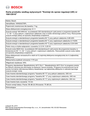 Karta produktu według wytycznych "Komisji do spraw regulacji (UE) nr 1061/2010" Marka: Bosch Identyfikator: WAN2427SPL Pojemność znamionowa dla bawełny: 7 kg Klasa efektywności energetycznej: A+++ Zużycie energii 164 kWh/rok, na podstawie 220 standardowych cykli prania w programie bawełna 60 ° C i 40 ° C przy pełnym i częściowym załadunku oraz w trybie obniżonego poboru mocy. Rzeczywiste zużycie energii zależy od sposobu eksploatacji urządzenia. Zużycie energii w standardowym programie bawełna 60 °C przy pełnym załadunku 0,89 kWh Zużycie energii w standardowym programie bawełna 60 °C przy częściowym załadunku 0,71kWh Zużycie energii w standardowym programie bawełna 40 °C przy częściowym załadunku 0,54 kWh Pobór mocy w trybie wyłączenia i czuwania: 0,12 W / 0,50 W Zużycie wody 9020 l/rok, na podstawie 220 standardowych cykli prania dla programów bawełny w temperaturze 60 ° C i 40 ° C przy pełnym i częściowym załadunku. Rzeczywiste zużycie wody zależy od sposobu eksploatacji urządzenia. Klasa efektywności wirowania B w skali od G (najmniej efektywna energetycznie) do A (najbardziej efektywna) Maksymalna prędkość wirowania 1175 rpm Wilgotność resztkowa: 55% Programy standardowe ’Bawełna/kolory 40°C Eco’ i ’ Bawełna/kolory 60°C Eco’ to programy prania, do których odnoszą się informacja na etykiecie i karcie produktu. Programy te przeznaczone są do prania normalnie zabrudzonej bielizny bawełnianej i są najbardziej efektywne w zakresie łącznego zużycia energii i wody Czas trwania standardowego programu "bawełna 60 °C" przy pełnym załadunku: 200 min Czas trwania standardowego programu "bawełna 60 ° C" przy częściowym załadunku: 200 min Czas trwania standardowego programu "bawełna 40 °C" przy częściowym załadunku: 200 min Czas trwania trybu czuwania: 15 min Poziom emisji hałasu: Pranie: 56 dB (A) Wirowanie: 75 dB (A) Wolnostojące Listopad 26, 2015 BSH Sprzęt Gospodarstwa Domowego Sp. z o.o., Al. Jerozolimskie 183, 02-222 Warszawa www.bosch-home.pl