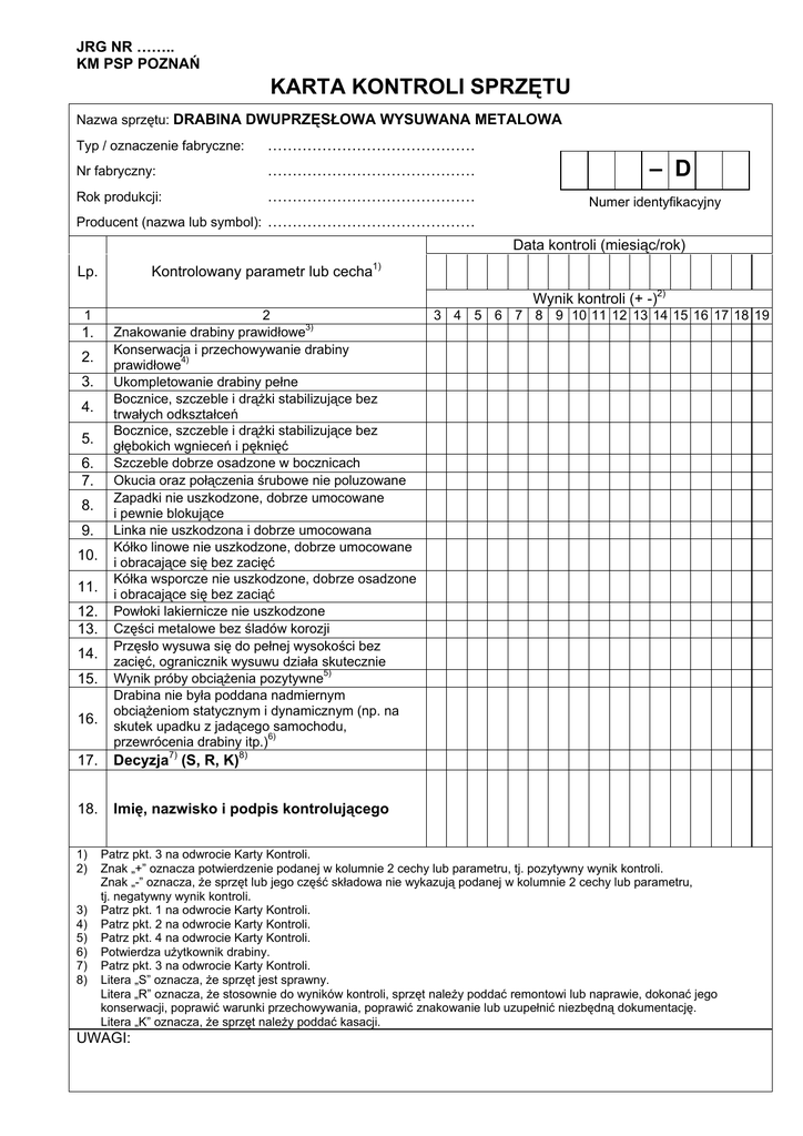 JRG NR …….. KM PSP POZNAŃ KARTA KONTROLI SPRZĘTU Nazwa sprzętu: DRABINA DWUPRZĘSŁOWA WYSUWANA METALOWA Typ / oznaczenie fabryczne: …………………………………… Nr fabryczny: …………………………………… Rok produkcji: …………………………………… – D Numer identyfikacyjny Producent (nazwa lub symbol): …………………………………… Data kontroli (miesiąc/rok) Kontrolowany parametr lub cecha1) Lp. Wynik kontroli (+ -)2) 1 1. 2. 3. 4. 5. 6. 7. 8. 9. 10. 11. 12. 13. 14. 15. 16. 2 Znakowanie drabiny prawidłowe3) Konserwacja i przechowywanie drabiny prawidłowe4) Ukompletowanie drabiny pełne Bocznice, szczeble i drążki stabilizujące bez trwałych odkształceń Bocznice, szczeble i drążki stabilizujące bez głębokich wgnieceń i pęknięć Szczeble dobrze osadzone w bocznicach Okucia oraz połączenia śrubowe nie poluzowane Zapadki nie uszkodzone, dobrze umocowane i pewnie blokujące Linka nie uszkodzona i dobrze umocowana Kółko linowe nie uszkodzone, dobrze umocowane i obracające się bez zacięć Kółka wsporcze nie uszkodzone, dobrze osadzone i obracające się bez zaciąć Powłoki lakiernicze nie uszkodzone Części metalowe bez śladów korozji Przęsło wysuwa się do pełnej wysokości bez zacięć, ogranicznik wysuwu działa skutecznie Wynik próby obciążenia pozytywne5) Drabina nie była poddana nadmiernym obciążeniom statycznym i dynamicznym (np. na skutek upadku z jadącego samochodu, przewrócenia drabiny itp.)6) 17. Decyzja7) (S, R, K)8) 18. Imię, nazwisko i podpis kontrolującego 1) 2) 3) 4) 5) 6) 7) 8) 3 4 5 6 7 8 9 10 11 12 13 14 15 16 17 18 19 Patrz pkt. 3 na odwrocie Karty Kontroli. Znak „+” oznacza potwierdzenie podanej w kolumnie 2 cechy lub parametru, tj. pozytywny wynik kontroli. Znak „-” oznacza, że sprzęt lub jego część składowa nie wykazują podanej w kolumnie 2 cechy lub parametru, tj. negatywny wynik kontroli. Patrz pkt. 1 na odwrocie Karty Kontroli. Patrz pkt. 2 na odwrocie Karty Kontroli. Patrz pkt. 4 na odwrocie Karty Kontroli. Potwierdza użytkownik drabiny. Patrz pkt. 3 na odwrocie Karty Kontroli. Litera „S” oznacza, że sprzęt jest sprawny. Litera „R” oznacza, że stosownie do wyników kontroli, sprzęt należy poddać remontowi lub naprawie, dokonać jego konserwacji, poprawić warunki przechowywania, poprawić znakowanie lub uzupełnić niezbędną dokumentację. Litera „K” oznacza, że sprzęt należy poddać kasacji. UWAGI: 1. ZNAKOWANIE Drabina powinna być trwale i czytelnie oznakowana numerem identyfikacyjnym (inwentarzowym lub serwisowym). Znakowanie powinno być wykonane w sposób nie utrudniający odczytu znakowania producenta. Znakowanie nie powinno pogarszać cech użytkowych drabiny. 2. KONSERWACJA I PRZECHOWYWANIE Jeżeli producent nie zalecił inaczej, konserwację i przechowywanie należy prowadzić według podanych niżej zasad. Konserwację bieżącą drabiny należy przeprowadzać po każdym użyciu, podczas którego doszło do jej zabrudzenia lub zawilgocenia. Drabinę należy oczyścić, a następnie starannie wytrzeć miękką szmatą do sucha. Należy ponadto przesmarować olejem maszynowym osie kółek, rolek, zapadek, gwinty, punkty mocowań drążków stabilizujących oraz natrzeć rowki prowadników sproszkowanym grafitem, o ile producent nie podał innych zaleceń. Konserwację okresową należy przeprowadzać co 12 miesięcy, niezależnie od warunków, w których drabina była używana. W ramach konserwacji okresowej należy: • pokryć powierzchnie zabezpieczone powłokami lakierniczymi, lakierami w tych samych kolorach, jakie uprzednio były stosowane, • nasmarować olejem maszynowym osie kółek, rolek, zapadek, gwinty, punkty mocowań drążków stabilizujących, • natrzeć sproszkowanym grafitem rowki prowadników, • wymyć linkę w łagodnym roztworze środka piorącego, następnie wypłukać w czystej wodzie i wysuszyć w temperaturze pokojowej. Drabiny nie będące w użytkowaniu, prawidłowo zakonserwowane i magazynowane (tj. przechowywane w suchych i przewiewnych pomieszczeniach, w stanie zabezpieczonym przed działaniem światła słonecznego o dużym natężeniu, źródeł ciepła i wpływami czynników chemicznych) nie wymagają ponownej konserwacji. 3. KONTROLA 3.1. Kontrola okresowa Kontrolę okresową wykonuje jednostka PSP, w której posiadaniu jest drabina. Kontrola obejmuje drabiny będące w użytkowaniu oraz drabiny znajdujące się w magazynie. Kontrolę należy wykonywać co 12 miesięcy. Kontrola polega na sprawdzeniu kolejno wszystkich parametrów lub cech podanych w Karcie Kontroli i dokonaniu każdorazowo zapisów w Karcie zgodnie z podanymi w niej wskazówkami. Podejmowane decyzje powinny odnosić się do pojedynczych przęseł z osobna i do całej drabiny. Decyzja „S” powinna być podejmowana w przypadku, gdy wyniki wszystkich kontroli podanych w lp. 1 – 16 Karty są pozytywne. Decyzja „R” powinna być podejmowana, gdy negatywne są wyniki choć jednej z kontroli według lp. 1 – 3, 4 i 5 (w zakresie drążków stabilizujących), lp. 7 - 14 – jeżeli nie stwierdzono uszkodzeń mogących pogorszyć bezpieczeństwo użytkowania drabiny. Jeżeli na podstawie wyników kontroli podjęto decyzję „R”, to bezpośrednio po usunięciu jej przyczyn (np. w wyniku wykonanej naprawy) należy dokonać kontroli co najmniej tych parametrów lub cech, które spowodowały tę decyzję. Ponownie zapisać wyniki kontroli i podjętą decyzję. Decyzja „K” powinna być podejmowana, gdy negatywne są wyniki choć jednej z kontroli według lp. 4 i 5 (nie dotyczy drążków stabilizujących), lp. 6, 15 i 16 – jeśli stwierdzono uszkodzenia mogące pogorszyć bezpieczeństwo użytkowania drabiny. Decyzję tę należy również podejmować w przypadku, gdy remont drabiny wymaga zbyt dużych nakładów pracy lub nie daje gwarancji odtworzenia wymaganych cech bez pogorszenia innych jej cech u