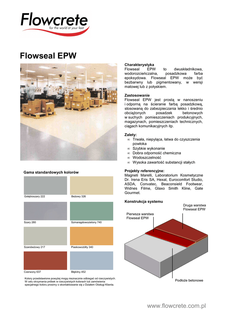 Flowseal EPW Charakterystyka Flowseal EPW to dwuskładnikowa, wodorozcieńczalna, posadzkowa farba epoksydowa. Flowseal EPW moŜe być bezbarwny lub pigmentowany, w wersji matowej lub z połyskiem. Zastosowanie Flowseal EPW jest prostą w nanoszeniu i odporną na ścieranie farbą posadzkową, stosowaną do zabezpieczania lekko i średnio obciąŜonych posadzek betonowych w suchych pomieszczeniach produkcyjnych, magazynach, pomieszczeniach technicznych, ciągach komunikacyjnych itp. Zalety: • Trwała, niepyląca, łatwa do czyszczenia powłoka • Szybkie wykonanie • Dobra odporność chemiczna • Wodoszczelność • Wysoka zawartość substancji stałych Gama standardowych kolorów Gołębioszary 222 Projekty referencyjne: Magneti Marelli, Laboratorium Kosmetyczne Dr. Irena Eris SA, Hexal, Eurocomfort Studio, ASDA, Convatec, Beaconsield Footwear, Widnes Filme, Glaxo Smith Kline, Gate Gourmet. BeŜowy 326 Konstrukcja systemu Druga warstwa Flowseal EPW Pierwsza warstwa Flowseal EPW Szary 280 Szmaragdowozielony 740 SzarobeŜowy 217 PiaskowoŜółty 340 Czerwony 637 Błękitny 452 Kolory przedstawione powyŜej mogą nieznacznie odbiegać od rzeczywistych. W celu otrzymania próbek w rzeczywistych kolorach lub zamówienia specjalnego koloru prosimy o skontaktowanie się z Działem Obsługi Klienta. PodłoŜe betonowe www.flowcrete.com.pl Charakterystyka systemu Produkt: Flowseal EPW Wykończenie: połysk lub mat Grubość: 0,2 - 0.3 mm Kolor: według katalogu Producent: Flowcrete Group Ltd Dostawca: Flowcrete Polska Sp. z o.o. Telefon: Dział Obsługi Klienta +48 22 879 89 07 Dane techniczne PoniŜsze wyniki badań uzyskano w badaniach o laboratoryjnych przy temperaturze 20 C i 50% wilgotności względnej. Klasyfikacja ogniowa Antypoślizgowość Wykonanie systemu Przygotowanie i wykonanie systemu powinno być przeprowadzone przez Autoryzowanego Wykonawcę zgodnie z instrukcją producenta oraz dokumentacją techniczną. Aby uzyskać szczegółowe informacje dotyczące sieci Autoryzowanych Wykonawców naleŜy skontaktować się z Działem Obsługi Klienta lub wysłać zapytanie przez naszą stronę internetową: www.flowcrete.com.pl Odporność termiczna Paroprzepuszczalność Twardość Odporność na ścieranie Przyczepność Produkty wchodzące w skład systemu Pierwsza warstwa: Flowseal EPW Druga warstwa: Flowseal EPW BS476:Część 7 Rozprzestrzenianie płomieni: Klasa 1 TRRL Pendulum Slip Test Sucha >40 o Do 70 C 20 g/m²/24 h 182 sek. Test twardości Koenig wg Taber: utrata 15 mg przy 1000 cykli (obciąŜenie 1 kg przy kole CS17) BS8204: Część 2 Klasa AR3 WyŜsza niŜ powierzchniowa wytrzymałość betonu klasy C20/25 na rozciąganie ( >1,5 MPa) Czas utwardzania Szczegółowa instrukcja wykonania dostępna na Ŝyczenie. Wymagania dla podłoŜa betonowego Podkład betonowy powinien być klasy C20/25, pozbawiony mleczka cementowego, kurzu i innych zanieczyszczeń. Wilgotność względna betonu powinna być zgodna z Wymaganiami dla podłoŜa betonowego pod posadzki Flowcrete. PodłoŜe betonowe nie moŜe być naraŜone na działanie naporu wody gruntowej. JeŜeli podkład nie posiada izolacji przeciwwilgociowej wówczas naleŜy skontaktować się z Działem Obsługi Klienta. Czyszczenie i konserwacja Posadzkę moŜna zamiatać, odkurzać, zmywać na mokro lub sprzątać przy uŜyciu maszyny czyszczącej wyposaŜonej w tarcze szczotkowe w połączeniu ze średnio alkalicznym detergentem. Wpływ na środowisko Produkt końcowy uwaŜany jest za nieszkodliwy dla zdrowia i środowiska. Bezspoinowość, szczelność i doskonała przyczepność do podłoŜa powodują, Ŝe system spełnia wymagania higieniczne i ochrony środowiska. Posadzka jest łatwa do utrzymania w czystości i wymaga tylko w minimalnym zakresie stosowania chemicznych środków czystości. o Ruch pieszy Ruch pojazdów Pełne utwardzenie 10 C 24 h 36 h 14 dni o 20 C 12 h 24 h 7 dni o 30 C 8h 16 h 5 dni Kompleksowa obsługa klienta Flowcrete Group Ltd jest światowym liderem w branŜy posadzkowej, specjalizującym się w posadzkach na bazie Ŝywic syntetycznych. Dostępne systemy obejmują między innymi: samorozlewne masy posadzkowe, systemy do ogrzewania podłogowego, membrany przeciwwilgociowe, posadzki przemysłowe i dekoracyjne, nawierzchnie parkingowe, systemy antykorozyjne. Naszym celem jest spełnienie Państwa wymagań w zakresie posadzek. Zamówienia dotyczące specjalnych kolorów i wzorów realizowane są na Ŝyczenie klienta. Informacje uzupełniające Produkty Flowcrete zapewniają najwyŜszy standard jakościowy. Zasady sprzedaŜy materiałów oraz gwarancji zawarte są w Szczególnych Warunkach Dostaw i SprzedaŜy (dokument dostępny na Ŝyczenie). W celu upewnienia się, czy wybrane przez Państwa rozwiązanie spełnia wszystkie wymagania projektowe i uŜytkowe prosimy o kontakt z Działem Obsługi Klienta. Flowcrete Polska Sp. z o.o. Ul. Marywilska 34 I, 03-228 Warszawa, Polska Tel. +48 22 879 89 07, Fax: +48 22 879 89 18 Email: [email protected] Flowcrete Polska jest częścią firmy RPM www.flowcrete.com.pl