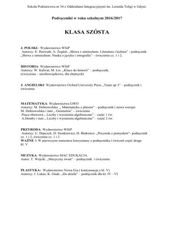 Szkoła Podstawowa nr 34 z Oddziałami Integracyjnymi im. Leonida Teligi w Gdyni. Podręczniki w roku szkolnym 2016/2017 KLASA SZÓSTA J. POLSKI.: Wydawnictwo WSiP Autorzy: E. Horwath, A. Żegleń: „Słowa z uśmiechem. Literatura i kultura” - podręcznik „Słowa z uśmiechem. Nauka o języku i ortografia” – ćwiczenia cz. 1 i 2. HISTORIA: Wydawnictwo WSiP Autorzy: W. Kalwat, M. Lis: ,,Klucz do historii” – podręcznik, (ćwiczenia – nieobowiązkowe, dla chętnych) J. ANGIELSKI: Wydawnictwo Oxford University Press ,,Team up 3” – podręcznik i ćwiczenia MATEMATYKA: Wydawnictwa GWO Autorzy: M. Dobrowolska „ Matematyka z plusem” – podręcznik ( nowa wersja) M. Dobrowolska i inni „ Geometria” – ćwiczenia Praca zbiorowa „ Liczby i wyrażenia algebraiczne” – część 1 ćw. A.Demby i inni „ Liczby i wyrażenia algebraiczne” – część 2 ćw. PRZYRODA: Wydawnictwo WSiP Autorzy: U. Depczyk, D. Sienkiewicz, H. Binkieicz: „Przyroda z pomysłem”- podręcznik cz. 1 i 2, ćwiczenia cz. 1 i 2 WAŻNE !: W pierwszym semestrze korzystamy z podręcznika i ćwiczeń część druga kl. V MUZYKA: Wydawnictwo MAC EDUKACJA Autor: T. Wójcik: „Muzyczny świat” – podręcznik i ćwiczenia PLASTYKA: Wydawnictwo Nowa Era ( kontynuacja z kl. V) Autorzy: J. Lukas, K. Onak: „Do dzieła” – podręcznik dla kl. IV - VI