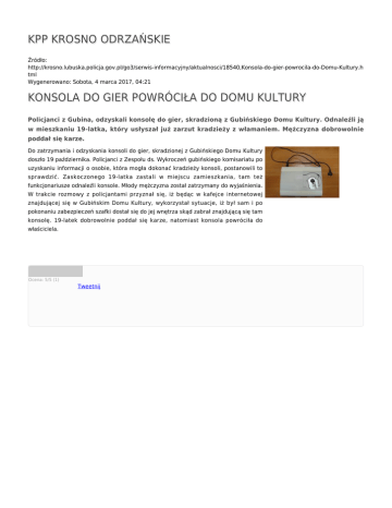 KPP KROSNO ODRZAŃSKIE Źródło: http://krosno.lubuska.policja.gov.pl/go3/serwis-informacyjny/aktualnosci/18540,Konsola-do-gier-powrocila-do-Domu-Kultury.h tml Wygenerowano: Sobota, 4 marca 2017, 04:21 KONSOLA DO GIER POWRÓCIŁA DO DOMU KULTURY Policjanci z Gubina, odzyskali konsolę do gier, skradzioną z Gubińskiego Domu Kultury. Odnaleźli ją w mieszkaniu 19-latka, który usłyszał już zarzut kradzieży z włamaniem. Mężczyzna dobrowolnie poddał się karze. Do zatrzymania i odzyskania konsoli do gier, skradzionej z Gubińskiego Domu Kultury doszło 19 października. Policjanci z Zespołu ds. Wykroczeń gubińskiego komisariatu po uzyskaniu informacji o osobie, która mogła dokonać kradzieży konsoli, postanowili to sprawdzić. Zaskoczonego 19-latka zastali w miejscu zamieszkania, tam też funkcjonariusze odnaleźli konsole. Młody mężczyzna został zatrzymany do wyjaśnienia. W trakcie rozmowy z policjantami przyznał się, iż będąc w kafejce internetowej znajdującej się w Gubińskim Domu Kultury, wykorzystał sytuacje, iż był sam i po pokonaniu zabezpieczeń szafki dostał się do jej wnętrza skąd zabrał znajdującą się tam konsolę. 19-latek dobrowolnie poddał się karze, natomiast konsola powróciła do właściciela. Ocena: 5/5 (1) Tweetnij