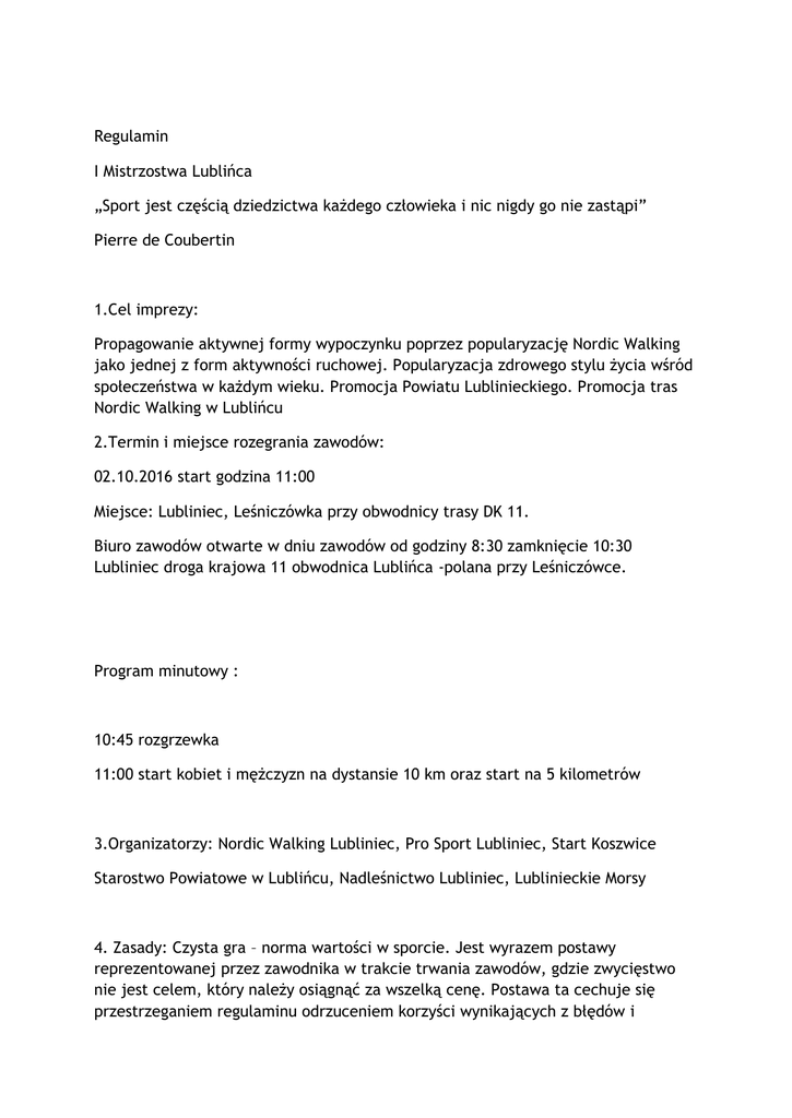 Regulamin I Mistrzostwa Lublińca „Sport jest częścią dziedzictwa każdego człowieka i nic nigdy go nie zastąpi” Pierre de Coubertin 1.Cel imprezy: Propagowanie aktywnej formy wypoczynku poprzez popularyzację Nordic Walking jako jednej z form aktywności ruchowej. Popularyzacja zdrowego stylu życia wśród społeczeństwa w każdym wieku. Promocja Powiatu Lublinieckiego. Promocja tras Nordic Walking w Lublińcu 2.Termin i miejsce rozegrania zawodów: 02.10.2016 start godzina 11:00 Miejsce: Lubliniec, Leśniczówka przy obwodnicy trasy DK 11. Biuro zawodów otwarte w dniu zawodów od godziny 8:30 zamknięcie 10:30 Lubliniec droga krajowa 11 obwodnica Lublińca -polana przy Leśniczówce. Program minutowy : 10:45 rozgrzewka 11:00 start kobiet i mężczyzn na dystansie 10 km oraz start na 5 kilometrów 3.Organizatorzy: Nordic Walking Lubliniec, Pro Sport Lubliniec, Start Koszwice Starostwo Powiatowe w Lublińcu, Nadleśnictwo Lubliniec, Lublinieckie Morsy 4. Zasady: Czysta gra – norma wartości w sporcie. Jest wyrazem postawy reprezentowanej przez zawodnika w trakcie trwania zawodów, gdzie zwycięstwo nie jest celem, który należy osiągnąć za wszelką cenę. Postawa ta cechuje się przestrzeganiem regulaminu odrzuceniem korzyści wynikających z błędów i niepowodzeń w trakcie trwania rywalizacji oraz różnego rodzaju oszustw sportowych. Sportowca przestrzegającego zasad fair play można poznać po godnym zachowaniu zarówno w wypadku zwycięstwa jak i porażki. Zawody Nordic Walking jest to przemieszczanie się ruchem naprzemiennym krokami do przodu, z zachowaniem stałego kontaktu z ziemią, w taki sposób że nie jest widoczna gołym okiem jednoczesna utrata kontaktu obu stóp z podłożem. Podbieganie, bieg i/lub skracanie trasy równa się karze przesunięcia w dół o jedną pozycję a w rażących przypadkach automatycznej dyskwalifikacji. W przypadku dyskwalifikacji opłata startowa nie zostaje zwrócona. Nad przestrzeganiem regulaminu będą czuwać sędziowie. Za nieprzestrzeganie zasad grozi: - ostrzeżenie -pierwsza żółta kartka - druga żółta kartka to 30 sekund na dystansie 5/6 km i 1 minuta na dystansie 10/12 km - trzecia żółta kartka dyskwalifikacja Za rażące naruszenie przepisów sędzia może pokazać czerwoną kartkę co jest jednoznaczne z dyskwalifikają. 4. Charakterystyka trasy: naturalne podłoże-dukty leśne- piasek, trawa, grys i niewielkie kamienie- trasa płaska. Start i meta na planie przy Leśniczówce. 5.Warunkiem uczestnictwa jest wniesienie opłaty on-line - przez system rozliczeń elektronicznych DotPay do którego przekierowana zostanie każda osoba w momencie zapisywania się na imprezę. W przypadku nie dokonania opłaty podczas procesu rejestracji można jej dokonać wchodząc na listę osób zapisanych. w kwocie: 40 tytuł wpłaty zgodnie z info z DotPay Osoby, które dokonają opłaty po dniu 30.09 i później prosimy zabrać kopię przelewu i przedstawić w biurze zawodów. 50 pln w dniu zawodów uiszczona w biurze zawodów oraz wypełnienie kart zgłoszeniowej i pobranie numerów startowych w dniu zawodów. Dzieci do 10 roku życia i osoby niepełnosprawne opłata 10 pln. 6. Klasyfikacja: Kategorie wiekowe : K-15 do 15 roku życia K-17 ( do 16-18 lat ), K-20 ( 18 – 29 lat ), K-30 ( 30 - 39 lat ), K-40 ( 40 - 49 lat ), K-50 ( 50 - 59 lat ), K-60 ( powyżej 60 lat ) Kategorie wiekowe : M-15 do 15 roku życia M-17 ( do 16-18 lat ), M-20 ( 18 – 29 lat ), M-30 ( 30 - 39 lat ), M-40 ( 40 - 49 lat ), M-50 ( 50 - 59 lat ), M-60 ( powyżej 60 lat ). Kategoria niepełnosprawnych miejsca 1 do 3 open i niesłyszących 1 do 3 open Nagrody: Miejsca 1 - 3 w każdej kategorii otrzymają puchar. Wszyscy zawodnicy otrzymają pamiątkowy medal, ciepły posiłek, oraz biorą udział w losowaniu nagród Organizator dla mieszkańców Lublińca przygotował dodatkowe nagrody i klasyfikację. 8.Organizator zapewnia: -ubezpieczenie NW dla uczestników zawodów -sędziów na trasie zawodów. -ratowników medycznych na trasie i punkt medyczny na start/meta. Wszystkie objawy złego samopoczucia w trakcie trwania imprezy należy zgłosić organizatorom lub służbom medycznym. -odpowiednie wytyczenie i zabezpieczenia trasy – zawody poprowadzi „zając”trasa oznaczona będzie pionowymi i poziomymi znakami-strzałki w kolorze zielonym, dodatkowo w miejscach newralgicznych na trasie będą osoby z obsługi. -przenośne toalety blisko biura zawodów -wypożyczalnię kijów- biuro zawodów -ograniczona ilość wypożyczenie kijów 10 pln -poczęstunku po imprezie, napój, kiełbaska, pomidor -medale dla wszystkich uczestników i puchary/statuetki dla zwycięzców w poszczególnych kat wiekowych. -puchary lub medale za miejsca od 1 do 3 we wszystkich kategoriach wiekowychdotyczy tylko zawodników startujących na 5/6 i 10-12 km. Dla zawodników niepełnosprawnych i niesłyszących na 5 km tylko kategoria open . -punkt żywieniowy na trasie około 2,5 kilometra oraz na start/meta. 9. Postanowienia końcowe -Młodzież –najmłodsi 10 lat do 18-go roku życia wymagana zgoda pisemna rodziców lub opiekuna prawnego. -Osoba pełnoletnia podpisuje oświadczenie startowe na karcie startowej -Zawody odbywają się bez względu na warunki atmosferyczne -Zawodnicy obowiązkowo muszą być oznakowani numerami startowymi umieszczonymi z przodu -Organizator dostarczy odpowiednią ilość numerów startowych -W zawodach mogą brać udział osoby bez przeciwwskazań lekarskich do uprawiania sportu wytrzymałościowego (Nordic Walking) -Ostateczna interpretacja regulaminu należy do Organizatora
