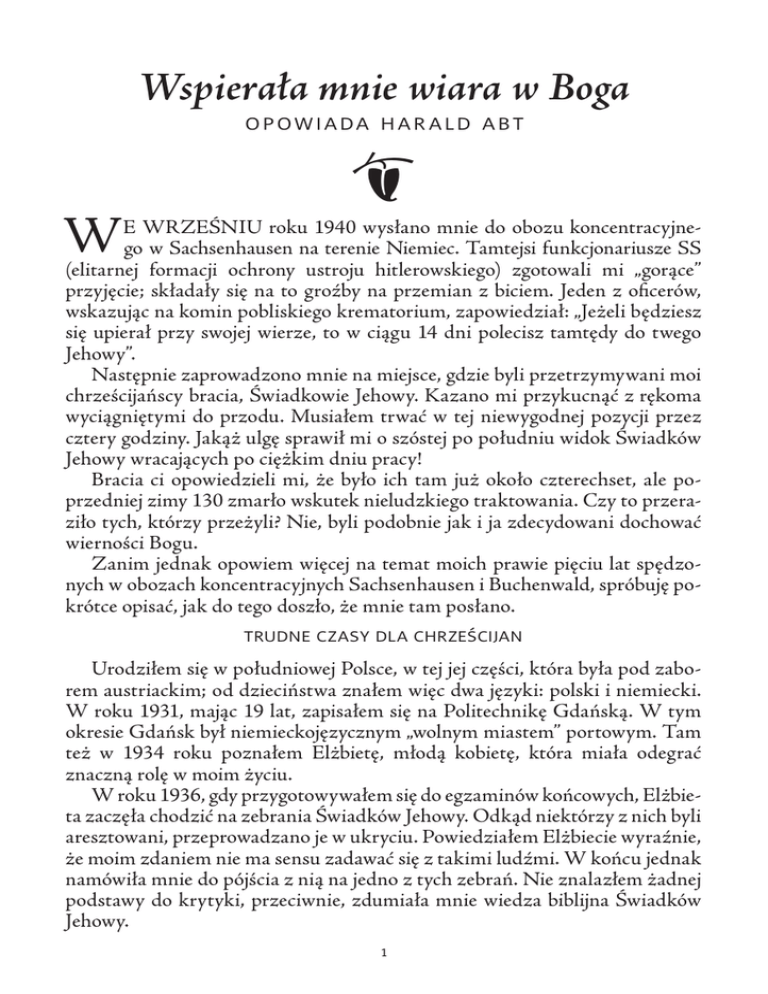 Wspierała mnie wiara w Boga opowiada har a ld abt W ) E WRZEŚNIU roku 1940 wysłano mnie do obozu koncentracyjnego w Sachsenhausen na terenie Niemiec. Tamtejsi funkcjonariusze SS (elitarnej formacji ochrony ustroju hitlerowskiego) zgotowali mi „gorące” przyjęcie; składały się na to groźby na przemian z biciem. Jeden z oficerów, wskazując na komin pobliskiego krematorium, zapowiedział: „Jeżeli będziesz się upierał przy swojej wierze, to w ciągu 14 dni polecisz tamtędy do twego Jehowy”. Następnie zaprowadzono mnie na miejsce, gdzie byli przetrzymywani moi chrześcijańscy bracia, Świadkowie Jehowy. Kazano mi przykucnąć z rękoma wyciągniętymi do przodu. Musiałem trwać w tej niewygodnej pozycji przez cztery godziny. Jakąż ulgę sprawił mi o szóstej po południu widok Świadków Jehowy wracających po ciężkim dniu pracy! Bracia ci opowiedzieli mi, że było ich tam już około czterechset, ale poprzedniej zimy 130 zmarło wskutek nieludzkiego traktowania. Czy to przeraziło tych, którzy przeżyli? Nie, byli podobnie jak i ja zdecydowani dochować wierności Bogu. Zanim jednak opowiem więcej na temat moich prawie pięciu lat spędzonych w obozach koncentracyjnych Sachsenhausen i Buchenwald, spróbuję pokrótce opisać, jak do tego doszło, że mnie tam posłano. trudne czasy dla chrześcijan Urodziłem się w południowej Polsce, w tej jej części, która była pod zaborem austriackim; od dzieciństwa znałem więc dwa języki: polski i niemiecki. W roku 1931, mając 19 lat, zapisałem się na Politechnikę Gdańską. W tym okresie Gdańsk był niemieckojęzycznym „wolnym miastem” portowym. Tam też w 1934 roku poznałem Elżbietę, młodą kobietę, która miała odegrać znaczną rolę w moim życiu. W roku 1936, gdy przygotowywałem się do egzaminów końcowych, Elżbieta zaczęła chodzić na zebrania Świadków Jehowy. Odkąd niektórzy z nich byli aresztowani, przeprowadzano je w ukryciu. Powiedziałem Elżbiecie wyraźnie, że moim zdaniem nie ma sensu zadawać się z takimi ludźmi. W końcu jednak namówiła mnie do pójścia z nią na jedno z tych zebrań. Nie znalazłem żadnej podstawy do krytyki, przeciwnie, zdumiała mnie wiedza biblijna Świadków Jehowy. 1 Mimo ukończenia studiów nie mogłem znaleźć dobrej posady w Polsce. Pomyślałem więc o wyjeździe za pracą do Niemiec. Elżbieta jednak oznajmiła: „Jeżeli pojedziesz, to beze mnie”. Świadkowie Jehowy byli w Niemczech już srogo prześladowani i nie chciała się narażać bez potrzeby. Zastanowiłem się nad tym głębiej i zacząłem bardziej systematycznie studiować Pismo Święte. Pobraliśmy się w czerwcu 1938 roku. Potem na początku roku 1939 oboje z Elzą zostaliśmy ochrzczeni, symbolizując w ten sposób nasze oddanie się Jehowie Bogu. Do tego czasu zdążyłem uzyskać dobrą pracę jako inżynier w zarządzie portu gdańskiego. Pięknie urządziliśmy sobie mieszkanie, które udostępnialiśmy na zebrania w celu studiowania Biblii. W tym okresie przechwytywano już w Gdańsku literaturę biblijną, nadsyłaną z polskiego biura oddziału Towarzystwa Strażnica w Łodzi. Doszedłem do przekonania, że powinienem w tej sprawie coś zrobić. Napisałem do braci w Łodzi list z propozycją, aby literaturę dostarczali na jakiś adres w pobliżu Gdańska. Razem z żoną będę ją zabierał stamtąd i przemycał do miasta. Elżbieta była wówczas w ciąży, a pod odzieniem miała nieraz do 100 egzemplarzy Strażnicy. Kiedyś celnik zażartował: „Chłopie, tobie chyba szykują się trojaczki!” Nie zdarzyło się jednak, żeby ją poddano rewizji osobistej. Przenoszenie literatury trwało do czasu, gdy 1 września 1939 roku Niemcy napadły na Polskę, po czym ograniczyły się możliwości przekraczania granicy miasta Gdańska. Dnia 24 września urodziła się nam córka Juta. oddawać cześć hitlerowi? Po poddaniu się garnizonu polskiego Niemcom mogłem powrócić do pracy. Kiedy wszedłszy powiedziałem „dzień dobry”, koledzy popatrzyli na mnie ze zdumieniem; teraz od każdego oczekiwano, żeby wołał: „Heil Hitler!” Poprosiłem o rozmowę z zastępcą dyrektora zarządu portu i wyjaśniłem mu, że jestem chrześcijaninem, wobec czego nie mogę nikogo w ten sposób pozdrawiać. Odparł mi: „Przecież ja też jestem chrześcijaninem”. Dodałem jednak, że jestem chrześcijaninem w ścisłym znaczeniu tego słowa i uważam za niestosowne, by tak oddawać cześć człowiekowi. Otrzymałem natychmiastowe zwolnienie z pracy, a do tego radę, że jeśli nie będę mówił „Heil Hitler”, niechybnie doigram się więzienia. Pod koniec września, gdy armia niemiecka zajęła Polskę, do Gdańska przyjechał Hitler. Na głównym placu wygłosił płomienną mowę z okazji zwycięstwa. Mieszkaliśmy całkiem blisko tego miejsca. Każdy miał w swoich oknach wywiesić flagi, lecz na zajmowanym przez nas piętrze budynku nie było ani jednej! Bracia podsunęli nam myśl, żebyśmy dla własnego bezpieczeństwa raczej wyjechali na wschodnie tereny Polski. 2 Oznaczało to bądź co bądź pozostawienie całego naszego dobytku. W miesiącu grudniu, mając ze sobą tylko walizkę, wózek dziecięcy i Jutę zawiniętą w poduszkę, wyruszyliśmy w tę daleką podróż. Pociągi były przepełnione i jeździły nieregularnie. Po pewnym czasie dotarliśmy do Łodzi i odnaleźliśmy dom, gdzie się mieściło biuro oddziału. Siostra, która otworzyła drzwi, zobaczywszy nieruchome dziecko na ręku Elżbiety, uciekła z płaczem. Po chwili wróciła i gdy zobaczyła, że dziecko się porusza, krzyknęła: „Ach, jednak żyje! Przecież żyje!” Dopiero wtedy zaprosiła nas do środka. Wiele dzieci uchodźców zamarzło wówczas na śmierć; dlatego pomyślała, że również Juta niestety umarła. aresztowanie i uwięzienie Mąż tej siostry był już zabrany do więzienia. Mieliśmy doprawdy ciężką zimę. Nie było nawet węgla, żeby ogrzać 