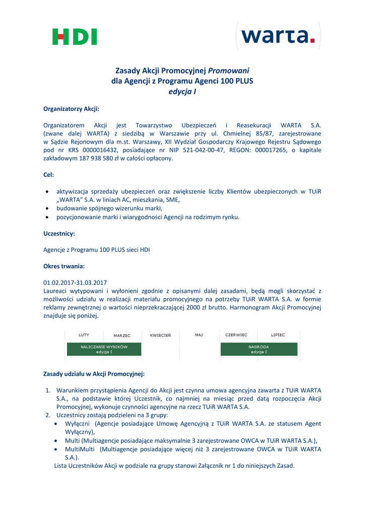 Zasady Akcji Promocyjnej Promowani dla Agencji z Programu Agenci 100 PLUS edycja I Organizatorzy Akcji: Organizatorem Akcji jest Towarzystwo Ubezpieczeń i Reasekuracji WARTA S.A. (zwane dalej WARTA) z siedzibą w Warszawie przy ul. Chmielnej 85/87, zarejestrowane w Sądzie Rejonowym dla m.st. Warszawy, XII Wydział Gospodarczy Krajowego Rejestru Sądowego pod nr KRS 0000016432, posiadające nr NIP 521-042-00-47, REGON: 000017265, o kapitale zakładowym 187 938 580 zł w całości opłacony. Cel: aktywizacja sprzedaży ubezpieczeń oraz zwiększenie liczby Klientów ubezpieczonych w TUiR „WARTA” S.A. w liniach AC, mieszkania, SME, budowanie spójnego wizerunku marki, pozycjonowanie marki i wiarygodności Agencji na rodzimym rynku. Uczestnicy: Agencje z Programu 100 PLUS sieci HDI Okres trwania: 01.02.2017-31.03.2017 Laureaci wytypowani i wyłonieni zgodnie z opisanymi dalej zasadami, będą mogli skorzystać z możliwości udziału w realizacji materiału promocyjnego na potrzeby TUiR WARTA S.A. w formie reklamy zewnętrznej o wartości nieprzekraczającej 2000 zł brutto. Harmonogram Akcji Promocyjnej znajduje się poniżej. Zasady udziału w Akcji Promocyjnej: 1. Warunkiem przystąpienia Agencji do Akcji jest czynna umowa agencyjna zawarta z TUiR WARTA S.A., na podstawie której Uczestnik, co najmniej na miesiąc przed datą rozpoczęcia Akcji Promocyjnej, wykonuje czynności agencyjne na rzecz TUiR WARTA S.A. 2. Uczestnicy zostają podzieleni na 3 grupy: Wyłączni (Agencje posiadające Umowę Agencyjną z TUiR WARTA S.A. ze statusem Agent Wyłączny), Multi (Multiagencje posiadające maksymalnie 3 zarejestrowane OWCA w TUiR WARTA S.A.), MultiMulti (Multiagencje posiadające więcej niż 3 zarejestrowane OWCA w TUiR WARTA S.A.). Lista Uczestników Akcji w podziale na grupy stanowi Załącznik nr 1 do niniejszych Zasad. 3. Zasady wyłaniania Laureatów Akcji: z możliwości udziału w realizacji materiału promocyjnego będzie mogło skorzystać 30 Laureatów (po 1 z każdej grupy z każdego Makroregionu Detalicznego), którzy osiągną najlepszy wynik pod względem nadwyżki przypisu księgowego w liniach AC, mieszkania, SME w stosunku do tego samego okresu roku 2016 w okresie naliczania wyników (01.02.2017-31.03.2017). Na podstawie wyników sprzedażowych utworzony zostanie Ranking Laureatów. 4. W przypadku gdy Laureat zrezygnuje z nagrody (informacja przesłana drogą elektroniczną przez odpowiedniego Regionalnego Menadżera Sprzedaży w ciągu 7 dni od ogłoszenia Laureatów), jego miejsce zajmuje kolejny Laureat z Rankingu w danej grupie w danym MD. 5. Ogłoszenie Laureatów, którzy będą mogli skorzystać z możliwości udziału w realizacji materiału promocyjnego na potrzeby TUiR WARTA S.A. w formie reklamy zewnętrznej nastąpi do dnia 25.04.2017 drogą elektroniczną. 6. TUiR Warta S.A. jako administrator danych osobowych informuje, że będą one przetwarzane w zakresie i celu niezbędnym do realizacji Akcji Edukacyjnej. Podanie danych (tj. uczestnictwo w Akcji) jest dobrowolne. Uczestnikowi Akcji przysługuje prawo dostępu do treści danych oraz prawo ich poprawiania.