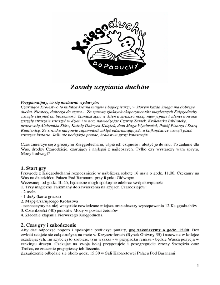 Zasady usypiania duchów Przypomnijmy, co się niedawno wydarzyło: Czarujące Królestwo to milutka kraina magów i bajkopisarzy, w którym każda księga ma dobrego ducha. Niestety, dobrego do czasu… Za sprawą głośnych eksperymentów magicznych Księgoduchy zaczęły cierpieć na bezsenność. Zamiast spać w dzień a straszyć nocą, niewyspane i zdenerwowane zaczęły strasznie straszyć w dzień i w noc, nawiedzając Czarny Zamek, Królewską Bibliotekę, pracownię Alchemika Słów, Kuźnię Dobrych Książek, dom Maga Wyobraźni, Pokój Pisarza i Starą Kamienicę. Ze strachu magowie zapomnieli zaklęć odstraszających, a bajkopisarze zaczęli pisać straszne historie. Jeśli nie nadejdzie pomoc, królestwu grozi katastrofa! Czas zmierzyć się z groźnymi Księgoduchami, uśpić ich czujność i ułożyć je do snu. To zadanie dla Was, drodzy Czarodzieje, czarujący i najlepsi z najlepszych. Tylko czy wystarczy wam sprytu, Mocy i odwagi? 1. Start gry Przygodę z Księgoduchami rozpoczniecie w najbliższą sobotę 16 maja o godz. 11.00. Czekamy na Was na dziedzińcu Pałacu Pod Baranami przy Rynku Głównym. Wcześniej, od godz. 10.45, będziecie mogli spokojnie odebrać swój ekwipunek: 1. Trzy magiczne Talizmany do zawieszenia na szyjach Czarodziejów: - 2 małe - 1 duży (karta gracza) 2. Mapę Czarującego Królestwa - zaznaczymy na niej wszystkie nawiedzane miejsca oraz obszary występowania 12 Księgoduchów 3. Czterdzieści (40) punktów Mocy w postaci żetonów 4. Zlecenie złapania Pierwszego Księgoducha. 2. Czas gry i zakończenie Aby dać odpocząć nogom i spokojnie podliczyć punkty, grę zakończymy o godz. 15.00. Bez zwłoki udajcie się całą drużyną na metę w Krzysztoforach (Rynek Główny 35) i ustawcie w kolejce oczekujących. Im szybciej to zrobicie, tym wyższa - w przypadku remisu - będzie Wasza pozycja w rankingu drużyn. Czekając na swoją kolej przygotujcie i posegregujcie żetony Szczęścia oraz Trofea, co znacznie przyspieszy ich liczenie. Zakończenie odbędzie się około godz. 15.30 w Sali Kabaretowej Pałacu Pod Baranami. 1 3. Czarujące Królestwo To niewielka baśniowa kraina wielkości mniej więcej krakowskiego Starego Miasta. Jej sercem jest Rynek Główny i położone w jego pobliżu 7 miejsc nawiedzanych przez Księgoduchy: 1. Czarny Zamek rządzony przez Czarną Królową i Czarnego Króla 2. Królewska Biblioteka zarządzana przez Bibliotekarzy 3. Pracownia Alchemika Słów (Alchemik i jego czeladnik) 4. Kuźnia Dobrych Książek (Kowal i Kowalowa Liter) 5. Dom Maga Wyobraźni (rodzina Magów - pan Mag i pani Maggi) 6. Pracownia Jubilerska prowadzona przez Złotnika Zdań 7. Stara Kamienica (zamieszkiwana przez Ostatniego Lokatora) Mieszkańcy tych miejsc znają sposoby, jak uśpić Księgoduchy, ale boją się wyjść. W każdym z miejsc od 1 do 5 znajdziecie sposoby na uśpienie 2 Księgoduchów, w miejscach 6 i 7 - tylko jednego. 4. Żetony Mocy Nie ma Czarodziejów bez Mocy. Punkty Mocy są walutą w grze, ale nie wliczają się do Waszego wyniku na koniec gry. To żetony z różdżką o nominałach 1 i 2. Płacicie nimi za swoje pomyłki. Na starcie otrzymacie 40 punktów Mocy (M). UWAGA! W każdej chwili gry drużyna musi mieć przynajmniej 1 punkt Mocy! O pokazanie tego punktu będą Was prosili mieszkańcy miejsc i Księgoduchy. Bez Mocy nie możecie wykonywać zadań. Oto kilka zasad korzystania z Mocy: 1. Ponieważ w świecie magii obowiązuje równowaga, Mocą płacicie za niewłaściwe wykonanie zadań. Na przykład jeśli za zadanie możecie dostać max 15 punktów Szczęścia, ale zasłużyliście tylko na 12, dostaniecie 12 punktów Szczęścia i zapłacicie 3 punkty Mocy - czyli dokładnie tyle, ilu punktów zabrakło Wam do maksymalnego wyniku. 2. Moc możecie stracić w przypadku złapania przez Księgoducha - jeśli nie uda Wam się rozwiązać jego zagadki, albo jeśli przegracie z nim w jakąś podstępną grę. 3. Jeśli usypiając Księgoducha wybierzecie niewłaściwy Eliksir (patrz niżej), Księgoduch zabierze Wam 5 punktów Mocy albo jeden z 3 otrzymanych na starcie Talizmanów (decyzja należy do Was). 4. Jeśli podczas zadania, usypiania ducha albo pojedynku z nim zabraknie Wam punktów Mocy do zapłacenia (pamiętajcie, że zawsze musicie mieć choć jeden i nie możecie go oddać!), wówczas za każdy brakujący punkt Mocy stracicie 2 punkty Szczęścia! 5. Jeśli brakuje Wam Mocy, przed zadaniem (nigdy w trakcie) możecie wymienić punkty Szczęścia na Moc w stosunku 1:1 w dowolnym z 7 miejsc Krainy opisanych wyżej. 6. Nigdy nie możecie wymieniać żetonów Mocy na żetony Szczęścia, bo jak wiadomo Szczęścia kupić nie można ☺ 5. Żetony Szczęścia W nagrodę za wykonanie zadań będziecie otrzymywać punkty Szczęścia. To żetony z czterolistną koniczyną, o nominałach 1, 3 i 5. 2 Za wykonanie zadań opisanych w każdej z 12 Instrukcji Usypiania (patrz niżej) możecie otrzymać max 15 punktów Szczęścia. Piękne zaśpiewanie Księgoduchowi kołysanki to dodatkowo max 5 punktów Szczęścia. Dodatkowo możecie otrzymać Premie: - za każdego uśpionego (złapanego) Księgoducha - 5 punktów Szczęścia (doliczymy je na koniec gry na podstawie Waszych Trofeów) - czyli łącznie max 60 punktów! - za zachowany do końca gry komplet 3 Talizmanów - 10 punktów Szczęścia (doliczymy je na koniec gry) Im więcej Szczęścia zgromadzicie, tym lepsze miejsce zajmiecie na koniec gry. 6. Księgoduchy Łącznie 12 (liczba 12 jest symbolem szczęścia, którego Wam życzymy). A oto one: - Skarpetkowiec - Klucznik - Duch Czasu - Duch Podziemi - Magik - Dżin - Duch Literatury - Jęcząca Marta (gościnnie) - Śpioch - Biała Pani - Truposz (w zastępstwie Czarnego Pana) - Duch Puszczy Odrzućcie przesądy - nie każdy duch musi dzwonić łańcuchami w prześcieradle, za to każdy Księgoduch ma charakterystyczny dla siebie atrybut - przedmiot po którym go rozpoznacie. Wszystkie - niewyspa