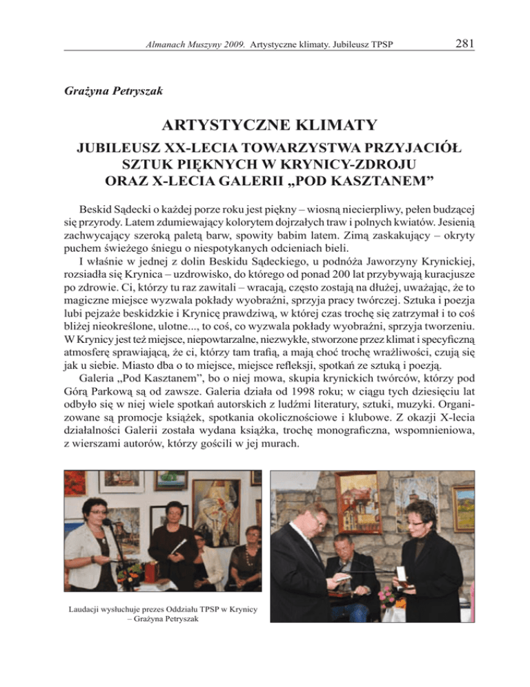 Almanach Muszyny 2009. Artystyczne klimaty. Jubileusz TPSP 281 Grażyna Petryszak ARTYSTYCZNE KLIMATY JUBILEUSZ XX-LECIA TOWARZYSTWA PRZYJACIÓŁ SZTUK PIĘKNYCH W KRYNICY-ZDROJU ORAZ X-LECIA GALERII „POD KASZTANEM” Beskid Sądecki o każdej porze roku jest piękny – wiosną niecierpliwy, pełen budzącej się przyrody. Latem zdumiewający kolorytem dojrzałych traw i polnych kwiatów. Jesienią zachwycający szeroką paletą barw, spowity babim latem. Zimą zaskakujący – okryty puchem świeżego śniegu o niespotykanych odcieniach bieli. I właśnie w jednej z dolin Beskidu Sądeckiego, u podnóża Jaworzyny Krynickiej, rozsiadła się Krynica – uzdrowisko, do którego od ponad 200 lat przybywają kuracjusze po zdrowie. Ci, którzy tu raz zawitali – wracają, często zostają na dłużej, uważając, że to magiczne miejsce wyzwala pokłady wyobraźni, sprzyja pracy twórczej. Sztuka i poezja lubi pejzaże beskidzkie i Krynicę prawdziwą, w której czas trochę się zatrzymał i to coś bliżej nieokreślone, ulotne..., to coś, co wyzwala pokłady wyobraźni, sprzyja tworzeniu. W Krynicy jest też miejsce, niepowtarzalne, niezwykłe, stworzone przez klimat i specyficzną atmosferę sprawiającą, że ci, którzy tam trafią, a mają choć trochę wrażliwości, czują się jak u siebie. Miasto dba o to miejsce, miejsce refleksji, spotkań ze sztuką i poezją. Galeria „Pod Kasztanem”, bo o niej mowa, skupia krynickich twórców, którzy pod Górą Parkową są od zawsze. Galeria działa od 1998 roku; w ciągu tych dziesięciu lat odbyło się w niej wiele spotkań autorskich z ludźmi literatury, sztuki, muzyki. Organizowane są promocje książek, spotkania okolicznościowe i klubowe. Z okazji X-lecia działalności Galerii została wydana książka, trochę monograficzna, wspomnieniowa, z wierszami autorów, którzy gościli w jej murach. Laudacji wysłuchuje prezes Oddziału TPSP w Krynicy – Grażyna Petryszak 282 Grażyna Petryszak Galeria dla krynickich twórców sztuki i literatury jest miejscem bardzo ważnym. To tutaj rodzą się pomysły wystaw, plenerów, imprez organizowanych przez Klub Twórczy. Galeria jest taka, jaką ukształtowali ją ludzie – malarze, rzeźbiarze, poeci oraz publiczność nieprzypadkowa, kochająca sztukę i piękno. Jak napisał we wstępie do książki pt.: Są takie miejsca Wojciech Kudyba: „Galeria, dojrzała…” Należy dodać, że Galeria znalazła już swoje stałe miejsce w pejzażu kulturalnym uzdrowiska i ma wpływ na jego koloryt i klimat. W roku 2008 Oddział Towarzystwa Przyjaciół Sztuk Pięknych w Krynicy-Zdroju obchodził Jubileusz XX-lecia działalności w uzdrowisku. To znaczące dla krynickiego środowiska twórczego, zwłaszcza gdy weźmie się pod uwagę działania, w które społecznie zaangażowani są artyści skupieni w Galerii „Pod Kasztanem” oraz sympatycy i wolontariusze. W ciągu 20 lat zorganizowano ponad 90 wystaw malarstwa i rzeźby, 75 spotkań ze sztuką i poezją, 14 plenerów malarskich. Artyści wzięli udział w ponad 50 różnych imprezach kulturalnych, konkursach malarskich, akcjach charytatywnych. Wydano 23 publikacje związane ze sztuką i literaturą – katalogi malarstwa i rzeźby, prospekty towarzyszące wystawom, książki poetyckie, karty pocztowe, w których promowano twórczość krynickich malarzy, rzeźbiarzy, poetów. Burmistrz Krynicy Emil Bodziony Almanach Muszyny 2009. Artystyczne klimaty. Jubileusz TPSP 283 Klub Twórczy nawiązuje kontakty artystyczne z ludźmi kultury i sztuki także poza Sądecczyzną, wymieniając doświadczenia. Organizowane plenery to przejaw potrzeby i chęci wspólnego działania artystów, możliwość integracji różnych środowisk twórczych, to chwila wytchnienia, ale też intensywnej pracy. Ogromnie ważne dla krynickiej artystycznej społeczności jest to, że ludzie w różnym wieku potrafią i chcą coś razem zrobić – realizując pomysły, spełniając marzenia artystyczne dają innym możliwość przeżywania sztuki, poezji czy muzyki. Z okazji XX-lecia została wydana Monografia zawierająca historię Oddziału, przedstawiająca twórców wraz z ich dziełami, oraz tableau ze zdjęciami obrazującymi dwudziestoletnią, bogatą działalność. Wiele instytucji i osób prywatnych przyczyniło się do tego sukcesu, należy tutaj wspomnieć m.in. Urząd Miejski w Krynicy-Zdroju, Przedsiębiorstwo Uzdrowisko Krynica-Żegiestów S.A., Spółdzielnię Pracy „Muszynianka”, Przedsiębiorstwo JasPol Poligrafia, Kolej Gondolową Jaworzyna Krynicka S.A., Małopolskie Biuro Wystaw Artystycznych w Nowym Sączu – Galeria w Krynicy, Muzeum Okręgowe w Nowym Sączu. W 2003 roku Oddział otrzymał Nagrodę Starosty Nowosądeckiego – Srebrne Jabłko Sądeckie – za działania w sferze kultury na Sądecczyźnie. W 2005 roku Kapituła Konkursu Marszałkowskiego „Kryształy Soli” wyróżniła krynicki Oddział TPSP w kategorii Kultura za inicjatywy podejmowane na rzecz dobra innych. W roku jubileuszowym 2008 burmistrz Krynicy-Zdroju przyznał nagrodę za osiągnięcia w dziedzinie kultury i pracę na rzecz uzdrowiska, starosta nowosądecki uhonorował Oddział Nagrodą Starostwa, natomiast minister kultury i dziedzictwa narodowego odznaczył go medalem „Zasłużony dla Kultury Polskiej”. Wszystkie zdjęcia – Andrzej Petryszak