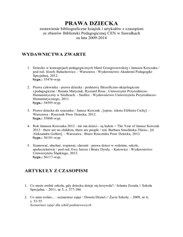 PRAWA DZIECKA zestawienie bibliograficzne książek i artykułów z czasopism ze zbiorów Biblioteki Pedagogicznej CEN w Suwałkach za lata 2009-2014 WYDAWNICTWA ZWARTE 1. Dziecko w koncepcjach pedagogicznych Marii Grzegorzewskiej i Janusza Korczaka / pod red. Józefy Bałachowicz. - Warszawa : Wydawnictwo Akademii Pedagogiki Specjalnej, 2012. Sygn.: 55476-wyp. 2. Prawa człowieka - prawa dziecka : podstawy filozoficzno-aksjologiczne i pedagogiczne / Renata Matysiuk, Ryszard Rosa ; Uniwersytet PrzyrodniczoHumanistyczny w Siedlcach. - Siedlce : Wydawnictwo Uniwersytetu PrzyrodniczoHumanistycznego, 2011. Sygn.: 54595-wyp. 3. Prawo dziecka do szacunku / Janusz Korczak ; [oprac. tekstu Elżbieta Cichy]. Warszawa : Rzecznik Praw Dziecka, 2012. Sygn.: 55868-wyp. 4. Rok Janusza Korczaka 2012 : nie ma dzieci - są ludzie = The Year of Janusz Korczak 2012 : there are no children, there are people / red. Barbara Smolińska-Theiss ; [tł. Aleksandra Gellert]. - Warszawa : Biuro Rzecznika Praw Dziecka, 2013. Sygn.: 56181-wyp. 5. Szanować, słuchać, wspierać, chronić : prawa dzieci w rodzinie, szkole, społeczeństwie / pod red. Ewy Jarosz i Beaty Dyrdy. - Katowice : Wydawnictwo Uniwersytetu Śląskiego, 2013. Sygn.: 56117-wyp. ARTYKUŁY Z CZASOPISM 1. Co może zrobić szkoła, gdy dziecku dzieje się krzywda? / Jolanta Zozula.// Szkoła Specjalna. - 2011, nr 5, s. 377-386 2. Co nam wolno... : scenariusz zajęć / Dorota Demel.// Życie Szkoły. - 2009, nr 6, s. 53-55 Scenariusz zajęć dla szkół podstawowych. 3. Co zrobić, gdy NFZ nie chce sfinansować leczenia dziecka? / Jolanta Zozula.// Szkoła Specjalna. - 2010, nr 3, s. 226-230 4. Czy uczyć znajomości praw człowieka i praw dziecka w szkole podstawowej? / Lidia Wojtaszewska.// Dyrektor Szkoły. - 2007, nr 10, s. 22-23 5. Czy w Polsce można bić dzieci? / Mirosław Kaczmarek.// Remedium. - 2009, nr 1, s. 18-19 6. Dzieci i dzieciństwo na przestrzeni dziejów / Jadwiga Raczkowska.// Problemy Opiekuńczo Wychowawcze. - R. 50, nr 7 (2010), s. 45-56 7. Dzieci za kratami w Pakistanie / Joanna Mirosława Dąbrowska.// Opieka, Wychowanie, Terapia. - 2007, nr 3/4, s. 9-13 Prawa dziecka w Pakistanie. 8. Dzieci żyjące z HIV/AIDS a szkoła / Magdalena Gwizdak.// Remedium. - 2010, nr 10, s. 26-27 Sytuacja prawna dziecka zakażonego. 9. Jak najmniej złych dorosłych / Witold Salański.// Głos Nauczycielski. - R. 95, nr 50 (2012), s. 11 Konferencja "Prawo dziecka do szacunku - wyzwania XXI wieku". 10. Jak realizować prawa najmłodszych dzieci do rozwoju i partycypacji - doświadczenia Fundacji Komeńskiego / Anna Blumsztajn.// Polityka Społeczna. - R. 36, nr 9 (2009), s. 67-69 11. Każde dziecko ma prawo do radosnego życia... / Izabela Pilarczyk-Wojciechowska.// Wychowanie w Przedszkolu. - 2013, nr 6, s. 26-28 Scenariusze zajęć dla przedszkoli. 12. Korczakowska idea praw dziecka / Barbara Smolińska-Theiss.// Pedagogika Społeczna. - 2010, nr 3/4, s. 7-19 13. Mechanizmy monitorowania praw dziecka w Polsce. Cz. 1 / Mirosław Kaczmarek.// Remedium. - 2011, nr 7/8, s. 38-39 14. Mechanizmy monitorowania praw dziecka w Polsce. Cz. 2 / Mirosław Kaczmarek.// Remedium. - 2011, nr 9, s. 18-20 15. Monitorowanie praw dziecka w Polsce. Cz. 3 / Mirosław Kaczmarek.// Remedium. 2011, nr 10, s. 18-19 16. Nasze prawa : scenariusz zajęć / Lidia Wojtaszewska.// Życie Szkoły. - 2009, nr 6, s. 17-21 Scenariusz zajęć do nauczania początkowego. 17. Nie krzywdź : jak w Polsce przestrzegane są prawa dzieci? Czy skutecznie chronimy najmłodszych przed ich naruszaniem? / Halina Drachal.// Głos Nauczycielski. - R. 94, nr 44 (2011), s. 10 18. O prawach małych dzieci wychowywanych poza rodziną / Maria Kolankiewicz.// Problemy Opiekuńczo-Wychowawcze. - 2012, nr 5, s. 3-9 19. [Ochrona dzieci przed krzywdzeniem : perspektywa globalna i lokalna - recenzja] / Monika Czyżewska.// Pedagogika Społeczna. - R. 8, nr 3/4 (2009), s. 143-146 Zawiera rec. książki: Ochrona dzieci przed krzywdzeniem : perspektywa globalna i lokalna / Ewa Jarosz. - Katowice, 2008. 20. Pan był dziś taki zły / Janusz Korczak.// Głos Nauczycielski. - 2012, nr 6, s. 12 Artykuł J. Korczaka z 6. numeru "Głosu Nauczycielskiego" z 1919 r. 21. Poszanowanie praw dziecka - między oficjalnym zakazem a akceptacją bicia dzieci / Ewa Jarosz.// Pedagogika Społeczna. - R. 12, nr 4 (2013), s. 29-44 22. Prawa człowieka, prawa dziecka / Eugenia Mathea.// Wychowanie w Przedszkolu. 2012, nr 4, s. 24-27 Scenariusz zajęć dla przedszkoli. 23. [Prawa dziecka : konteksty prawne i pedagogiczne - recenzja] / Olga Brążkowska.// Pedagogika Społeczna. - 2012, nr 4, s. 119-124 Zawiera rec. książki: Prawa dziecka : konteksty prawne i pedagogiczne. - Poznań, 2012. 24. Prawa dziecka - teoria i praktyka / Małgorzata Narożnik.// Wychowanie w Przedszkolu. – 2012, nr 5, s. 71-73 25. Prawa dziecka a dobro dziecka / Zenon Grocholewski.// Wychowawca. - 2009, nr 3, s. 5-9 26. Prawa dziecka i ucznia w szkole : status prawny dziecka i ucznia określają przepisy międzynarodowe, państwowe i szkolne / Dariusz Skrzyński.// Biblioteka w Szkole. 2013, nr 3, s. 11-14 27. Prawa procesowe dziecka. Cz. 1 / Mirosław Kaczmarek.// Remedium. - 2013, nr 5, s. 23-25 28. Prawa procesowe dziecka. Cz. 2 / Mirosław Kaczmarek.// Remedium. - 2013, nr 7/8, s. 28-30 29. Prawa ucznia / Jacek Urban.// Wychowawca. - 2013, nr 4, s. 24-25 30. Prawo dziecka do głosu / Tatiana Kłosińska.// Życie Szkoły. - 2009, nr 6, s. 5-11 31. Realizacja prawa dziecka do wychowania się w rodzinie w Polsce / Jolanta Zozula.// Szkoła Specjalna. - 2013, nr 4, s. 298-307 32. Szanujemy swoje prawa / Anna Pniewska.// Wychowanie w Przedszkolu. - 2010, nr 10, s. 40-41 Scenariusz zajęć dla przedszkoli. 33. U króla Maciusia I / Agnieszka Bardadyn.// Wychowanie w Przedszkolu. - 2013, nr 2, s. 41-42 Scenariusz zajęć dla przedszkoli. 34. W obronie praw dziecka do życia i rozwoju : deklaracja Stowarzyszenia Obrońców Praw Człowieka / Regina Pawł