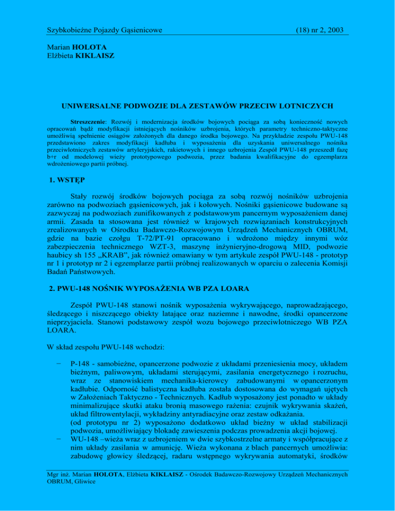 Szybkobieżne Pojazdy Gąsienicowe (18) nr 2, 2003 Marian HOLOTA Elżbieta KIKLAISZ UNIWERSALNE PODWOZIE DLA ZESTAWÓW PRZECIW LOTNICZYCH Streszczenie: Rozwój i modernizacja środków bojowych pociąga za sobą konieczność nowych opracowań bądź modyfikacji istniejących nośników uzbrojenia, których parametry techniczno-taktyczne umożliwią spełnienie osiągów założonych dla danego środka bojowego. Na przykładzie zespołu PWU-148 przedstawiono zakres modyfikacji kadłuba i wyposażenia dla uzyskania uniwersalnego nośnika przeciwlotniczych zestawów artyleryjskich, rakietowych i innego uzbrojenia Zespół PWU-148 przeszedł fazę b+r od modelowej wieży prototypowego podwozia, przez badania kwalifikacyjne do egzemplarza wdrożeniowego partii próbnej. 1. WSTĘP Stały rozwój środków bojowych pociąga za sobą rozwój nośników uzbrojenia zarówno na podwoziach gąsienicowych, jak i kołowych. Nośniki gąsienicowe budowane są zazwyczaj na podwoziach zunifikowanych z podstawowym pancernym wyposażeniem danej armii. Zasada ta stosowana jest również w krajowych rozwiązaniach konstrukcyjnych zrealizowanych w Ośrodku Badawczo-Rozwojowym Urządzeń Mechanicznych OBRUM, gdzie na bazie czołgu T-72/PT-91 opracowano i wdrożono między innymi wóz zabezpieczenia technicznego WZT-3, maszynę inżynieryjno-drogową MID, podwozie haubicy sh 155 „KRAB”, jak również omawiany w tym artykule zespół PWU-148 - prototyp nr 1 i prototyp nr 2 i egzemplarze partii próbnej realizowanych w oparciu o zalecenia Komisji Badań Państwowych. 2. PWU-148 NOŚNIK WYPOSAŻENIA WB PZA LOARA Zespół PWU-148 stanowi nośnik wyposażenia wykrywającego, naprowadzającego, śledzącego i niszczącego obiekty latające oraz naziemne i nawodne, środki opancerzone nieprzyjaciela. Stanowi podstawowy zespół wozu bojowego przeciwlotniczego WB PZA LOARA. W skład zespołu PWU-148 wchodzi: − − P-148 - samobieżne, opancerzone podwozie z układami przeniesienia mocy, układem bieżnym, paliwowym, układami sterującymi, zasilania energetycznego i rozruchu, wraz ze stanowiskiem mechanika-kierowcy zabudowanymi w opancerzonym kadłubie. Odporność balistyczna kadłuba została dostosowana do wymagań ujętych w Założeniach Taktyczno - Technicznych. Kadłub wyposażony jest ponadto w układy minimalizujące skutki ataku bronią masowego rażenia: czujnik wykrywania skażeń, układ filtrowentylacji, wykładziny antyradiacyjne oraz zestaw odkażania. (od prototypu nr 2) wyposażono dodatkowo układ bieżny w układ stabilizacji podwozia, umożliwiający blokadę zawieszenia podczas prowadzenia akcji bojowej. WU-148 –wieża wraz z uzbrojeniem w dwie szybkostrzelne armaty i współpracujące z nim układy zasilania w amunicję. Wieża wykonana z blach pancernych umożliwia: zabudowę głowicy śledzącej, radaru wstępnego wykrywania automatyki, środków Mgr inż. Marian HOLOTA, Elżbieta KIKLAISZ - Ośrodek Badawczo-Rozwojowy Urządzeń Mechanicznych OBRUM, Gliwice Marian HOLOTA, Elżbieta KIKLAISZ wizyjnych i bogatego wyposażenia elektronicznego. W wieży znajdują się stanowiska dowódcy zestawu i działonowego. Wieża posiada również wykładziny antyradiacyjne, system ostrzegania i zapobiegania promieniowaniu laserowemu, układy przeciwpożarowy i przeciwwybuchowy, układ hydrauliki siłowej i inne. Rys.1. Widok ogólny WB PZA - LOARA 3. FAZA BADAWCZO-ROZWOJOWA ZESPOŁU PWU-148 W ramach fazy b+r w kolejnych rozwiązaniach w Ośrodku Badawczo-Rozwojowym Urządzeń Mechanicznych Obrum opracowano zestawy w skład, których wchodziły: wieża modelowa z podwoziem prototypowym, wieża prototypowa z podwoziem zmodernizowanym. Wieża modelowa posiadała w swej tylnej części zabudowany agregat prądotwórczy. Służyła ona do celów poznawczych. Zabudowana była na klasycznym podwoziu czołgu T-72M1, w którym zmiany dotyczyły grubości pancerza kadłuba i umiejscowienia stanowiska mechanika-kierowcy. Zestaw ten, po badaniach służy w chwili obecnej jako model przeciwlotniczego zestawu rakietowego. Wykorzystanie go do dalszych prac wdrożeniowych okazało się niemożliwe, z uwagi na brak miejsca na zabudowę układów decydujących o głównych walorach bojowych. PWU-148 nośnik wyposażenia WB PZA LOARA 4. WIEŻA PROTOTYPOWA Z PODWOZIEM ZMODERNIZOWANYM ZESPOŁU PWU-148. W latach 1999-2000 w Ośrodku Badawczo-Rozwojowym Urządzeń Mechanicznych OBRUM opracowano dokumentację konstrukcyjną oraz wykonano drugą wersję prototypowego podwozia dla zabudowy wieży z przeciwlotniczym zestawem artyleryjskim. Wieża tego rozwiązania posiadała już docelowe ukompletowanie w układy wyposażenia wykrywającego, śledzącego, naprowadzającego i niszczącego obiekty latające. Wieża ta, w odróżnieniu od poprzedniej, nie posiadała w swej zabudowie agregatu prądotwórczego, który przeniesiony został do podwozia w część nadbłotnikową tylnej części kadłuba. Dla spełnienia oczekiwań zamawiającego, zawartych w wymaganiach technicznych, jako bazę dla opracowania projektu technicznego przyjęto zespoły i części z wyrobu podstawowego znajdującego się na wyposażeniu wojska, tj. czołgu średniego T-72M1. Przyjęcie takiej bazy, poza unifikacją, obejmuje także sferę wytwarzania i upraszcza również: − procesy szkoleniowe mechaników kierowców i ekip remontowych, − zabezpieczenie zaopatrywania w części zamienne i zapasowe oraz materiały pędne i smarowe. Wymienione powyżej uwarunkowania logistyczne podnoszą walory eksportowe wyrobu finalnego na rynkach obcych, w których wdrożona jest technologia T-72. Specyficznymi rozwiązaniami w tym podwoziu są między innymi: (a) Kadłub, którego konstrukcja umożliwia między innymi: − zabudowę autonomicznego modelu wieży z napędami w azymucie i blokami sterującymi napędem, − instalację aparatury 54 V we wnękach usytuowanych na półkach nad gąsienicami, − zabudowę modułu agregatu prądotwórczego dla instalacj