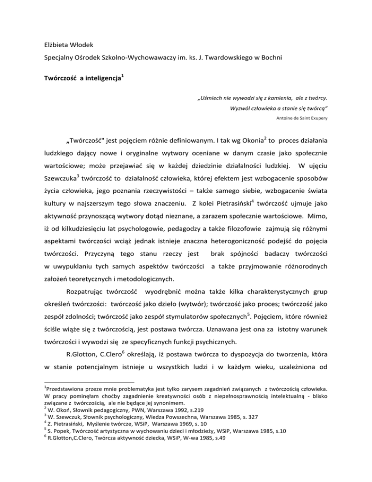 Elżbieta Włodek Specjalny Ośrodek Szkolno-Wychowawaczy im. ks. J. Twardowskiego w Bochni Twórczość a inteligencja1 „Uśmiech nie wywodzi się z kamienia, ale z twórcy. Wyzwól człowieka a stanie się twórcą” Antoine de Saint Exupery „Twórczość" jest pojęciem różnie definiowanym. I tak wg Okonia2 to proces działania ludzkiego dający nowe i oryginalne wytwory oceniane w danym czasie jako społecznie wartościowe; może przejawiać się w każdej dziedzinie działalności ludzkiej. W ujęciu Szewczuka3 twórczość to działalność człowieka, której efektem jest wzbogacenie sposobów życia człowieka, jego poznania rzeczywistości – także samego siebie, wzbogacenie świata kultury w najszerszym tego słowa znaczeniu. Z kolei Pietrasiński4 twórczość ujmuje jako aktywność przynoszącą wytwory dotąd nieznane, a zarazem społecznie wartościowe. Mimo, iż od kilkudziesięciu lat psychologowie, pedagodzy a także filozofowie zajmują się różnymi aspektami twórczości wciąż jednak istnieje znaczna heterogoniczność podejść do pojęcia twórczości. Przyczyną tego stanu rzeczy jest brak spójności badaczy twórczości w uwypuklaniu tych samych aspektów twórczości a także przyjmowanie różnorodnych założeń teoretycznych i metodologicznych. Rozpatrując twórczość wyodrębnić można także kilka charakterystycznych grup określeń twórczości: twórczość jako dzieło (wytwór); twórczość jako proces; twórczość jako zespół zdolności; twórczość jako zespół stymulatorów społecznych5. Pojęciem, które również ściśle wiąże się z twórczością, jest postawa twórcza. Uznawana jest ona za istotny warunek twórczości i wywodzi się ze specyficznych funkcji psychicznych. R.Glotton, C.Clero6 określają, iż postawa twórcza to dyspozycja do tworzenia, która w stanie potencjalnym istnieje u wszystkich ludzi i w każdym wieku, uzależniona od 1 Przedstawiona przeze mnie problematyka jest tylko zarysem zagadnień związanych z twórczością człowieka. W pracy pominęłam choćby zagadnienie kreatywności osób z niepełnosprawnością intelektualną - blisko związane z twórczością, ale nie będące jej synonimem. 2 W. Okoń, Słownik pedagogiczny, PWN, Warszawa 1992, s.219 3 W. Szewczuk, Słownik psychologiczny, Wiedza Powszechna, Warszawa 1985, s. 327 4 Z. Pietrasiński, Myślenie twórcze, WSiP, Warszawa 1969, s. 10 5 S. Popek, Twórczość artystyczna w wychowaniu dzieci i młodzieży, WSiP, Warszawa 1985, s.10 6 R.Glotton,C.Clero, Twórcza aktywność dziecka, WSiP, W-wa 1985, s.49 Elżbieta Włodek, Twórczość a inteligencja środowiska społeczno-kulturalnego. Zatem, w korzystnych warunkach środowiskowych (rodzinnych, edukacyjnych, rehabilitacyjnych) osoby niepełnosprawne umysłowo mogą wykształcać twórcze postawy. Odmienny w tej kwestii pogląd zaprezentował Paul Torrance. Sformułowana przez niego tzw. „hipoteza progu”, zakładała konieczność zaistnienia granicznej wartości ilorazu inteligencji, warunkującej możliwości twórcze człowieka. Ustalono, że wartość tego progu wynosi około 110 jednostek ilorazu. Zatem, osoby niepełnosprawne nie osiągając koniecznego do zaistnienia twórczości poziomu intelektualnego uznać należałoby za „niezdolne do twórczości”. Pogląd powyższy wzbudza wiele kontrowersji, wiadomo bowiem, iż w procesy twórcze zaangażowane są w dużej mierze czynniki pozaintelektualne związane z osobowością, emocjonalnością czy też sferą motywacyjną człowieka. Tak więc odwoływanie się jedynie do czynnika intelektualnego skazane jest na niepowodzenie. Co więcej, psychologia coraz częściej podkreśla, iż inteligencja i twórczość nie są synonimami a związki między tymi dwoma obszarami intelektualnego funkcjonowania są słabe lub co najwyżej umiarkowane7. Toteż w odniesieniu do osób niepełnosprawnych umysłowo można mówić o możliwości równoważenia deficytów intelektualnych określonymi cechami osobowości a także właściwymi wpływami otoczenia. Ciekawą propozycję twórczości - z punktu możliwości twórczych osób z niepełnosprawnością intelektualną zaprezentował Edward Nęcka8, który szeroko zajmował się psychologią twórczości. Wyróżnił on cztery poziomy twórczości: twórczość płynną, skrystalizowaną, dojrzałą i wybitną. Szczególnego znaczenia w kontekście rozpatrywanej problematyki nabiera twórczość płynna oznaczająca zdolność do wytwarzania pomysłów, pewien potencjał do działania twórczego. Zdolność ta jest powszechna, każdy człowiek ją posiada, choć w różnym stopniu. Na jej poziomie dzieło nie jest niezbędne – można być osobą twórczą nie stworzywszy niczego nowego. Można więc uznać, iż osoby z niepełnosprawnością intelektualną znajdują się na etapie twórczości płynnej, gdyż normalny rozkład w populacji sprawia, iż można oczekiwać pewnego poziomu nasilenia takiej cechy również w ich przypadku9. 7 M.Karwowski, Kreatywność, twórczość, czy permanentna transgresja? Uwagi o aktywności osób niepełnosprawnych intelektualnie z perspektywy psychologii twórczości, w: Kreatywność osób z niepełnosprawnością intelektualną – czy umiemy myśleć inaczej?, red. J.Głodkowska, A.Giryński, Akapit, Kraków 2009, s.14 8 E. Nęcka, Psychologia twórczości, GWP, Gdańsk 2001 9 M.Karwowski, Kreatywność…, s.12 Elżbieta Włodek, Twórczość a inteligencja Rozpatrując powyższą problematykę warto również odnieść się do transgresyjnej koncepcji człowieka Józefa Kozieleckiego10, która jest bardzo przydatna do analizy funkcjonowania omawianej grupy osób. Otóż koncepcja ta zakłada, iż człowiek jest względnie wewnątrzsterownym bytem, którego naturalnym dążeniem jest ciągły rozwój czyli przekraczania granic umysłowych, fizycznych, mentalnych czy też społecznych. Analizując różnorodne aspekty funkcjonowania osób z dys
