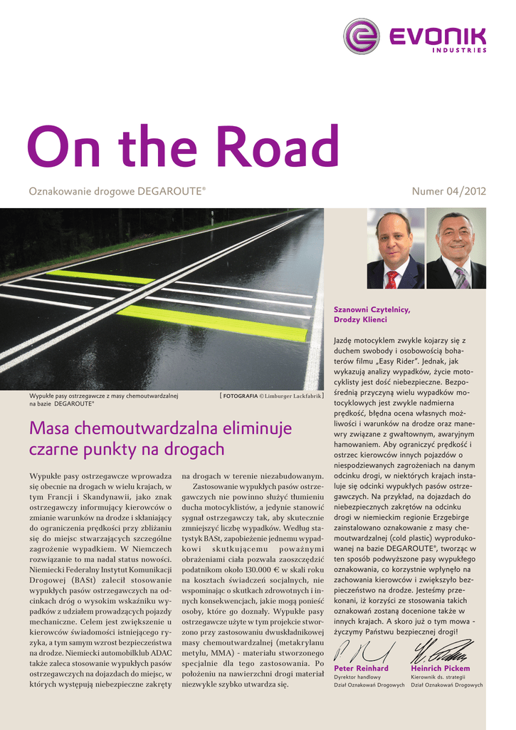 On the Road Oznakowanie drogowe DEGAROUTE® Numer 04/2012 Szanowni Czytelnicy, Drodzy Klienci Wypukłe pasy ostrzegawcze z masy chemoutwardzalnej na bazie DEGAROUTE® [ Fotografia © Limburger Lackfabrik ] Masa chemoutwardzalna eliminuje czarne punkty na drogach Wypukłe pasy ostrzegawcze wprowadza się obecnie na drogach w wielu krajach, w tym Francji i Skandynawii, jako znak ostrzegawczy informujący kierowców o zmianie warunków na drodze i skłaniający do ograniczenia prędkości przy zbliżaniu się do miejsc stwarzających szczególne zagrożenie wypadkiem. W Niemczech rozwiązanie to ma nadal status nowości. Niemiecki Federalny Instytut Komunikacji Drogowej (BASt) zalecił stosowanie wypukłych pasów ostrzegawczych na odcinkach dróg o wysokim wskaźniku wypadków z udziałem prowadzących pojazdy mechaniczne. Celem jest zwiększenie u kierowców świadomości istniejącego ryzyka, a tym samym wzrost bezpieczeństwa na drodze. Niemiecki automobilklub ADAC także zaleca stosowanie wypukłych pasów ostrzegawczych na dojazdach do miejsc, w których występują niebezpieczne zakręty na drogach w terenie niezabudowanym. Zastosowanie wypukłych pasów ostrzegawczych nie powinno służyć tłumieniu ducha motocyklistów, a jedynie stanowić sygnał ostrzegawczy tak, aby skutecznie zmniejszyć liczbę wypadków. Według statystyk BASt, zapobieżenie jednemu wypadkow i sk utk ującemu poważnymi obrażeniami ciała pozwala zaoszczędzić podatnikom około 130.000 € w skali roku na kosztach świadczeń socjalnych, nie wspominając o skutkach zdrowotnych i innych konsekwencjach, jakie mogą ponieść osoby, które go doznały. Wypukłe pasy ostrzegawcze użyte w tym projekcie stworzono przy zastosowaniu dwuskładnikowej masy chemoutwardzalnej (metakrylanu metylu, MMA) - materiału stworzonego specjalnie dla tego zastosowania. Po położeniu na nawierzchni drogi materiał niezwykle szybko utwardza się. Jazdę motocyklem zwykle kojarzy się z duchem swobody i osobowością boha terów filmu „Easy Rider”. Jednak, jak wykazują analizy wypadków, życie moto cyklisty jest dość niebezpieczne. Bezpo średnią przyczyną wielu wypadków mo tocyklowych jest zwykle nadmierna prędkość, błędna ocena własnych moż liwości i warunków na drodze oraz mane wry związane z gwałtownym, awaryjnym hamowaniem. Aby ograniczyć prędkość i ostrzec kierowców innych pojazdów o niespodziewanych zagrożeniach na danym odcinku drogi, w niektórych krajach insta luje się odcinki wypukłych pasów ostrze gawczych. Na przykład, na dojazdach do niebezpiecznych zakrętów na odcinku drogi w niemieckim regionie Erzgebirge zainstalowano oznakowanie z masy che moutwardzalnej (cold plastic) wyproduko wanej na bazie DEGAROUTE®, tworząc w ten sposób podwyższone pasy wypukłego oznakowania, co korzystnie wpłynęło na zachowania kierowców i zwiększyło bez pieczeństwo na drodze. Jesteśmy prze konani, iż korzyści ze stosowania takich oznakowań zostaną docenione także w innych krajach. A skoro już o tym mowa życzymy Państwu bezpiecznej drogi! Peter Reinhard Dyrektor handlowy Dział Oznakowań Drogowych Heinrich Pickem Kierownik ds. strategii Dział Oznakowań Drogowych 2 on the road on the road 2 Pasy ostrzegawcze zmniejszyły zagrożenie na niebezpiecznych zakrętach Ostry zakręt na drodze K9107 [ Dane z Google Maps 2012 © Google] Ostry zakręt na odcinku drogi prowadzącej do popularnego miejsca spotkań motocyklistów w Eibenstock w Górach Erz to miejsce, w którym w latach 2007-2009 wydarzyło się dwanaście wypadków - każdy z udziałem motocyklistów. W ich wyniku siedem osób odniosło poważne obrażenia ciała, zaś dziewięć - mniejsze urazy. Według komisji badania wypadków dla tego regionu przyczyną większości wypadków była nadmierna prędkość. W lipcu 2009 r. zastosowano środki służące zmniejszeniu ryzyka wypadku na nawrocie stanowiącym prawdziwy magnes dla motocyklistów. Wspomniane środki polegały na wycięciu 2-centymetrowych bruzd w asfaltowej nawierzchni na ośmiu odcinkach serpentyny. Bruzdy spowodowały, iż nierówna nawierzchnia stanowiła dla użytkowników drogi sygnał ostrzegawczy, by prowadzić ostrożniej. Od czasu wspomnianej instalacji nie zgłoszono ani jednego wypadku. Projekt dowodzi, iż wyczuwalne oznakowanie nawierzchni drogowej jest skutecznym sposobem ograniczania liczby wypadków i ostrzeżeniem dla kierowców o zmieniających się warunkach drogowych w miejscach, w których konieczne jest wykazanie nadzwyczajnej uwagi. Gdy wspomniany odcinek drogi poddano remontowi, w trakcie którego usunięto wcześniej przygotowaną nawierzchnię, eksperci od bezpieczeństwa ruchu drogowego wpadli na nowatorski, lecz równie skuteczny sposób, niewymagający wycinania bruzd ani niszczenia świeżo położonej asfaltowej nawierzchni. Rozwiązaniem było położenie na obu dojazdach do zakrętu wypukłych pasów ostrzegawczych, zmuszając tym samym kierowców do ograniczenia prędkości. 450-milimetrowe pasy zwiększają bezpieczeństwo na zakrętach W ramach modelowych testów BASt poziome pasy ostrzegawcze o wysokim profilu położono w poprzek nawierzchni drogowej na dojazdach do niebezpiecznego zakrętu. Oznakowanie na bazie masy chemoutwardzalnej ułożono na dwa różne sposoby. Pierwszym był pas ostrzegawczy o szerokości 450 mm zabarwiony fluorescencyjnymi pigmentami w jasnym odcieniu żółcieni (RAL 1026) dla lepszej widoczności w świetle dziennym. Nałożono je przy zastosowaniu zgłoszonego do patentu urządzenia aplikującego z wbudowanym wzornikiem. Urządzenie aplikujące zostało zaprojektowane przez okręgowy inspektorat bezpieczeństwa ruchu drogowego w celu stworzenia podwyższonej krawędzi w kształcie klina o szerokości około 150 mm, umożliwiającej pługom śnieżnym łatwe oczyszczanie drogi w okresie zimowym. W następnej kolejności położono cztery półkoliste wypukłe pasy o maksymalnej wysokości 15 mm nad