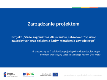 Zarządzanie projektem Projekt „Staże zagraniczne dla uczniów i absolwentów szkół zawodowych oraz szkolenia kadry kształcenia zawodowego” finansowany ze środków Europejskiego Funduszu Społecznego, Program Operacyjny Wiedza Edukacja Rozwój (PO WER) power.frse.org.pl/ksztalcenie-zawodowe Spis treści 1. 2. 3. 4. 5. 6. 7. 8. 9. 10. 11. Współpraca z partnerem Rekrutacja uczestników Zasada równości szans kobiet i mężczyzn Przygotowanie pedagogiczne, kulturowe i językowe Realizacja staży i monitorowanie przebiegu staży Raporty uczestników Certyfikacja mobilności Ewaluacja działań Rozpowszechnianie i wykorzystanie rezultatów Metody rozwiązywania problemów Jakość raportu końcowego power.frse.org.pl/ksztalcenie-zawodowe Podstawowe fazy zarządzania projektem Zatwierdzenie projektu do realizacji Kontraktowanie Przekazanie pierwszej zaliczki (max. 80% grantu) Opcjonalnie raport postępu (Art. I.4.2 Umowy Finansowej) Opcjonalnie przekazanie drugiej płatności zaliczkowej (max. do 20% grantu) Złożenie raportu końcowego Akceptacja raportu (płatność końcowa) power.frse.org.pl/ksztalcenie-zawodowe 1. Współpraca z partnerem/ami Kontrola beneficjenta nad całością projektu Szczegółowy podział zadań w grupie partnerskiej Doprecyzowanie z partnerem kwestii: terminów staży/szkolenia, programu stażu/szkolenia, formy i zasady opieki nad uczestnikami, organizacji zakwaterowania i wyżywienia, odpowiednich miejsc staży/szkolenia Certyfikacja uczestników „Zasada ograniczonego zaufania” Umowa partnerska Konsekwencje źle prowadzonego projektu ponosi beneficjent power.frse.org.pl/ksztalcenie-zawodowe 2. Rekrutacja uczestników Grupa docelowa projektu PO WER, np. absolwent – potwierdzenie kwalifikacji do wyjazdu Równy dostęp wszystkich potencjalnych kandydatów Przejrzysta dokumentacja, w tym: regulamin, kryteria wyboru i sposób ich oceny, protokoły, testy, kwestionariusze, i in. Lista rezerwowa Rekrutacja uzupełniająca / zakwalifikowanie osoby z listy rezerwowej potwierdzone w dokumentach rekrutacyjnych Możliwość kontroli 5% projektów pod względem poprawności doboru uczestników power.frse.org.pl/ksztalcenie-zawodowe 3. Zasada równości szans kobiet i mężczyzn Zgodnie z zapisem umowy finansowej Art. I.7.3 beneficjent jest zobowiązany do zapobiegania wszelkim formom dyskryminacji, w tym ze względu na płeć, wiek i wyznanie oraz promowania i zapewnienia zasad równych szans w czasie realizacji projektu. Zaplanowanie konkretnych działań (np. szkolenie) Wdrażanie zasady w sposób przekrojowy (np. równy dostęp do projektu) power.frse.org.pl/ksztalcenie-zawodowe 4. Przygotowanie pedagogiczne, kulturowe i językowe (1/2) JĘZYKOWE Brak możliwości skorzystania z platformy e-learningowej KE Główny nacisk na przygotowanie w kraju Przygotowanie za granicą jedynie jako uzupełnienie Zaplanowanie nauki odpowiedniego języka obcego Uwzględnienie kierunków kształcenia uczestników PEDAGOGICZNE Dostosowanie do potrzeb uczestników np. : BHP, Pierwsza Pomoc, Doradztwo zawodowe, Równość szans, Psycholog, Pedagog, inne KULTUROWE Przygotowanie w kraju i dodatkowo program kulturowy za granicą power.frse.org.pl/ksztalcenie-zawodowe 4. Przygotowanie pedagogiczne, kulturowe i językowe (2/2) Ustalona liczba godzin przygotowania na uczestnika/grupę w podziale na rodzaje zajęć Wykwalifikowana kadra prowadząca zajęcia Materiały dla uczestników Ewaluacja przygotowania Możliwość sfinansowania przygotowania językowego z budżetu na wsparcie organizacyjne Możliwość wprowadzenia korekt do planu przygotowania power.frse.org.pl/ksztalcenie-zawodowe 5. Realizacja staży i monitorowanie przebiegu staży Bieżące informowanie FRSE o zmianach i problemach w projekcie MOBILNOŚĆ UCZNIÓW Aktywna rola opiekunów – osób towarzyszących (znajomość języka obcego, znajomość branży, przygotowanie zawodowe i pedagogiczne) Ustalenie harmonogramu wizyt w miejscach stażu Kontrola liczby godzin stażu, godzin pracy oraz czasu wolnego Nadzór nad realizacją programu stażu MOBILNOŚĆ KADRY Działalność dydaktyczna - prowadzenie kursów i szkoleń Szkolenie kadry – „job shadowing”; praktyka lub udział w szkoleniach w instytucjach kształcenia i szkolenia zawodowego power.frse.org.pl/ksztalcenie-zawodowe 6. Raporty uczestników Udostępnienie uczestnikom mobilności indywidualnego raportu w systemie Mobility Tool+ najpóźniej 7. dnia po zakończeniu mobilności danego uczestnika Istotne informacje związane z realizacją celów mobilności i osiągnięciem wskaźników: nabycie kompetencji zawodowych lub kluczowych wzmocnienie zdolności do zatrudnienia zrealizowanie programu stażu zawodowego Wypełnienie i przesłanie przez uczestnika raportu w systemie Mobility Tool+ najpóźniej 14. dnia po zakończeniu mobilności Odpowiedzialność Beneficjenta za terminowe wypełnienie raportu przez uczestnika Terminy raportu uczestnika określone w umowie finansowej power.frse.org.pl/ksztalcenie-zawodowe 7. Certyfikacja mobilności Dokumenty potwierdzające: potwierdzenie uczestnictwa w działaniu za granicą zaświadczenie podpisane przez organizację przyjmującą podanie imienia i nazwiska uczestnika, określenie celu mobilności, daty rozpoczęcia i zakończenia stażu. (Część II Warunki Ogólne do Umowy Finansowej) Europass-Mobilność i / lub Zaświadczenie / Certyfikat uczestnictwa w stażu z logotypami power.frse.org.pl/ksztalcenie-zawodowe 8. Ewaluacja działań (1/2) Cele ewaluacji: Sprawdzenie, czy i w jakim stopniu realizowane są cele projektu Określenie mocnych i słabych stron projektu Znalezienie obszarów do poprawy Źródło wiedzy dla znalezienia właściwych rozwiązań na przyszłość lub w razie zaistniałych trudności Ewaluacja ≠ Monitoring Obszary ewaluacji: rekrutacja uczestników, przygotowanie uczestników, przebieg mobilności, rezultaty, współpraca z partnerem, rozpowszechnianie, wpływ, oddziaływanie i t