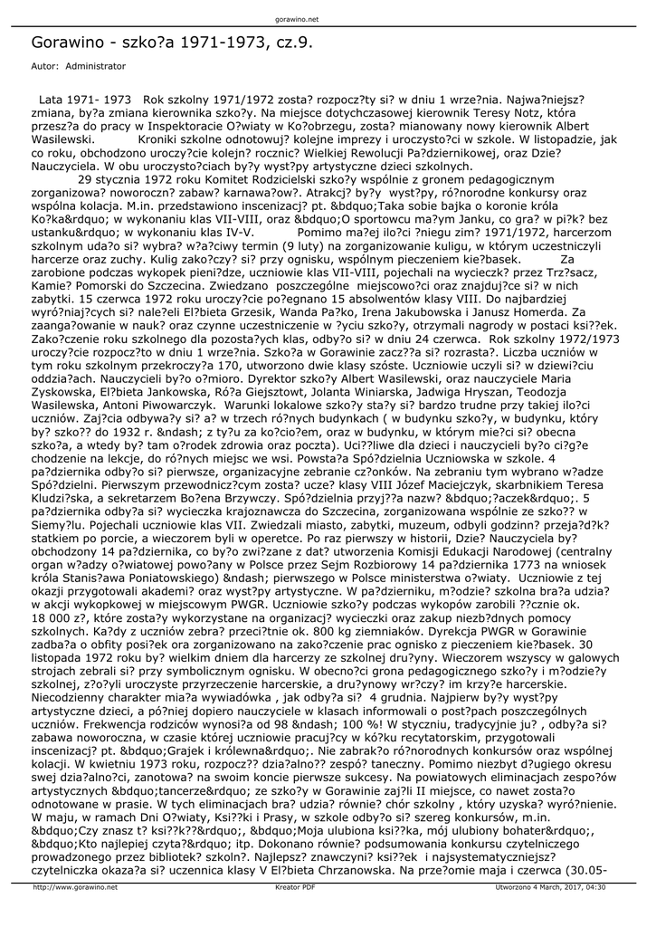 gorawino.net Gorawino - szko?a 1971-1973, cz.9. Autor: Administrator Lata 1971- 1973 Rok szkolny 1971/1972 zosta? rozpocz?ty si? w dniu 1 wrze?nia. Najwa?niejsz? zmiana, by?a zmiana kierownika szko?y. Na miejsce dotychczasowej kierownik Teresy Notz, która przesz?a do pracy w Inspektoracie O?wiaty w Ko?obrzegu, zosta? mianowany nowy kierownik Albert Wasilewski. Kroniki szkolne odnotowuj? kolejne imprezy i uroczysto?ci w szkole. W listopadzie, jak co roku, obchodzono uroczy?cie kolejn? rocznic? Wielkiej Rewolucji Pa?dziernikowej, oraz Dzie? Nauczyciela. W obu uroczysto?ciach by?y wyst?py artystyczne dzieci szkolnych. 29 stycznia 1972 roku Komitet Rodzicielski szko?y wspólnie z gronem pedagogicznym zorganizowa? noworoczn? zabaw? karnawa?ow?. Atrakcj? by?y wyst?py, ró?norodne konkursy oraz wspólna kolacja. M.in. przedstawiono inscenizacj? pt. „Taka sobie bajka o koronie króla Ko?ka” w wykonaniu klas VII-VIII, oraz „O sportowcu ma?ym Janku, co gra? w pi?k? bez ustanku” w wykonaniu klas IV-V. Pomimo ma?ej ilo?ci ?niegu zim? 1971/1972, harcerzom szkolnym uda?o si? wybra? w?a?ciwy termin (9 luty) na zorganizowanie kuligu, w którym uczestniczyli harcerze oraz zuchy. Kulig zako?czy? si? przy ognisku, wspólnym pieczeniem kie?basek. Za zarobione podczas wykopek pieni?dze, uczniowie klas VII-VIII, pojechali na wycieczk? przez Trz?sacz, Kamie? Pomorski do Szczecina. Zwiedzano poszczególne miejscowo?ci oraz znajduj?ce si? w nich zabytki. 15 czerwca 1972 roku uroczy?cie po?egnano 15 absolwentów klasy VIII. Do najbardziej wyró?niaj?cych si? nale?eli El?bieta Grzesik, Wanda Pa?ko, Irena Jakubowska i Janusz Homerda. Za zaanga?owanie w nauk? oraz czynne uczestniczenie w ?yciu szko?y, otrzymali nagrody w postaci ksi??ek. Zako?czenie roku szkolnego dla pozosta?ych klas, odby?o si? w dniu 24 czerwca. Rok szkolny 1972/1973 uroczy?cie rozpocz?to w dniu 1 wrze?nia. Szko?a w Gorawinie zacz??a si? rozrasta?. Liczba uczniów w tym roku szkolnym przekroczy?a 170, utworzono dwie klasy szóste. Uczniowie uczyli si? w dziewi?ciu oddzia?ach. Nauczycieli by?o o?mioro. Dyrektor szko?y Albert Wasilewski, oraz nauczyciele Maria Zyskowska, El?bieta Jankowska, Ró?a Giejsztowt, Jolanta Winiarska, Jadwiga Hryszan, Teodozja Wasilewska, Antoni Piwowarczyk. Warunki lokalowe szko?y sta?y si? bardzo trudne przy takiej ilo?ci uczniów. Zaj?cia odbywa?y si? a? w trzech ró?nych budynkach ( w budynku szko?y, w budynku, który by? szko?? do 1932 r. – z ty?u za ko?cio?em, oraz w budynku, w którym mie?ci si? obecna szko?a, a wtedy by? tam o?rodek zdrowia oraz poczta). Uci??liwe dla dzieci i nauczycieli by?o ci?g?e chodzenie na lekcje, do ró?nych miejsc we wsi. Powsta?a Spó?dzielnia Uczniowska w szkole. 4 pa?dziernika odby?o si? pierwsze, organizacyjne zebranie cz?onków. Na zebraniu tym wybrano w?adze Spó?dzielni. Pierwszym przewodnicz?cym zosta? ucze? klasy VIII Józef Maciejczyk, skarbnikiem Teresa Kludzi?ska, a sekretarzem Bo?ena Brzywczy. Spó?dzielnia przyj??a nazw? „?aczek”. 5 pa?dziernika odby?a si? wycieczka krajoznawcza do Szczecina, zorganizowana wspólnie ze szko?? w Siemy?lu. Pojechali uczniowie klas VII. Zwiedzali miasto, zabytki, muzeum, odbyli godzinn? przeja?d?k? statkiem po porcie, a wieczorem byli w operetce. Po raz pierwszy w historii, Dzie? Nauczyciela by? obchodzony 14 pa?dziernika, co by?o zwi?zane z dat? utworzenia Komisji Edukacji Narodowej (centralny organ w?adzy o?wiatowej powo?any w Polsce przez Sejm Rozbiorowy 14 pa?dziernika 1773 na wniosek króla Stanis?awa Poniatowskiego) – pierwszego w Polsce ministerstwa o?wiaty. Uczniowie z tej okazji przygotowali akademi? oraz wyst?py artystyczne. W pa?dzierniku, m?odzie? szkolna bra?a udzia? w akcji wykopkowej w miejscowym PWGR. Uczniowie szko?y podczas wykopów zarobili ??cznie ok. 18 000 z?, które zosta?y wykorzystane na organizacj? wycieczki oraz zakup niezb?dnych pomocy szkolnych. Ka?dy z uczniów zebra? przeci?tnie ok. 800 kg ziemniaków. Dyrekcja PWGR w Gorawinie zadba?a o obfity posi?ek ora zorganizowano na zako?czenie prac ognisko z pieczeniem kie?basek. 30 listopada 1972 roku by? wielkim dniem dla harcerzy ze szkolnej dru?yny. Wieczorem wszyscy w galowych strojach zebrali si? przy symbolicznym ognisku. W obecno?ci grona pedagogicznego szko?y i m?odzie?y szkolnej, z?o?yli uroczyste przyrzeczenie harcerskie, a dru?ynowy wr?czy? im krzy?e harcerskie. Niecodzienny charakter mia?a wywiadówka , jak odby?a si? 4 grudnia. Najpierw by?y wyst?py artystyczne dzieci, a pó?niej dopiero nauczyciele w klasach informowali o post?pach poszczególnych uczniów. Frekwencja rodziców wynosi?a od 98 – 100 %! W styczniu, tradycyjnie ju? , odby?a si? zabawa noworoczna, w czasie której uczniowie pracuj?cy w kó?ku recytatorskim, przygotowali inscenizacj? pt. „Grajek i królewna”. Nie zabrak?o ró?norodnych konkursów oraz wspólnej kolacji. W kwietniu 1973 roku, rozpocz?? dzia?alno?? zespó? taneczny. Pomimo niezbyt d?ugiego okresu swej dzia?alno?ci, zanotowa? na swoim koncie pierwsze sukcesy. Na powiatowych eliminacjach zespo?ów artystycznych „tancerze” ze szko?y w Gorawinie zaj?li II miejsce, co nawet zosta?o odnotowane w prasie. W tych eliminacjach bra? udzia? równie? chór szkolny , który uzyska? wyró?nienie. W maju, w ramach Dni O?wiaty, Ksi??ki i Prasy, w szkole odby?o si? szereg konkursów, m.in. „Czy znasz t? ksi??k??”, „Moja ulubiona ksi??ka, mój ulubiony bohater”, „Kto najlepiej czyta?” itp. Dokonano równie? podsumowania konkursu czytelniczego prowadzonego przez bibliotek? szkoln?. Najlepsz? znawczyni? ksi??ek i najsystematyczniejsz? czytelniczka okaza?a si? uczennica klasy V El?bieta Chrzanowska. Na prze?omie maja i czerwca (30.05http://www.gorawino.net Kreator PDF Utworzono 4 March, 2017, 04:30 gorawino.net 03.06.) odby? si? biwak dla m?odzie?y szkolnej nad jeziorem w Dargocicach. Odst?piono tym razem od organizowania wycieczki autokarowej, na rzecz kilkudniowego sp?dzenia czasu na ?onie natury. M?odzie? wykaza?