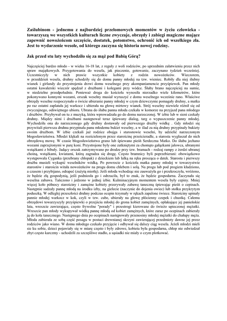Zaślubinom - jednemu z najbardziej przełomowych momentów w życiu człowieka towarzyszą we wszystkich kulturach liczne zwyczaje, obrzędy i zabiegi magiczne mające zapewnić nowożeńcom szczęście, dostatek, potomstwo, ochronić ich od wszelkiego zła. Jest to wydarzenie wesołe, od którego zaczyna się historia nowej rodziny. Jak przed stu laty wychodziło się za mąż pod Babią Górą? Najczęściej bardzo młodo - w wieku 16-18 lat, z reguły z woli rodziców, po uprzednim załatwieniu przez nich spraw majątkowych. Przygotowania do wesela, jak pieczenie, gotowanie, zaczynano tydzień wcześniej. Uczestniczyły w nich prawie wszystkie kobiety z rodzin nowożeńców. Wieczorem, w przeddzień wesela, druhny schodziły się do domu panny młodej na tzw. wieniec. Robiły dla niej ślubny wianek i girlandy do przystrojenia drzwi domu weselnego przy akompaniamencie przyśpiewek. Pan młody ostatni kawalerski wieczór spędzał z drużbami i kolegami przy wódce. Śluby brano najczęściej na sumie, w niedzielne przedpołudnie. Ponieważ droga do kościoła wynosiła nierzadko wiele kilometrów, które pokonywano konnymi wozami, orszak weselny musiał wyruszyć z domu weselnego wcześnie rano. Właściwe obrzędy weselne rozpoczynało o świcie ubieranie panny młodej w czym dziewczynie pomagały druhny, a matka po raz ostatni zaplatała jej warkocz i ubierała na głowę mirtowy wianek. Strój weselny niewiele różnił się od zwyczajnego, odświętnego ubioru. Ubrana do ślubu panna młoda czekała w komorze na przyjazd pana młodego i drużbów. Przybywał on tu z muzyką, która wprowadzała go do domu narzeczonej. W izbie lub w sieni czekały druhny. Między nimi i drużbami następował teraz śpiewany dialog, targ o wypuszczenie panny młodej. Wychodziła ona do narzeczonego gdy druhny dostawały od pierwszego drużby wódkę . Gdy młodzi się przywitali pierwsza druhna przypinała panu młodemu bukiet weselny, a w ślad za nią druhny przypinały bukiety swoim drużbom. W izbie czekali już rodzice obojga i starostowie weselni, by udzielić narzeczonym błogosławieństwa. Młodzi klękali na rozścielonym przez starościnę prześcieradle, a starosta wygłaszał do nich obrzędową mowę. W czasie błogosławieństwa grano lub śpiewano pieśń Serdeczna Matko. Do ślubu jechano wozami zaprzężonymi w parę koni. Przystrojone były one zatkniętymi za chomąto gałązkami jałowca, ubranymi wstążkami z bibuły. Jadący orszak zatrzymywano po drodze przy tzw. bramach - rodzaj rampy z żerdzi ubranej choiną, wstążkami, kwiatami, którą zagradza się drogę. Często bramnicy byli poprzebierani: obowiązkowo występowała Cyganka (przebrany chłopak) z dzieckiem lub lalką na ręku prosząca o datek. Starosta i pierwszy drużba musieli wykupić weselników wódką. Po powrocie z kościoła matka panny młodej w towarzystwie starostów i starościn witała nowożeńców na progu domu chlebem i solą. Na progu lub pod progiem kładziono, a czasem i przybijano, odrapeć (zużytą miotłę). Jeśli młoda wchodząc nie zauważyła go i przekroczyła, wróżono, że będzie złą gospodynią, jeśli podniosła go i odrzuciła, był to znak, że będzie gospodarna. Zaczynała się weselna zabawa. Tańczono i jedzono w jednej izbie. Kulminacyjnym momentem wesela były cepiny. Mniej więcej koło północy starościny i zamężne kobiety przerywały zabawę taneczną śpiewając pieśń o cepinach. Następnie sadzały pannę młodą na środku izby, na gielecie (naczynie do dojenia owiec) lub stołku przykrytym poduszką. W odległej przeszłości druhny podczas ocepin trzymały w rękach zapalone świece. Starościny upinały pannie młodej warkocz w kok, czyli w tzw. cube, ubierały na głowę płócienny czepek i chustkę. Całemu obrzędowi towarzyszyły przyśpiewki o przejściu młodej do grona kobiet zamężnych, opłakujące jej panieńskie lata, wreszcie zawierające, często frywolne "porady" i przestrogi kierowane do świeżo upieczonej mężatki. Wreszcie pan młody wykupywał wódką pannę młodą od kobiet zamężnych, które zaraz po ocepinach zabierały ją do koła tanecznego. Następnego dnia po ocepinach następowały przenosiny młodej mężatki do chałupy męża. Młoda zabierała ze sobą część posagu w postaci drewnianej skrzyni zawierającej przedmioty dawne jej przez rodziców jako wiano. W domu młodego czekało przyjęcie i odbywał się dalszy ciąg wesela. Jeżeli młodzi mieli sie ku sobie, dzieci pojawiały się w miarę często i były zdrowe, kobieta była gospodarna, chłop nie odwiedzał zbyt często karczmy - uchodzili za szczęśliwe stadło, a sąsiadki nie miały o czym plotkować. Przedstawiamy Państwu 5 propozycji menu weselnego, które mogą być modyfikowane wg. życzeń i sugestii. MENU I cena: 140zł/os Powitanie chlebem i solą Toast za zdrowie Młodej Pary- lampka wina musującego Uroczysty obiad Staropolski rosół z makaronem (możliwość wyboru innej zupy) Kotlet schabowy zapiekany z farszem pieczarkowym, roladka drobiowa ziemniaki młode z koperkiem, zestaw surówek Deser Lodowa szarlotka na ciepło Bufet napoi gorących serwowany wg. życzeń gości (bez limitu) Herbata Kawa z expresu Kawa Latte Kawa Cappucino Kawa rozpuszczlna Kawa parzona po turecku Serwis napoi zimnych (3 sztuki na osobę) Napoje owocowe Coca- Cola Sprite woda mineralna serwowana w dzbankach - bez limitu Owoce na stół wliczone w cenę menu Zimna płyta: Półmisek swojskich wędlin, rolada z indyka, boczek pieczony, tymbaliki drobiowe, śledź po krakowsku, sałatka jarzynowa, sałatka paprykowa, chleb ze swojskim smalcem I danie gorące Zupa gulaszowa „Przysmak Zbójnicki” II danie gorące Udko faszerowane z kurczaka, frytki, sałatka pekińska III danie gorące Barszcz czerwony z krokietem W cenie menu zapewniamy Państwu także: profesjonalną pomoc w organizacji przyjęcia dekorację stołów weselnych specjalną dekorację stołu młodej