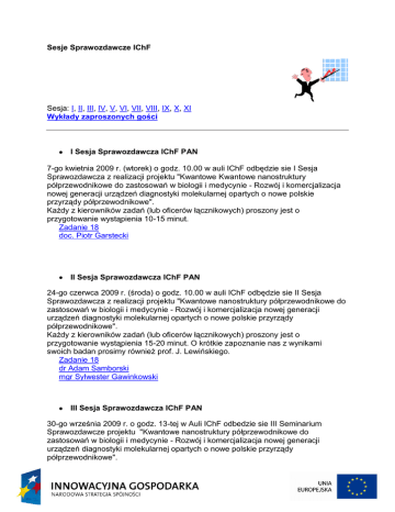Sesje Sprawozdawcze IChF Sesja: I, II, III, IV, V, VI, VII, VIII, IX, X, XI Wykłady zaproszonych gości I Sesja Sprawozdawcza IChF PAN 7-go kwietnia 2009 r. (wtorek) o godz. 10.00 w auli IChF odbędzie sie I Sesja Sprawozdawcza z realizacji projektu "Kwantowe Kwantowe nanostruktury półprzewodnikowe do zastosowań w biologii i medycynie - Rozwój i komercjalizacja nowej generacji urządzeń diagnostyki molekularnej opartych o nowe polskie przyrządy półprzewodnikowe". Każdy z kierowników zadań (lub oficerów łącznikowych) proszony jest o przygotowanie wystąpienia 10-15 minut. Zadanie 18 doc. Piotr Garstecki II Sesja Sprawozdawcza IChF PAN 24-go czerwca 2009 r. (środa) o godz. 10.00 w auli IChF odbędzie sie II Sesja Sprawozdawcza z realizacji projektu "Kwantowe nanostruktury półprzewodnikowe do zastosowań w biologii i medycynie - Rozwój i komercjalizacja nowej generacji urządzeń diagnostyki molekularnej opartych o nowe polskie przyrządy półprzewodnikowe". Każdy z kierowników zadań (lub oficerów łącznikowych) proszony jest o przygotowanie wystąpienia 15-20 minut. O krótkie zapoznanie nas z wynikami swoich badan prosimy również prof. J. Lewińskiego. Zadanie 18 dr Adam Samborski mgr Sylwester Gawinkowski III Sesja Sprawozdawcza IChF PAN 30-go września 2009 r. o godz. 13-tej w Auli IChF odbedzie sie III Seminarium Sprawozdawcze projektu "Kwantowe nanostruktury półprzewodnikowe do zastosowań w biologii i medycynie - Rozwój i komercjalizacja nowej generacji urządzeń diagnostyki molekularnej opartych o nowe polskie przyrządy półprzewodnikowe". Temat przewodni: Modyfikacje powierzchni - chemia. O godz. 14-tej gość specjalny prof. Marcin Majda z UC Berkeley wygłosi wykład pt. "Antibody-antigen Equilibria in a Field of an External Force: Design of Reagentless Biosensors" od 13-stej krótkie 10-min wystąpienia wygłoszą: dr Igor Czerski dr Paweł Jankowski dr Maciej Paszewski prof. J. Lewiński/mgr K. Sokołowski IV Sesja Sprawozdawcza IChF PAN 31-go marca 2010 r. o godz. 13-tej w Auli IChF odbedzie sie IV Seminarium Sprawozdawcze projektu "Kwantowe nanostruktury półprzewodnikowe do zastosowań w biologii i medycynie - Rozwój i komercjalizacja nowej generacji urządzeń diagnostyki molekularnej opartych o nowe polskie przyrządy półprzewodnikowe". Każdy z kierowników zadań (lub oficerów łącznikowych) proszony jest o przygotowanie wystąpienia 15 minut + 5 min. dyskusja (z zadania 17 - prof. Kutner, prof. Opałło). O krótkie zapoznanie nas z wynikami swoich badan prosimy również prof. J. Lewińskiego. V Sesja Sprawozdawcza IChF PAN 24-go czerwca 2010 r. o godz. 10-tej w Auli IChF odbedzie sie V Seminarium Sprawozdawcze projektu "Kwantowe nanostruktury półprzewodnikowe do zastosowań w biologii i medycynie - Rozwój i komercjalizacja nowej generacji urządzeń diagnostyki molekularnej opartych o nowe polskie przyrządy półprzewodnikowe". Wystąpienia wygłoszą: dr Paweł Jankowski dr Krzysztof Noworyta dr Marcin Fiałkowski dr Mirosław Krawczyk dr Agnieszka Michta- Kamińska prof. J. Lewiński VI Sesja Sprawozdawcza IChF PAN 29-go września 2010 r. o godz. 10-tej w Auli IChF odbędzie sie VI Seminarium Sprawozdawcze projektu "Kwantowe nanostruktury półprzewodnikowe do zastosowań w biologii i medycynie - Rozwój i komercjalizacja nowej generacji urządzeń diagnostyki molekularnej opartych o nowe polskie przyrządy półprzewodnikowe". Wystąpienia wygłoszą: dr Paweł Jankowski dr Ewa Rożniecka dr Krzysztof Noworyta dr Mirosław Krawczyk mgr Sylwester Gawinkowski • VII Sesja Sprawozdawcza IChF PAN 27-go stycznia 2011 r. o godz. 10-tej w Auli IChF odbędzie sie VII Seminarium Sprawozdawcze projektu "Kwantowe nanostruktury półprzewodnikowe do zastosowań w biologii i medycynie - Rozwój i komercjalizacja nowej generacji urządzeń diagnostyki molekularnej opartych o nowe polskie przyrządy półprzewodnikowe". Wystąpienia wygłoszą: dr Paweł Jankowski dr Krzysztof Noworyta Katarzyna Winkler Prof. Marcin Opałło Prof. Aleksander Jabłoński Dr Agnieszka Michota-Kamińska Prof. Janusz Lewandowski • VIII Sesja Sprawozdawcza IChF PAN 30-go marca 2011 r. o godz. 10-tej w Auli IChF odbędzie sie VIII Seminarium Sprawozdawcze projektu "Kwantowe nanostruktury półprzewodnikowe do zastosowań w biologii i medycynie - Rozwój i komercjalizacja nowej generacji urządzeń diagnostyki molekularnej opartych o nowe polskie przyrządy półprzewodnikowe". Wystąpienia wygłoszą: dr J. Michalski dr K. Noworyta Prof. M. Opałło Dr V. Sashuk Dr J. Sobczak S. Gawinkowski • IX Sesja Sprawozdawcza IChF PAN 30-go czerwca 2011 r. o godz. 10-tej w Auli IChF odbędzie się IX Seminarium Sprawozdawcze projektu "Kwantowe nanostruktury półprzewodnikowe do zastosowań w biologii i medycynie - Rozwój i komercjalizacja nowej generacji urządzeń diagnostyki molekularnej opartych o nowe polskie przyrządy półprzewodnikowe". Wystąpienie wygłosi: dr M. Krajewska- referat ma charakter podsumowujący, zawiera informacje pomocne w prawidłowej realizacji projektu. • X Sesja Sprawozdawcza IChF PAN 15-go listopada 2011 r. o godz. 8 w Auli IChF odbędzie się X Seminarium Sprawozdawcze projektu "Kwantowe nanostruktury półprzewodnikowe do zastosowań w biologii i medycynie - Rozwój i komercjalizacja nowej generacji urządzeń diagnostyki molekularnej opartych o nowe polskie przyrządy półprzewodnikowe". Wystąpienia wygłoszą: Prof. J. Lewiński Dr hab. P.Garstecki Prof. W.Kutner Dr A. Michota-Kamińska Prof. J.Waluk Prof. M.Opałło Dr hab. M.Fiałkowski Prof. A.Jabłoński • XI Sesja Sprawozdawcza IChF PAN 25-go listopada 2012 r. o godz. 9.30 w Auli IChF odbędzie się XI Seminarium Sprawozdawcze projektu "Kwantowe nanostruktury półprzewodnikowe do zastosowań w biologii i medycynie - Rozwój i komercjalizacja nowej generacji urządzeń diagnostyki molekularnej opartych o nowe polskie przyrządy półprzewodnikowe". Celem seminarium jes