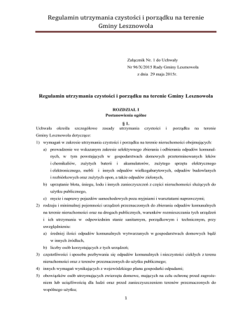 Regulamin utrzymania czystości i porządku na terenie Gminy Lesznowola Załącznik Nr. 1 do Uchwały Nr 96/X/2015 Rady Gminy Lesznowola z dnia 29 maja 2015r. Regulamin utrzymania czystości i porządku na terenie Gminy Lesznowola ROZDZIAŁ I Postanowienia ogólne Uchwała określa szczegółowe § 1. utrzymania zasady czystości i porządku na terenie Gminy Lesznowola dotyczące: 1) wymagań w zakresie utrzymania czystości i porządku na terenie nieruchomości obejmujących: a) prowadzenie we wskazanym zakresie selektywnego zbierania i odbierania odpadów komunalnych, w tym powstających w gospodarstwach domowych przeterminowanych leków i chemikaliów, zużytych i elektronicznego, mebli baterii i akumulatorów, zużytego sprzętu elektrycznego i innych odpadów wielkogabarytowych, odpadów budowlanych i rozbiórkowych oraz zużytych opon, a także odpadów zielonych, b) uprzątanie błota, śniegu, lodu i innych zanieczyszczeń z części nieruchomości służących do użytku publicznego, c) mycie i naprawy pojazdów samochodowych poza myjniami i warsztatami naprawczymi; 2) rodzaju i minimalnej pojemności urządzeń przeznaczonych do zbierania odpadów komunalnych na terenie nieruchomości oraz na drogach publicznych, warunków rozmieszczania tych urządzeń i ich utrzymania w odpowiednim stanie sanitarnym, porządkowym i technicznym, przy uwzględnieniu: a) średniej ilości odpadów komunalnych wytwarzanych w gospodarstwach domowych bądź w innych źródłach, b) liczby osób korzystających z tych urządzeń; 3) częstotliwości i sposobu pozbywania się odpadów komunalnych i nieczystości ciekłych z terenu nieruchomości oraz z terenów przeznaczonych do użytku publicznego; 4) innych wymagań wynikających z wojewódzkiego planu gospodarki odpadami; 5) obowiązków osób utrzymujących zwierzęta domowe, mających na celu ochronę przed zagrożeniem lub uciążliwością dla ludzi oraz przed zanieczyszczeniem terenów przeznaczonych do wspólnego użytku; 1 Regulamin utrzymania czystości i porządku na terenie Gminy Lesznowola 6) wymagań utrzymywania zwierząt gospodarskich na terenach wyłączonych z produkcji rolniczej, w tym także zakazu ich utrzymywania na określonych obszarach lub w poszczególnych nieruchomościach; 7) wyznaczania obszarów podlegających obowiązkowej deratyzacji i terminów jej przeprowadzania. ROZDZIAŁ II Wymagania w zakresie utrzymania czystości i porządku na terenie nieruchomości oraz na terenach służących do użytku publicznego § 2. 1. Właściciele nieruchomości obowiązani są do prowadzenia selektywnego zbierania, a odbierający odpady do odbierania następujących rodzajów odpadów: 1) niesegregowanych (zmieszanych) odpadów komunalnych, z zastrzeżeniem pkt 2-7, 2) przeterminowanych leków i chemikaliów, 3) zużytych baterii i akumulatorów, 4) zużytego sprzętu elektrycznego i elektronicznego, 5) mebli i innych odpadów wielkogabarytowych, 6) odpadów budowlanych i rozbiórkowych, 7) zużytych opon, 8) odpadów zielonych, 9) papieru i tektury, 10) szkła bezbarwnego, 11) szkła kolorowego, 12) tworzywa sztucznego typu PET, 13) tworzywa sztucznego typu plastik przemysłowo-gospodarczy, 14) metali. 2. Odpady, o których mowa w ust. 1, właściciele nieruchomości obowiązani są zbierać i gromadzić w terminie niezwłocznym od chwili ich powstania. 3. Odpady określone w ust. 1 odbierane są w sposób gwarantujący ich niezmieszanie z innymi rodzajami odpadów zbieranych selektywnie. Odpady te należy odbierać z częstotliwością określoną w rozdziale IV. 4. Właściciele nieruchomości, na terenie których w wyniku pielęgnacji zieleni powstają odpady roślinne, zobowiązani są do ich zbierania i przekazywania przedsiębiorcy lub kompostowania odpadów we własnym zakresie w sposób nie powodujący uciążliwości lub zagrożeń dla mieszkańców sąsiednich nieruchomości. 2 Regulamin utrzymania czystości i porządku na terenie Gminy Lesznowola § 3. 1. Uprzątanie i utrzymanie dróg wewnętrznych, ciągów pieszo-jezdnych i chodników na terenach osiedli mieszkaniowych należy do obowiązków ich zarządców lub administratorów. 2. Uprzątanie i pozbycie się błota, śniegu, lodu i innych zanieczyszczeń z przystanków komunikacyjnych, na długości zatoki przystankowej, a w przypadku jej braku na długości 30m należy do obowiązków przedsiębiorców użytkujących tereny służące komunikacji publicznej. § 4. 1. Mycie pojazdów samochodowych poza myjniami może odbywać się wyłącznie pod warunkiem: 1) niezanieczyszczania środowiska i odprowadzania powstających ścieków do kanalizacji sanitarnej lub zbiornika bezodpływowego, 2) dokonywania tych czynności na wydzielonych, utwardzonych częściach nieruchomości oraz przy użyciu środków ulegających biodegradacji, 3) iż mycie dotyczy nadwozia samochodu, 4) na terenach służących do użytku publicznego tylko w miejscach do tego przygotowanych i specjalnie oznaczonych. 2. Naprawa pojazdów samochodowych poza warsztatami samochodowymi może odbywać się wyłącznie pod warunkiem: 1) niezanieczyszczania środowiska i gromadzenia powstających odpadów w urządzeniach do tego przeznaczonych, 2) iż naprawa pojazdów samochodowych dotyczy drobnych napraw, 3) iż naprawa pojazdów samochodowych nie stwarza uciążliwości dla właścicieli sąsiednich nieruchomości. ROZDZIAŁ III Rodzaje i minimalna pojemność pojemników przeznaczonych do zbierania odpadów komunalnych na terenie nieruchomości oraz na drogach publicznych oraz warunki rozmieszczania tych pojemników i ich utrzymania w odpowiednim stanie sanitarnym, porządkowym i technicznym § 5. Ustala się następujące rodzaje pojemników przeznaczonych do zbierania odpadów komunalnych na terenie nieruchomości oraz na drogach publicznych: 1) pojemniki na odpady o pojemności 60 litrów (L); 2) pojemnik na odpady o pojemności 90 L; 2) pojemniki na odpady o pojemności 110 L; 3) pojemniki na odp