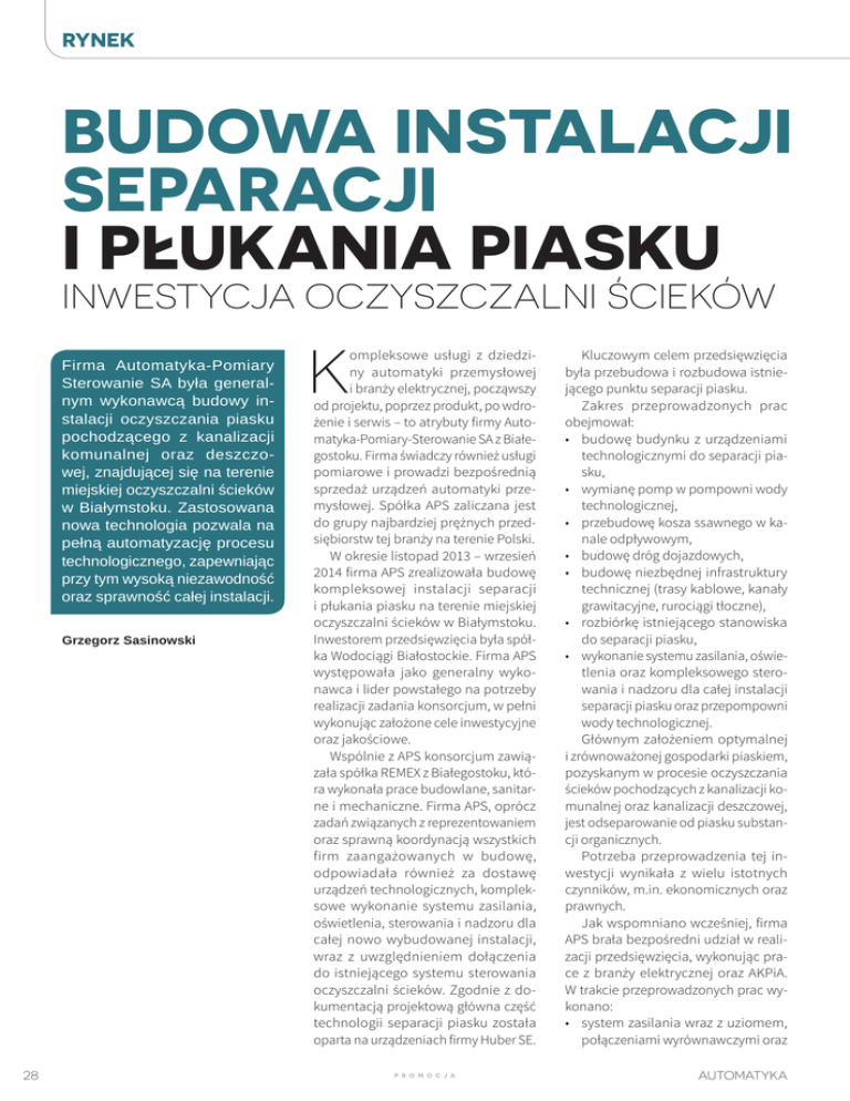 RYNEK BUDOWA INSTALACJI SEPARACJI I PŁUKANIA PIASKU INWESTYCJA OCZYSZCZALNI ŚCIEKÓW Firma Automatyka-Pomiary Sterowanie SA była generalnym wykonawcą budowy instalacji oczyszczania piasku pochodzącego z kanalizacji komunalnej oraz deszczowej, znajdującej się na terenie miejskiej oczyszczalni ścieków w Białymstoku. Zastosowana nowa technologia pozwala na pełną automatyzację procesu technologicznego, zapewniając przy tym wysoką niezawodność oraz sprawność całej instalacji. Grzegorz Sasinowski 28 K ompleksowe usługi z dziedziny automatyki przemysłowej i branży elektrycznej, począwszy od projektu, poprzez produkt, po wdrożenie i serwis – to atrybuty firmy Automatyka-Pomiary-Sterowanie SA z Białegostoku. Firma świadczy również usługi pomiarowe i prowadzi bezpośrednią sprzedaż urządzeń automatyki przemysłowej. Spółka APS zaliczana jest do grupy najbardziej prężnych przedsiębiorstw tej branży na terenie Polski. W okresie listopad 2013 – wrzesień 2014 firma APS zrealizowała budowę kompleksowej instalacji separacji i płukania piasku na terenie miejskiej oczyszczalni ścieków w Białymstoku. Inwestorem przedsięwzięcia była spółka Wodociągi Białostockie. Firma APS występowała jako generalny wykonawca i lider powstałego na potrzeby realizacji zadania konsorcjum, w pełni wykonując założone cele inwestycyjne oraz jakościowe. Wspólnie z APS konsorcjum zawiązała spółka REMEX z Białegostoku, która wykonała prace budowlane, sanitarne i mechaniczne. Firma APS, oprócz zadań związanych z reprezentowaniem oraz sprawną koordynacją wszystkich firm zaangażowanych w budowę, odpowiadała również za dostawę urządzeń technologicznych, kompleksowe wykonanie systemu zasilania, oświetlenia, sterowania i nadzoru dla całej nowo wybudowanej instalacji, wraz z uwzględnieniem dołączenia do istniejącego systemu sterowania oczyszczalni ścieków. Zgodnie z dokumentacją projektową główna część technologii separacji piasku została oparta na urządzeniach firmy Huber SE. P R O M O C J A Kluczowym celem przedsięwzięcia była przebudowa i rozbudowa istniejącego punktu separacji piasku. Zakres przeprowadzonych prac obejmował: • budowę budynku z urządzeniami technologicznymi do separacji piasku, • wymianę pomp w pompowni wody technologicznej, • przebudowę kosza ssawnego w kanale odpływowym, • budowę dróg dojazdowych, • budowę niezbędnej infrastruktury technicznej (trasy kablowe, kanały grawitacyjne, rurociągi tłoczne), • rozbiórkę istniejącego stanowiska do separacji piasku, • wykonanie systemu zasilania, oświetlenia oraz kompleksowego sterowania i nadzoru dla całej instalacji separacji piasku oraz przepompowni wody technologicznej. Głównym założeniem optymalnej i zrównoważonej gospodarki piaskiem, pozyskanym w procesie oczyszczania ścieków pochodzących z kanalizacji komunalnej oraz kanalizacji deszczowej, jest odseparowanie od piasku substancji organicznych. Potrzeba przeprowadzenia tej inwestycji wynikała z wielu istotnych czynników, m.in. ekonomicznych oraz prawnych. Jak wspomniano wcześniej, firma APS brała bezpośredni udział w realizacji przedsięwzięcia, wykonując prace z branży elektrycznej oraz AKPiA. W trakcie przeprowadzonych prac wykonano: • system zasilania wraz z uziomem, połączeniami wyrównawczymi oraz AUTOMATYKA RYNEK O ZASADNOŚCI BUDOWY NOWEJ INSTALACJI SEPARATORA PIASKU ROZMAWIAMY Z MARKIEM PAWEŁKO, KIEROWNIKIEM OCZYSZCZALNI ŚCIEKÓW W BIAŁYMSTOKU Jaki był główny powód przeprowadzenia tej inwestycji? Głównym powodem była śmierć techniczna poprzednich urządzeń oraz fakt, iż poprzednie urządzenia służyły tylko i wyłącznie potrzebom oczyszczalni – poprzedni separator w podstawowym założeniu został wybudowany do tego celu. Odrębnym tematem był problem kanalizacji deszczowej. Przy jej czyszczeniu powstaje duża ilość piasku, wywożonego uprzednio na składowisko odpadów. Dzięki temu, iż istnieją urządzenia, które czyszczą ten piasek, zastosowaliśmy je u siebie i obecnie posiadamy dwie instalacje: pierwsza służy potrzebom oczyszczalni, zaś druga służy do czyszczenia piasku z wozów asenizacyjnych czyszczących kanalizację deszczową. Czy wybudowana instalacja osiąga zakładaną wydajność? Pierwotnie zakładaliśmy bardzo dużą ilość piasku pochodzącego z oczyszczalni. W tej chwili jest go znacznie mniej, w związku z tym te urządzenia wybudowane są z nadmiarem i będą służyć przez najbliższe 20 lat. Natomiast ilość piasku z wozów asenizacyjnych Fot. APS instalacją odgromową budynku separacji piasku, • trasy kablowe w budynku separacji piasku oraz poza nim, • rozdzielnię główną budynku separacji piasku oraz związane z nią instalacje: oświetleniową, gniazd wtykowych oraz zasilania urządzeń grzewczych i wentylacyjnych, • szafę zasilająco-sterowniczą urządzeń technologicznych budynku separacji piasku oraz związane z nią • • • • jest na poziomie, który zakładaliśmy. Ponadto otrzymywany oczyszczony piasek spełnia wymagania wszystkich norm i przepisów obowiązujących w naszym kraju, które dotyczą piasku oczyszczalnianego i może być stosowany między innymi do rekultywacji innych gruntów. Czy ma Pan wiedzę, jak dużo tego typu instalacji występuje w innych oczyszczalniach w Polsce? Występują one praktycznie w każdej oczyszczalni, z wyjątkiem linii dedykowanej do wozów asenizacyjnych, która jest czwartą lub piątą w Polsce. Natomiast jako całość wybudowana w budynku jest to pierwsza instalacja w Polsce, która pracuje również zimą – a biorąc pod uwagę zimy, jakie ostatnio występują w naszym kraju, wozy asenizacyjne muszą pracować bez przerwy. Założona całoroczna praca instalacji wymagała zastosowania sprawdzonych rozwiązań i zaawansowanych technologicznie urządzeń. instalacje: zasilające, sterownicze i pomiarowe, układ detekcji/sygnalizac