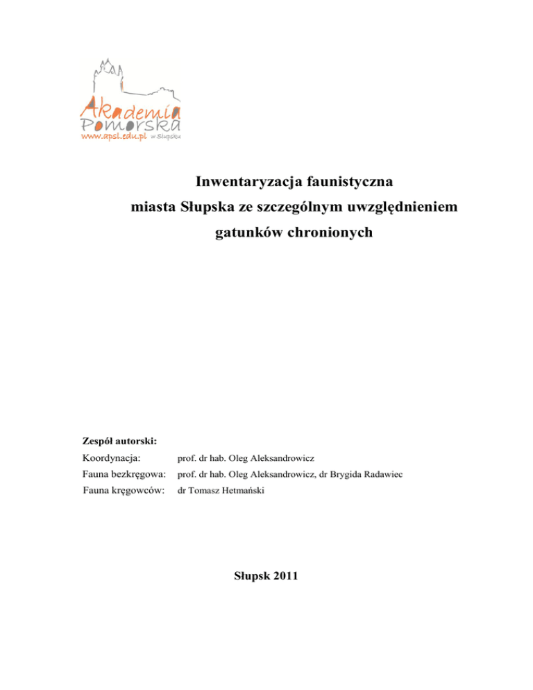 Inwentaryzacja faunistyczna miasta Słupska ze szczególnym uwzględnieniem gatunków chronionych Zespół autorski: Koordynacja: prof. dr hab. Oleg Aleksandrowicz Fauna bezkręgowa: prof. dr hab. Oleg Aleksandrowicz, dr Brygida Radawiec Fauna kręgowców: dr Tomasz Hetmański Słupsk 2011 Spis treści Wstęp ................................................................................................................................................... 5 Przedmiot i zakres opracowania ...................................................................................................... 5 Podstawy formalno prawne .............................................................................................................. 5 Źródła informacji stanowiące podstawę do sporządzania raportu ................................................... 5 1. Metody badań nad fauną .................................................................................................................. 6 2. Fauna Słupska (wybrane grupy zwierząt) ........................................................................................ 9 3. Analiza rozmieszczenia bezkręgowców ........................................................................................ 26 4. Chronione gatunki bezkręgowców................................................................................................. 28 Bombus hortorum (trzmiel ogrodowy, mapa 1.1-3, 5-6). .......................................................... 28 Bombus hypnorum (Trzmiel parkowy, mapa 2.1-3, 5-6). .......................................................... 28 Bombus lucorum (trzmiel gajowy, mapa 3.1-2, 5-6). ................................................................ 28 Bombus muscorum (trzmiel żółty, mapa 4.1-2, 5). .................................................................... 28 Bombus pascuorum (trzmiel rudy, mapa 5.2). ........................................................................... 28 Bombus pratorum (trzmiel leśny, mapa 6.5).............................................................................. 28 Bombus sylvarum (trzmiel rudoszary, mapa 7.2). ...................................................................... 28 Bombus terrestris (trzmiel ziemny). .......................................................................................... 28 Bombus lapidarius (trzmiel kamiennik). ................................................................................... 29 Carabus arvensis (biegacz górski, mapa 8.5). ........................................................................... 29 Carabus auratus (biegacz złoty, mapa 9.1-2). ........................................................................... 29 Carabus cancellatus (biegacz wręgaty, mapa 10.2, 5). ............................................................. 29 Carabus convexus (biegacz zwężony, mapa 11.5). ................................................................... 29 Carabus coriaceus (biegacz skurzasty, mapa 12.5). .................................................................. 29 Carabus glabratus (biegacz gładki, mapa 13.5). ....................................................................... 29 Carabus granulatus (biegacz granulowany, mapa 14.1-2, 5-6). ............................................... 29 Carabus hortensis (biegacz ogrodowy, mapa 15.2, 5). ............................................................. 29 Carabus nemoralis (biegacz gajowy, mapa 16.1-6). ................................................................. 30 Carabus violaceus (biegacz fioletowy, mapa 17.2-3, 5)............................................................ 30 Dorcus parallelepipedus (ciołek matowy, mapa 18.3, 5). ......................................................... 30 Hydrophilus aterrimus (kałużnica czarna, mapa 19.5). ............................................................. 30 Anisus vorticulus (zatoczek łamliwy mapa 20.5)....................................................................... 30 Myxas glutinosa (błotniarka otułka, mapa 21.5)……………………………………………….30 Helix pomatia (ślimak winniczek)……………………………………………………………..31 5. Kręgowce Chordata: Vertebrata..................................................................................................... 32 5.1. Ryby i Kręgouste Actinopterygii i Cephalaspidomorphi ........................................................ 32 5.2. Charakterystyka gatunków objętych ochroną prawną ............................................................ 34 Minóg strumieniowy (mapa 22.2) .............................................................................................. 34 Minóg rzeczny (mapa 23.2) ....................................................................................................... 34 Różanka (mapa 24.5) ................................................................................................................. 34 Koza (mapa 25.2) ....................................................................................................................... 34 Głowacz białopłetwy (mapa 26.2) ............................................................................................. 34 Łosoś atlantycki (mapa 26A.2)………………………………………………………………...34 5.3. Gatunki ryb w rzece Słupi ....................................................................................................... 35 5.4. Gatunki ryb wód stojących ..................................................................................................... 35 5.5. Siedliska kluczowe.................................................................................................................. 36 5.6. Zagrożenia ............................................................................................................................... 36 5.7. 