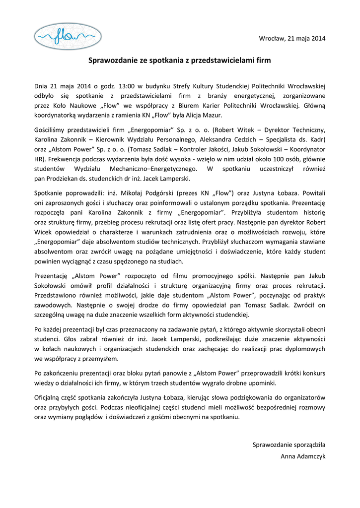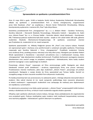 Wrocław, 21 maja 2014 Sprawozdanie ze spotkania z przedstawicielami firm Dnia 21 maja 2014 o godz. 13:00 w budynku Strefy Kultury Studenckiej Politechniki Wrocławskiej odbyło się spotkanie z przedstawicielami firm z branży energetycznej, zorganizowane przez Koło Naukowe „Flow” we współpracy z Biurem Karier Politechniki Wrocławskiej. Główną koordynatorką wydarzenia z ramienia KN „Flow” była Alicja Mazur. Gościliśmy przedstawicieli firm „Energopomiar” Sp. z o. o. (Robert Witek – Dyrektor Techniczny, Karolina Zakonnik – Kierownik Wydziału Personalnego, Aleksandra Cedzich – Specjalista ds. Kadr) oraz „Alstom Power” Sp. z o. o. (Tomasz Sadlak – Kontroler Jakości, Jakub Sokołowski – Koordynator HR). Frekwencja podczas wydarzenia była dość wysoka - wzięło w nim udział około 100 osób, głównie studentów Wydziału Mechaniczno–Energetycznego. W spotkaniu uczestniczył również pan Prodziekan ds. studenckich dr inż. Jacek Lamperski. Spotkanie poprowadzili: inż. Mikołaj Podgórski (prezes KN „Flow”) oraz Justyna Łobaza. Powitali oni zaproszonych gości i słuchaczy oraz poinformowali o ustalonym porządku spotkania. Prezentację rozpoczęła pani Karolina Zakonnik z firmy „Energopomiar”. Przybliżyła studentom historię oraz strukturę firmy, przebieg procesu rekrutacji oraz listę ofert pracy. Następnie pan dyrektor Robert Wicek opowiedział o charakterze i warunkach zatrudnienia oraz o możliwościach rozwoju, które „Energopomiar” daje absolwentom studiów technicznych. Przybliżył słuchaczom wymagania stawiane absolwentom oraz zwrócił uwagę na pożądane umiejętności i doświadczenie, które każdy student powinien wyciągnąć z czasu spędzonego na studiach. Prezentację „Alstom Power” rozpoczęto od filmu promocyjnego spółki. Następnie pan Jakub Sokołowski omówił profil działalności i strukturę organizacyjną firmy oraz proces rekrutacji. Przedstawiono również możliwości, jakie daje studentom „Alstom Power”, poczynając od praktyk zawodowych. Następnie o swojej drodze do firmy opowiedział pan Tomasz Sadlak. Zwrócił on szczególną uwagę na duże znaczenie wszelkich form aktywności studenckiej. Po każdej prezentacji był czas przeznaczony na zadawanie pytań, z którego aktywnie skorzystali obecni studenci. Głos zabrał również dr inż. Jacek Lamperski, podkreślając duże znaczenie aktywności w kołach naukowych i organizacjach studenckich oraz zachęcając do realizacji prac dyplomowych we współpracy z przemysłem. Po zakończeniu prezentacji oraz bloku pytań panowie z „Alstom Power” przeprowadzili krótki konkurs wiedzy o działalności ich firmy, w którym trzech studentów wygrało drobne upominki. Oficjalną część spotkania zakończyła Justyna Łobaza, kierując słowa podziękowania do organizatorów oraz przybyłych gości. Podczas nieoficjalnej części studenci mieli możliwość bezpośredniej rozmowy oraz wymiany poglądów i doświadczeń z gośćmi obecnymi na spotkaniu. Sprawozdanie sporządziła Anna Adamczyk