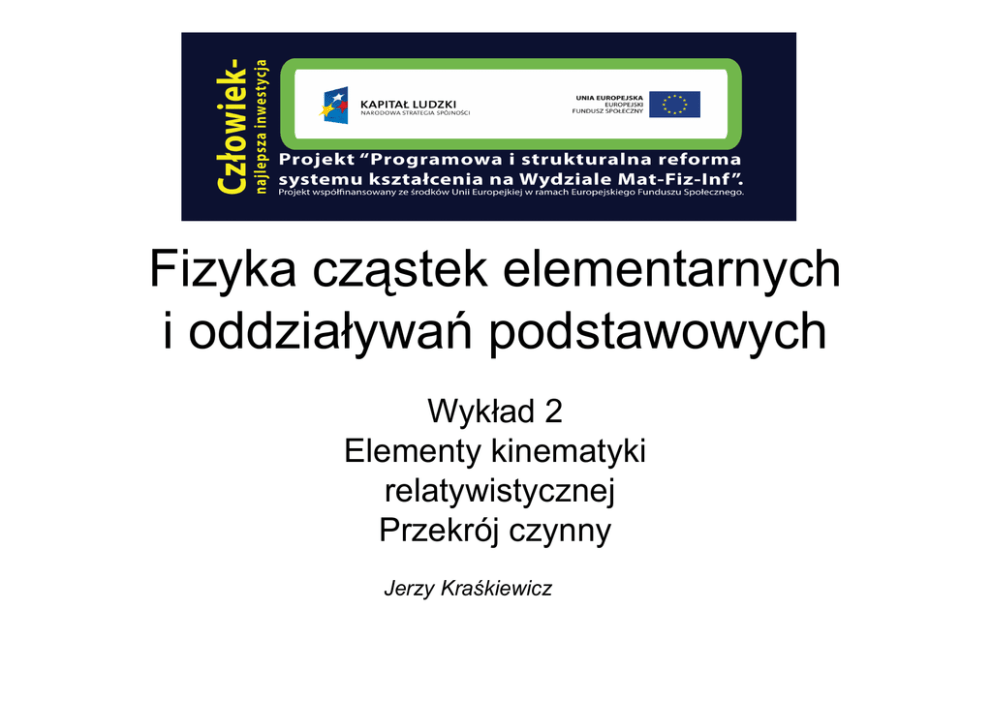 Fizyka cząstek elementarnych i oddziaływań podstawowych Wykład 2 Elementy kinematyki relatywistycznej Przekrój czynny Jerzy Kraśkiewicz Kinematyka relatywistyczna Czterowektory Czterowektor połoŜenia (c=1) Długość jako niezmiennik r2 x =t −x r2 x = (t , x , x , x ) = (t , x ) µ 1 2 3 2 Czterowektor pędu 2 r 2 2 2 2 r µ p = E − p = m p = ( E, px , p y , pz ) = ( E, p) Transformacja Lorentza Układ własny cząstki poruszającej się z prędkością v w układzie laboratoryjnym L-układ laboratoryjny E = γ E + β γ pz L p = px L x p = py L y p zL = γ p zL + β γ E γ= β= 1 1− β v c 2 E=m r r p=0 EL = γ m r pL = β γ m = β E L Niezmienniki relatywistyczne Zderzenie wiązka - tarcza Zderzenie wiązka - wiązka E1 >> m1 , M E1 , E2 >> m1 , m2 E2 = M r p2 = 0 r p1 E1 E1 r p1 r r s = ( p1 + p2 ) 2 = ( E1 + E2 ) 2 − ( p1 + p2 ) 2 Układ środka masy r r p1 + p2 = 0 2 s = W 2 = ( E1CM + E2CM ) 2 = ECM Układ laboratorium s = W = 2 ME1 + M + m 2 2 2 1 r p2 = 0 2 ECM s EL ≈ = 2m2 2m2 E2 r p2 Przekrój czynny wiązka cząstek padających detektor cząstka rozproszona θ na – gęstość cząstek padających [1/m3] v – prędkość cząstek padających [m/s] Nb – liczba cząstek w tarczy F = na v – strumień cząstek [1/(m2 s)] N – liczba oddziaływań s - przekrój czynny N N = σ= F N b na vN b Przekrój czynny Dla cząstek przeciwbieŜnych naleŜy doświadczalnie określić świetlność L, określającą ilość cząstek przechodzących przez powierzchnię 1 m2 w ciągu 1 s. N σ= L Szerokość połówkowa Dla cząstek nietrwałych określamy średni czas Ŝycia τ związany prawdopodobieństwem rozpadu: P = P0 e − t /τ Szerokość połówkową Γ określamy przez Γ= h τ [@] = [energia * czas] h = 6.58 × 10 −22 MeV s Przykład Cząstki rozpadające się w oddziaływaniach silnych (krótko Ŝyją) mają duŜą szerokość połówkowa, np. ρ(770) ma Γ = 151 MeV i τ = 4.4 10-24 s Cząstki rozpadające się w oddziaływaniach słabych (długo Ŝyją) mają małą szerokość połówkową np.. mezon K0 ma Γ = 7.3 10-12 MeV i τ = 0.9 10-10 s