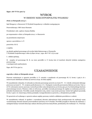 Sygn. akt VI Ga 350/14 WYROK W IMIENIU RZECZYPOSPOLITEJ POLSKIEJ Dnia 12 listopada 2014 r. Sąd Okręgowy w Rzeszowie VI Wydział Gospodarczy w składzie następującym: Przewodniczący: SSO Anna Harmata Protokolant: sekr. sądowy Joanna Stafska po rozpoznaniu w dniu 12 listopada 2014 r. w Rzeszowie na posiedzeniu niejawnym sprawy z powództwa: A. P. przeciwko: M. K. o zapłatę na skutek apelacji pozwanego od wyroku Sądu Rejonowego w Przemyślu V Wydziału Gospodarczego z dnia 23 lipca 2014r., sygn. akt V GC 175/14 upr I. oddala apelację, II. zasądza od pozwanego M. K. na rzecz powódki A. P. kwotę 600 zł (sześćset złotych) tytułem zastępstwa procesowego w postępowaniu apelacyjnym. Sygn. akt VI Ga 350/14 UZASADNIENIE wyroku z dnia 12 listopada 2014r. Pozwem wniesionym w sprawie powódka A. P. wniosła o zasądzenie od pozwanego M. K. kwoty 7.346,71 zł z ustawowymi odsetkami od dnia 29 czerwca 2013r. do dnia zapłaty. W uzasadnieniu wskazała, iż wykonała na zlecenia pozwanego przewóz na trasie W. - O. i zleciła wykonanie dalszego przewozu na trasie O. - W. swojemu podwykonawcy J. G.. Następnie wystawiła pozwanemu fakturę na kwotę 7 697,11 zł. Po wykonaniu umowy pozwany wystawił powódce notę obciążeniową na kwotę 350,40 zł za brak jednego kartonu przewożonego towaru. Pismem z dnia 27.08.2013r. powódka wezwała pozwanego do zapłaty za wykonany przewóz, jednakże bezskutecznie. Powódka uznała obciążenie notą, zatem w jej ocenie pozwany winien był zapłacić pozostałą kwotę 7.346,71 zł. stanowiącą różnicę pomiędzy wynagrodzeniem za przewóz, a obciążeniem powódki. W sprzeciwie od wydanego w sprawie nakazu zapłaty pozwany wniósł o oddalenie powództwa w całości. W uzasadnieniu wskazał, iż zgodnie z warunkami zlecenia zabronionym było przekazywanie do realizacji wyżej wymienionego zlecania innemu przewoźnikowi pod karą 100 % frachtu. Powódka przyjęła to zlecenie do realizacji, a następnie łamiąc warunek dotyczący zakazu zlecenia przewozu innej firmie, przekazała je do realizacji J. G.. Pozwany odmówił zapłaty ze względu na złamanie warunków zlecenia. Dodatkowo w trakcie rozładunku okazało się, że brakuje towar w ilości 1 kartonu, w związku z czym została wystawiona nota obciążeniowa nr (...). Sąd Rejonowy po przeprowadzeniu postępowania dowodowego wyrokiem z dnia 21 lipca 2014r. zasądził od pozwanego M. K. na rzecz powódki A. P. kwotę 7346,71 zł z odsetkami w wysokości ustawowej od dnia 29 czerwca 2013 do dnia zapłaty (I), oraz zasądził od pozwanego na rzecz powoda kwotę 1467 zł tytułem zwrotu kosztów procesu (II). W uzasadnieniu powyższego wyroku ustalił, iż w dniu 25 kwietnia 2013r. strony zawarły umowę przewozu towaru - wina marki (...) w 2268 kartonach po 6 butelek - z miejscowości C. we W. do miejscowości W. w Polsce. W umowie ustalono wysokość frachtu na kwotę 1850 EURO oraz iż zleceniobiorca nie będzie mógł przekazać realizacji zlecenia innemu przewoźnikowi, przy czym zakaz ten obwarowany został karą umowną w kwocie równej wysokości frachtu ustalonego w umowie. Powódka w terminie przewidzianym w umowie wykonała ciążące na niej zobowiązanie, dostarczając towar pozwanemu do miejscowości W., gdzie pozwany odebrał przedmiot umowy przewozu od powódki. Na trasie pomiędzy O. a W. powódka zleciła wykonanie dalszego przewozu J. G.. W związku z wykonanym przewozem powódka w dniu 14 maja 2013r. wystawiła fakturę VAT nr (...) na kwotę 7697,11 zł stanowiącą równowartość umówionego frachtu kwoty 1850 EURO. Pozwany nie uiścił należnej powódce kwoty z tytułu umowy przewozu w terminie wymienionym w fakturze to jest do dnia 28 czerwca 2013r. Pozwany w czasie odbioru przedmiotu umowy stwierdził brak w postaci jednego kartonu zawierającego 6 butelek wina, wobec czego wystawił powódce notę obciążeniową na kwotę 866,46 (...), w przeliczeniu 350,40 zł. Powódka w całości uznała obciążanie. W oparciu o powyższe Sąd Rejonowy dokonując rozważań prawnych wskazał, iż strony zawarły umowę przewozu, powódka wykonała ciążący na niej obowiązek przewozu w terminie określonym w umowie. Wykazana w postępowaniu okoliczność obciążenia powódki przez pozwanego kwotą 350,40 zł z uwagi na stwierdzony brak w składzie towaru stanowiącego przedmiot umowy przewozu nie miał wpływu na ocenę realizacji zlecenia przez powódkę ponieważ uznała ona roszczenie pozwanego w tym zakresie w całości i wystąpiła z żądaniem zapłaty kwoty stosunkowo pomniejszonej. Pozwany odmówił zapłaty należnego powódce frachtu z uwagi na naruszanie zastrzeżenia umownego zakazującego przewoźnikowi przekazania realizacji zlecenia dalszemu przewoźnikowi, które obwarowane zostało karą umowną w kwocie równej wysokości frachtu ustalonego w umowie przewozu. Sąd Rejonowy nie zgodził się ze stanowiskiem pozwanego co do dopuszczalności ustalenia umownego w zakresie postanowienia umowy zgodnie z którym przewoźnik nie był uprawniony do przekazania zlecenia innemu przewoźnikowi. W ocenie tegoż Sądu postanowienia umowne w tym przedmiocie były sprzeczne z treścią 789 § 1 KC w zakresie, w którym wyłączały uprawnienie przewoźnika do oddania przesyłki innemu przewoźnikowi na całą przestrzeń przewozu lub część. Konsekwencją niniejszego Sąd Rejonowy uczynił nieważność tego zakresu umowy na zasadzie art. 58 § 3 KC. Stąd zważywszy na fakt, iż powódka wykonała należycie swoje zobowiązanie dostarczając towar pozwanego w umówionym terminie na wskazane miejsce, należną jej była kwota frachtu po obniżeniu go o kwotę 350,40 zł w związku z wystawioną przez pozwanego notą obciążeniową. Apelację od powyższego wyroku wniosła strona pozwana, zaskarżając wyrok ten w całości i zarzucając mu naruszenie przepisów prawa materialnego to jest przepisu akt 789 § 1 KC poprzez jego błędną wykładnię oraz uznanie, ż