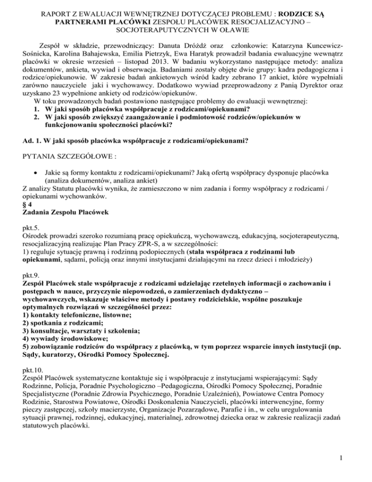 RAPORT Z EWALUACJI WEWNĘTRZNEJ DOTYCZĄCEJ PROBLEMU : RODZICE SĄ PARTNERAMI PLACÓWKI ZESPOŁU PLACÓWEK RESOCJALIZACYJNO – SOCJOTERAPUTYCZNYCH W OŁAWIE Zespół w składzie, przewodniczący: Danuta Dróżdż oraz członkowie: Katarzyna KuncewiczSośnicka, Karolina Bahajewska, Emilia Pietrzyk, Ewa Haratyk prowadził badania ewaluacyjne wewnątrz placówki w okresie wrzesień – listopad 2013. W badaniu wykorzystano następujące metody: analiza dokumentów, ankieta, wywiad i obserwacja. Badaniami zostały objęte dwie grupy: kadra pedagogiczna i rodzice/opiekunowie. W zakresie badań ankietowych wśród kadry zebrano 17 ankiet, które wypełniali zarówno nauczyciele jaki i wychowawcy. Dodatkowo wywiad przeprowadzony z Panią Dyrektor oraz uzyskano 23 wypełnione ankiety od rodziców/opiekunów. W toku prowadzonych badań postawiono następujące problemy do ewaluacji wewnętrznej: 1. W jaki sposób placówka współpracuje z rodzicami/opiekunami? 2. W jaki sposób zwiększyć zaangażowanie i podmiotowość rodziców/opiekunów w funkcjonowaniu społeczności placówki? Ad. 1. W jaki sposób placówka współpracuje z rodzicami/opiekunami? PYTANIA SZCZEGÓŁOWE : Jakie są formy kontaktu z rodzicami/opiekunami? Jaką ofertą współpracy dysponuje placówka (analiza dokumentów, analiza ankiet) Z analizy Statutu placówki wynika, że zamieszczono w nim zadania i formy współpracy z rodzicami / opiekunami wychowanków. §4 Zadania Zespołu Placówek pkt.5. Ośrodek prowadzi szeroko rozumianą pracę opiekuńczą, wychowawczą, edukacyjną, socjoterapeutyczną, resocjalizacyjną realizując Plan Pracy ZPR-S, a w szczególności: 1) reguluje sytuację prawną i rodzinną podopiecznych (stała współpraca z rodzinami lub opiekunami, sądami, policją oraz innymi instytucjami działającymi na rzecz dzieci i młodzieży) pkt.9. Zespół Placówek stale współpracuje z rodzicami udzielając rzetelnych informacji o zachowaniu i postępach w nauce, przyczynie niepowodzeń, o zamierzeniach dydaktyczno – wychowawczych, wskazuje właściwe metody i postawy rodzicielskie, wspólne poszukuje optymalnych rozwiązań w szczególności przez: 1) kontakty telefoniczne, listowne; 2) spotkania z rodzicami; 3) konsultacje, warsztaty i szkolenia; 4) wywiady środowiskowe; 5) zobowiązanie rodziców do współpracy z placówką, w tym poprzez wsparcie innych instytucji (np. Sądy, kuratorzy, Ośrodki Pomocy Społecznej. pkt.10. Zespół Placówek systematyczne kontaktuje się i współpracuje z instytucjami wspierającymi: Sądy Rodzinne, Policja, Poradnie Psychologiczno –Pedagogiczna, Ośrodki Pomocy Społecznej, Poradnie Specjalistyczne (Poradnie Zdrowia Psychicznego, Poradnie Uzależnień), Powiatowe Centra Pomocy Rodzinie, Starostwa Powiatowe, Ośrodki Doskonalenia Nauczycieli, placówki interwencyjne, formy pieczy zastępczej, szkoły macierzyste, Organizacje Pozarządowe, Parafie i in., w celu uregulowania sytuacji prawnej, rodzinnej, edukacyjnej, materialnej, zdrowotnej dziecka oraz w zakresie realizacji zadań statutowych placówki. 1 §5 Zespół Do Spraw Planowania i Koordynowania Udzielania Uczniom Pomocy PsychologicznoPedagogicznej pkt.2. Do zadań Zespołu należy: 3) ustalanie, na wniosek rodziców wychowanka, zakresu współpracy z wychowankiem i jego rodziną, po opuszczeniu przez wychowanka placówki § 13 Organizacja Zespołu Placówek i grup wychowawczych 9. Wychowawca jest odpowiedzialny za realizację indywidualnego programu edukacyjnoterapeutycznego (IPE-T). Wychowawca współpracuje w tym zakresie z zespołem ds. planowania i koordynowania udzielania uczniom pomocy psychologiczno –pedagogicznej, z innymi pracownikami Zespołu Placówek, rodzicami (prawnymi opiekunami) i instytucjami działającymi w środowisku lokalnym. Z analizy ankiet dla kadry wynika, iż najczęściej preferowaną formą kontaktów w tym zakresie są rozmowy telefoniczne (15 wskazań), następnie spotkania przy okazji odwiedzin dziecka w placówce (13 wskazań), dalej spotkania indywidualne- zaproszenie na rozmowę (11 wskazań). Rzadziej kadra wykorzystuje takie formy jak zebrania ogólne (6 wskazań), spotkania przy okazji imprez organizowanych w placówce (5 wskazań) oraz kontakt mailowy (1 wskazanie). Rodzice/ opiekunowie są w tej kwestii zgodni ze wskazaniami kadry, przyznają, iż najczęstszą formą kontaktów są rozmowy telefoniczne (21 wskazań), dalej w kolejności: spotkania przy okazji odwiedzin dziecka w placówce ( 19), spotkania indywidualne- zaproszenie na rozmowę (7), zebrania ogólne (7) . Rodzice/opiekunowie wskazali jeszcze możliwość kontaktu przy okazji przywożenia i odwożenia dziecka do placówki. Natomiast żaden z ankietowanych nie zaznaczył odpowiedzi związanej z możliwością kontaktu przy okazji imprez organizowanych w placówce lub mailowo. Pani Dyrektor w wywiadzie również potwierdza, iż dominującą formą kontaktu jest rozmowa telefoniczna oraz spotkanie indywidualne poza wyznaczonymi godzinami. 25 Formy kontaktu rodziców z placówką 20 15 10 Kadra Rodzice 5 0 2 Jakiego wsparcia rodzicom/opiekunom dostarcza placówka? (analiza dokumentów, ankieta dla kadry, ankieta dla rodziców, wywiad z Dyrektorem) Określeniu rodzaju wsparcia zapewnianego rodzicom/opiekunom placówki przez kadrę służyło pytanie „W jaki sposób starają się Państwo wspierać rodziców/opiekunów podopiecznych w prawidłowym wychowaniu dzieci? Wszyscy pracownicy wskazują, iż starają się wspierać rodziców/ opiekunów poprzez utrzymywanie stałego kontaktu indywidualnego lub telefonicznego. Najczęściej wsparcie przez kadrę rozumiane jest jako przekazywane na bieżąco informacji na temat zachowania i postępów w nauce dziecka. 6 osób wskazało, iż dostarcza wsparcia w postaci udzielania wskazówek wychowawczych podczas rozmów. W odpowiedziach pojawiły się również konkretne przykłady: przypominanie o konsekwentnym postępowaniu wobec dziecka, ustalaniu i przes