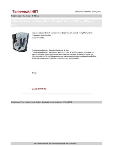 Taniewozki.NET Utworzono: czwartek, 02 luty 2012 Foteliki samochodowe > 9-18 kg Fotelik samochodowy Bebe Confort Axiss 9-18 kg Playful Grey Nazwa produktu: Fotelik samochodowy Bebe Confort Axiss 9-18 kg Playful Grey Producent: Bebe Confort Model produktu: - Fotelik samochodowy Bebe Confort Axiss 9-18kg Fotelik samochodowy dla dzieci o wadze od 9 do 18 kg. Montowany 3-punktowym samochodowym pasem bezpieczeństwa, zawsze przodem do kierunku jazdy, na tylnym siedzeniu. W foteliku zastosowano najnowocześniejsze rozwiązania techniki z dziedziny zabezpieczeń dzieci w czasie podroży samochodem. Cena: 899.00zł Dostępność: Ten produkt został dodany do sklepu w dniu czwartek, 02 luty 2012 http://www.taniewozki.net | [email protected] | | Strona 1/1