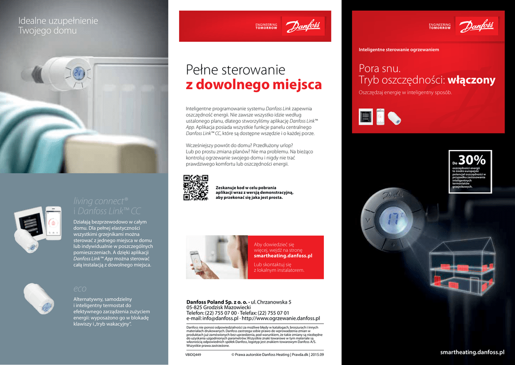 Idealne uzupełnienie Twojego domu Inteligentne sterowanie ogrzewaniem Pełne sterowanie z dowolnego miejsca Pora snu. Tryb oszczędności: włączony Oszczędzaj energię w inteligentny sposób. Inteligentne programowanie systemu Danfoss Link zapewnia oszczędność energii. Nie zawsze wszystko idzie według ustalonego planu, dlatego stworzyliśmy aplikację Danfoss Link™ App. Aplikacja posiada wszystkie funkcje panelu centralnego Danfoss Link™ CC, które są dostępne wszędzie i o każdej porze. Wcześniejszy powrót do domu? Przedłużony urlop? Lub po prostu zmiana planów? Nie ma problemu. Na bieżąco kontroluj ogrzewanie swojego domu i nigdy nie trać prawdziwego komfortu lub oszczędności energii. Zeskanuje kod w celu pobrania aplikacji wraz z wersją demonstracyjną, aby przekonać się jaka jest prosta. living connect® i Danfoss Link™ CC Działają bezprzewodowo w całym domu. Dla pełnej elastyczności wszystkimi grzejnikami można sterować z jednego miejsca w domu lub indywidualnie w poszczególnych pomieszczeniach. A dzięki aplikacji Danfoss Link™ App można sterować całą instalacją z dowolnego miejsca. Do 30% oszczędności energii to średni europejski potencjał oszczędności w przypadku zastosowania inteligentnych termostatów grzejnikowych. Aby dowiedzieć się więcej, wejdź na stronę smartheating.danfoss.pl Lub skontaktuj się z lokalnym instalatorem. eco Alternatywny, samodzielny i inteligentny termostat do efektywnego zarządzenia zużyciem energii: wyposażono go w blokadę klawiszy i „tryb wakacyjny”. Danfoss Poland Sp. z o. o. · ul. Chrzanowska 5 05-825 Grodzisk Mazowiecki Telefon: (22) 755 07 00 · Telefax: (22) 755 07 01 e-mail: [email protected] · http://www.ogrzewanie.danfoss.pl Danfoss nie ponosi odpowiedzialności za możliwe błędy w katalogach, broszurach i innych materiałach drukowanych. Danfoss zastrzega sobie prawo do wprowadzenia zmian w produktach już zamówionych bez uprzedzenia, pod warunkiem, że takie zmiany są niezbędne do uzyskania uzgodnionych parametrów. Wszystkie znaki towarowe w tym materiale są własnością odpowiednich spółek Danfoss, logotyp jest znakiem towarowym Danfoss A/S. Wszystkie prawa zastrzeżone. VBIDQ449 © Prawa autorskie Danfoss Heating | Pravda.dk | 2015.09 smartheating.danfoss.pl Obniżenie temperatury o 1°C pozwała ograniczyć zużycie energii średnio o 5% Jak uzyskać oszczędności zużywanej energii: Jak stare są Twoje termostaty grzejnikowe? Aby osiągnąć oszczędności energii, trzeba wziąć pod uwagę kilka kwestii: • Jeśli wymienisz stare termostaty grzejnikowe (starsze niż 15 lat) na inteligentne termostaty Danfoss, oszczędzisz nawet do 23% swojego zużycia energii. • Jeśli wymienisz stare ręczne zawory grzejnikowe na inteligentne termostaty Danfoss, oszczędzisz nawet do 46% swojego zużycia energii. • Upewnij się, że instalacja grzewcza jest właściwie zoptymalizowana do oczekiwanych ustawień temperatury (skonsultuj się z instalatorem). 1943 1961 1969 1979 1985 1994 2003 • Ustaw tę samą temperaturę co przed zamianą termostatów. • Warunki zewnętrzne wpływają na roczny poziom zużycia energii (kWh). Przykłady warunków zewnętrznych: darmowe ogrzewanie (np. słońce), temperatura zewnętrzna, korzystanie z kuchenki podczas gotowania, wiatr, itd. • Dla okresów nieobecności lub snu obniż temperaturę do 17°C. • Wybierając się na urlop, włączaj „tryb wakacyjny”. • Jeśli dla różnych pomieszczeń ustawiasz inne temperatury, pamiętaj o zamykaniu drzwi między nimi. • Budynki z cegieł i betonu (konstrukcje ciężkie) zatrzymują ciepło lepiej niż lekkie konstrukcje z drewna i gipsu. Także budynki z dobrą izolacją lepiej zatrzymują ciepło. Jeśli budynek należy do ciężkich konstrukcji i ma dobrą izolację, osiągnięcie 30% oszczędności energii może być trudne. Ważne: Aby oszczędzać energię, trzeba obniżać temperaturę w pomieszczeniach. Inteligentne termostaty Danfoss będą robiły to automatycznie. 2011 Co oznacza oszczędność energii? Możesz zaoszczędzić do 30% energii używanej do ogrzewania „przestrzeni”: zwykle dwie trzecie całkowitego rachunku za ogrzewanie to ogrzewanie pomieszczeń. Rachunek za ogrzewanie może obejmować także koszt ciepłej wody oraz koszty stałe (tylko w przypadku systemów ciepłowniczych). Do 30% to średni europejski potencjał oszczędności w przypadku stosowania inteligentnych termostatów grzejnikowych. • Przed zainstalowaniem inteligentnych termostatów Danfoss instalacja grzewcza miała już funkcję nocnego obniżania temperatury (pompa ciepła, kocioł) lub temperatura była obniżana na noc ręcznie. 2015 Inteligentna i elegancka odsłona Termostat living connect® był pierwszym termostatem elektronicznym, który uzyskał prestiżowy certyfikat energetyczny AA stowarzyszenia eu.bac (European Building Automation and Controls Manufacturers’ Association, www.eubac.org). 212200