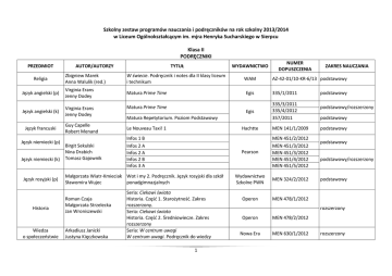 Szkolny zestaw programów nauczania i podręczników na rok szkolny 2013/2014 w Liceum Ogólnokształcącym im. mjra Henryka Sucharskiego w Sierpcu Klasa II PODRĘCZNIKI PRZEDMIOT TYTUŁ WYDAWNICTWO Zbigniew Marek Anna Walulik (red.) W świecie. Podręcznik i notes dla II klasy liceum i technikum WAM Język angielski (p) Virginia Erans Jenny Dodey Matura Prime Time Język angielski (k) Virginia Erans Jenny Dodey Religia Język francuski Język niemiecki (p) Język niemiecki (k) Język rosyjski (p) Historia Wiedza o społeczeństwie AUTOR/AUTORZY Matura Prime Time Le Nouveau Taxi! 1 Birgit Sekulski Nina Drabich Tomasz Gajownik Infos 1 B Infos 2 A Infos 2 A Infos 2 B Infos 3 A Małgorzata Wiatr-Kmieciak Wot i my 2. Podręcznik. Język rosyjski dla szkół Sławomira Wujec ponadgimnazjalnych Roman Czaja Małgorzata Strzelecka Jan Wroniszewski Arkadiusz Janicki Justyna Kięczkowska Seria: Ciekawi świata Historia. Część 1. Starożytność. Zakres rozszerzony. Seria: Ciekawi świata Historia. Część 2. Średniowiecze. Zakres rozszerzony Seria: W centrum uwagi W centrum uwagi. Podręcznik do wiedzy 1 ZAKRES NAUCZANIA AZ-42-01/10-KR-6/13 podstawowy Egis 335/1/2011 Egis 335/3/2011 335/4/2012 357/2011 Matura Repetytorium. Poziom Podstawowy Guy Capelle Robert Menand NUMER DOPUSZCZENIA Hachtte MEN 141/1/2009 Pearson MEN 451/2/2012 MEN 451/3/2012 MEN 451/3/2012 MEN 451/4/2012 MEN 451/5/2012 Wydawnictwo Szkolne PWN MEN 324/2/2012 Operon MEN 478/1/2012 podstawowy podstawowy/rozszerzony podstawowy podstawowy podstawowy podstawowy/rozszerzony podstawowy rozszerzony Operon MEN 478/2/2012 Nowa Era MEN 630/1/2012 rozszerzony Mariusz Menz Geografia Roman Malarz Roman Więckowski o społeczeństwie dla liceum i technikum. Zakres rozszerzony. Część 1 Seria: Oblicza geografii. Oblicza geografii. Część 1. Geografia fizyczna. Podręcznik dla liceów i techników. Zakres rozszerzony Nowa Era MEN 501/1/2012 rozszerzony Biologia Marek Guzik Ewa Jastrzębska Ryszard Kozik Renata Matuszewska Ewa Pyłka-Gutowska Władysław Zamachowski Seria: Biologia na czasie. Biologia na czasie 1. Podręcznik dla liceum ogólnokształcącego i technikum. Zakres rozszerzony Nowa Era MEN 564/1/2012 rozszerzony Chemia Maria Litwin Szarota Styka-Wlazło Joanna Szymańska Seria: To jest chemia. To jest chemia 1. Chemia ogólna i nieograniczona. Podręcznik dla szkół liceum ogólnokształcącego i technikum. Zakres rozszerzony Nowa Era MEN 528/1/2012 rozszerzony Fizyka Maria Fiałkowska Barbara Saganowska Jadwiga Salach Z fizyką w przyszłość. Podręcznik dla szkół ponadgimnazjalnych. Zakres rozszerzony Zamkor MEN 548/1/2012 rozszerzony MEN 540/2/2012 podstawowy Alina Przychoda Zygmunt Łaszczyk Matematyka. Poznać, zrozumieć. Kształcenie w zakresie podstawowym. Podręcznik dla liceum i technikum. Klasa 2 Matematyka. Poznać, zrozumieć. Kształcenie w zakresie rozszerzonym. Podręcznik dla liceum i technikum. Klasa 2 MEN 582/2/2013 rozszerzony Wydawnictwo Szkolne PWN MEN 395/1/2011 rozszerzony WSiP MEN 644/1/2013 podstawowy Matematyka Informatyka Historia i społeczeństwo Zbigniew Talaga Informatyka nie tylko dla uczniów. Tom I. Zakres rozszerzony. Szkoła ponadgimnazjalna Marcin Markowicz Olga Pytlińska Agata Wyroda Historia i społeczeństwo. Ojczysty Panteon i ojczyste spory. Podręcznik do liceum i technikum 2 WSiP PROGRAMY PRZEDMIOT NAZWA PROGRAMU Religia Świadek Chrystusa. Katecheza świadectwa wiary. Program nauczania religii dla liceum Język polski Przeszłość to dziś. Program nauczania języka polskiego w liceum ogólnokształcącym, liceum profilowanym i technikum. Zakres podstawowy i rozszerzony Język angielski Język francuski Język niemiecki Język rosyjski Język rosyjski Język rosyjski Historia Program nauczania języka angielskiego. Kurs kontynuacyjny (IV.1) dla szkół ponadgimnazjalnych zgodny z nową podstawą programową obowiązującą od 2012 roku Modyfikacja programu nauczania języka francuskiego jako drugiego języka obcego nowożytnego – od poziomu zerowego dla szkół ponadgimnazjalnych autorstwa Jolanty Kamińskiej, Marzeny Pelcer, Zofii Lis Modyfikacja programu nauczania języka niemieckiego autorstwa p. E. Muszyńskiej [Program nauczania języka niemieckiego dla liceum ogólnokształcącego, liceum profilowanego i technikum. IV etap edukacyjny, podstawa programowa IV.0 i IV.1 według podstawy programowej kształcenia ogólnego z dnia 23 grudnia 2008 r.] Program nauczania języka rosyjskiego w szkołach ponadgimnazjalnych. Kurs podstawowy Program nauczania języka rosyjskiego w szkołach ponadgimnazjalnych. Kurs kontynuacyjny. Zakres podstawowy Program nauczania języka rosyjskiego w szkołach ponadgimnazjalnych. Kurs podstawowy Seria: Ciekawi świata Historia. Program nauczania dla szkół ponadgimnazjalnych. Zakres rozszerzony Wiedza o społeczeństwie W centrum uwagi. Program nauczania wiedzy o społeczeństwie dla liceum i technikum. Zakres rozszerzony Geografia Program nauczania geografii w zakresie rozszerzonym dla liceum i technikum – Oblicza geografii 3 Autor/Autorzy Komisja Wychowania Katolickiego KEP Zofia Starownik Jacek Kopciński Jarosław Łachnik Krzysztof Mrowcewicz Aleksander Nawarecki Ewa Paczoska Dorota Siwicka Magdalena Kębłowska Eliza Pilewska Ewa Muszyńska Agata Buchowiecka-Fudała Agata Buchowiecka-Fudała Agata Buchowiecka-Fudała Cezary Tulin Mariusz Menz Ewa Maria Tuz Dawid Szczypiński Biologia Chemia Fizyka Matematyka Informatyka Wychowanie fizyczne Historia i społeczeństwo Przyroda Edukacja prawna Podstawy warsztatu dziennikarskiego Elementy rysunku technicznego Grafika komputerowa w biznesie Biologia na czasie. Program nauczania biologii w zakresie rozszerzonym dla szkół ponadgimnazjalnych To jest chemia. Program nauczania chemii w zakresie rozszerzonym dla liceum ogólnokształcącego i technikum Urszula Poziomek Maria Litwin Szarota Styka-Wlazło Maria Fiałkowska Z fizyką w przyszłość. Program nauczania. Szkoła ponadgimnazjalnych