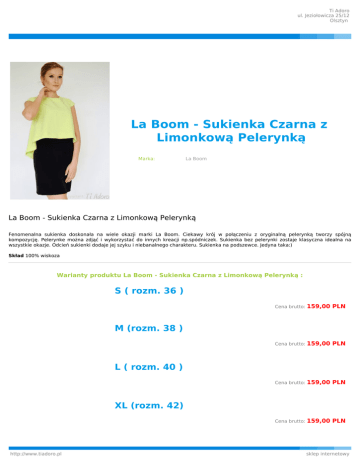 Ti Adoro ul. Jeziołowicza 25/12 Olsztyn La Boom - Sukienka Czarna z Limonkową Pelerynką Marka: La Boom La Boom - Sukienka Czarna z Limonkową Pelerynką Fenomenalna sukienka doskonała na wiele okazji marki La Boom. Ciekawy krój w połączeniu z oryginalną pelerynką tworzy spójną kompozycję. Pelerynke można zdjąć i wykorzystać do innych kreacji np.spódniczek. Sukienka bez pelerynki zostaje klasyczna idealna na wszystkie okazje. Odcień sukienki dodaje jej szyku i niebanalnego charakteru. Sukienka na podszewce. Jedyna taka:) Skład 100% wiskoza Warianty produktu La Boom - Sukienka Czarna z Limonkową Pelerynką : S ( rozm. 36 ) Cena brutto: 159,00 PLN Cena brutto: 159,00 PLN Cena brutto: 159,00 PLN Cena brutto: 159,00 PLN M (rozm. 38 ) L ( rozm. 40 ) XL (rozm. 42) http://www.tiadoro.pl sklep internetowy