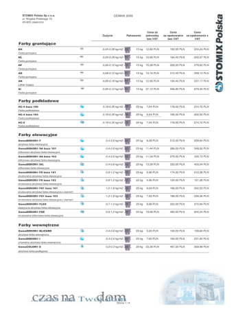 STOMIX Polska Sp z o.o. ul. Wojska Polskiego 15 43-603 Jaworzno CENNIK 2009 Zu ycie Pakowanie Cena za jednostk bez VAT Cena za opakowanie bez VAT Cena za opakowanie z VAT 0,05-0,09 kg/m2 15 kg 12,80 PLN 192,00 PLN 234,24 PLN 0,05-0,09 kg/m2 15 kg 10,96 PLN 164,40 PLN 200,57 PLN 0,06-0,12 kg/m2 15 kg 15,28 PLN 229,20 PLN 279,62 PLN 0,08-0,12 kg/m2 15 kg 14,16 PLN 212,40 PLN 259,13 PLN 0,06-0,18 kg/m2 15 kg 12,96 PLN 194,40 PLN 237,17 PLN 0,06-0,12 kg/m2 15 kg 37,12 PLN 556,80 PLN 679,30 PLN 0,19-0,35 kg/m2 25 kg 7,04 PLN 176,00 PLN 214,72 PLN 0,19-0,35 kg/m2 25 kg 6,64 PLN 166,00 PLN 202,52 PLN 0,19-0,35 kg/m2 25 kg 7,04 PLN 176,00 PLN 214,72 PLN 0,4-0,6 kg/m2 25 kg 8,48 PLN 212,00 PLN 258,64 PLN 0,4-0,6 kg/m2 25 kg 11,44 PLN 286,00 PLN 348,92 PLN 0,4-0,6 kg/m2 25 kg 11,04 PLN 276,00 PLN 336,72 PLN 0,4-0,6 kg/m2 25 kg 13,28 PLN 332,00 PLN 405,04 PLN 0,8-1,2 kg/m2 25 kg 6,96 PLN 174,00 PLN 212,28 PLN 0,8-1,2 kg/m2 25 kg 4,96 PLN 124,00 PLN 151,28 PLN 1,2-1,8 kg/m2 25 kg 6,64 PLN 166,00 PLN 202,52 PLN 1,2-1,8 kg/m2 25 kg 7,52 PLN 188,00 PLN 229,36 PLN 0,7-1,0 kg/m2 25 kg 8,88 PLN 222,00 PLN 270,84 PLN 0,8-1,2 kg/m2 25 kg 19,68 PLN 492,00 PLN 600,24 PLN 0,4-0,6 kg/m2 25 kg 5,20 PLN 130,00 PLN 158,60 PLN 0,4-0,6 kg/m2 25 kg 7,60 PLN 190,00 PLN 231,80 PLN 0,2-0,3 kg/m2 20 kg 23,36 PLN 467,20 PLN 569,98 PLN Farba guntujaca Farba guntujaca Farba guntujaca Farba guntujaca Lakier kryj cy Farba guntujaca ! "## Farba podkładowa ! "#$ Farba podkładowa % Farba podkładowa & ' ( )*+ akrylowa farba elewacyjna ' ( )*+ ! "#" silikonowo akrylowa farba elewacyjna ' ( )*+ ! "#$ silikonowo akrylowa farba elewacyjna ' ( )*+ silikonowa farba elewacyjna ' ( )*+ ! "#" strukturalna akrylowa farba elewacyjna ' ( )*+ ! "#$ strukturalna akrylowa farba elewacyjna ' ( )*+ " ! "#" strukturalna akrylowa farba elewacyjna z ziarnem ' ( )*+ " ! "#$ strukturalna akrylowa farba elewacyjna z ziarnem ' ( )*+ , elastyczna akrylowa farba elewacyjna ' ( )*+ strukturalna silikonowa farba elewacyjna - ! ' ( )*+ . / * akrylowa farba wewn trzna ' ( )*+ zmywalna akrylowa farba wewn trzna ' ( ) )*+ akrylowa farba podłogowa Strona 1 / 4 STOMIX Polska Sp z o.o. ul. Wojska Polskiego 15 43-603 Jaworzno CENNIK 2009 Zu ycie 0 1 & 2 1! Pakowanie Cena za jednostk bez VAT Cena za opakowanie bez VAT Cena za opakowanie z VAT 3& wg zastosowania (szara) wg zastosowania (biała) 25 kg 25 kg 1,95 PLN 2,19 PLN 48,75 PLN 54,75 PLN 59,48 PLN 66,80 PLN wg zastosowania (szara) 25 kg 1,52 PLN 38,00 PLN 46,36 PLN wg zastosowania (szara) wg zastosowania (biała) 25 kg 25 kg 2,53 PLN 2,71 PLN 63,25 PLN 67,75 PLN 77,17 PLN 82,66 PLN wg zastosowania (biała) 25 kg 4,79 PLN 119,75 PLN 146,10 PLN 0,3-1,0 kg/m2 25 kg 6,72 PLN 168,00 PLN 204,96 PLN 20 kg 10,48 PLN 209,60 PLN 255,71 PLN 0,3-0,6 kg/m2 20 kg 5,68 PLN 113,60 PLN 138,59 PLN 1,65 kg/m2 (szary) * (biały) * 25 kg 25 kg 1,10 PLN 1,35 PLN 27,50 PLN 33,75 PLN 33,55 PLN 41,18 PLN 1,5 kg/m2 (szary) * (biały) * 20 kg 20 kg 1,43 PLN 1,66 PLN 28,60 PLN 33,20 PLN 34,89 PLN 40,50 PLN 1,5 kg/m2 * 25 kg 2,24 PLN 56,00 PLN 68,32 PLN 1,5 - 3 kg/m2 25 kg 0,88 PLN 22,00 PLN 26,84 PLN 1,5 - 3 kg/m2 25 kg 1,44 PLN 36,00 PLN 43,92 PLN 3,5-4,0 kg/m2 25 kg 7,04 PLN 176,00 PLN 214,72 PLN 5,5-6,0 kg/m2 25 kg 7,04 PLN 176,00 PLN 214,72 PLN 3,5-4,0 kg/m2 25 kg 7,04 PLN 176,00 PLN 214,72 PLN "# 66 szt/m2 5 m2 39,91 PLN 199,55 PLN 243,45 PLN struktura rustykalna . 2 4& 7 "# 66 szt/m2 5 m2 43,90 PLN 219,50 PLN 267,79 PLN 2,4-4,0 kg/m2 25 kg 5,04 PLN 126,00 PLN 153,72 PLN 2,4-4,0 kg/m2 25 kg 4,72 PLN 118,00 PLN 143,96 PLN 2,4-4,0 kg/m2 25 kg 7,52 PLN 188,00 PLN 229,36 PLN 2,4-4,0 kg/m2 25 kg 7,12 PLN 178,00 PLN 217,16 PLN 2,0-3,2 kg/m2 (biała) 25 kg 2,44 PLN 61,00 PLN 74,42 PLN 2,9-4,4 kg/m2 25 kg 6,80 PLN 170,00 PLN 207,40 PLN 2,4-4,0 kg/m2 25 kg 4,46 PLN 111,50 PLN 136,03 PLN &4 ,+ " sucha masa klejowo szpachlowa &4 ,+ 5 sucha masa klejowa &4 ,+ "" wysoko spr &4 ysta masa klejowo szpachlowa ,+ 6 jednoskładnikowa masa klejowowo szpachlowa &4 ,+ jednoskładnikowa masa klejowa &4 ,+ . akrylowa masa klejowa &4 ,+ 6 akrylowa masa klejowa do cienkowarstwowego klejenia &4 )*0+ sucha masa szpachlowa wyrównuj ca &4 )*0+ . sucha wygładzajaca masa szpachlowa &4 )*0+ sucha samopoziomuj ca masa podłogowa . ,+ . sucha masa klejowa do płytek ceramicznych . ,+ sucha masa flexybilna do płytek ceramicznych * zu ycie na 1 mm grubo ci 6 2( ! 2 &4 )* mozaikowy tynk dekoracyjny, wielko &4 )* ' mozaikowy tynk dekoracyjny, wielko &4 ziarna 1,0-1,5 mm )* mozaikowy tynk dekoracyjny, wielko 1 . 2 ziarna 0,6-1,0 mm (. 2 4& 7 * ziarna 0,2-2,0 mm & 7 struktura "stara cegła" 6 . 2 1 & )*+ & ! "## akrylowy tynk rozcierany lub kornik . )*+ & ! "#$ akrylowy tynk rozcierany lub kornik . )*+ & silikonowy tynk rozcierany lub kornik . )*+ 8 & 8 silikatowy tynk rozcierany l ub kornik . )*+ & mineralny uszlachetniony tynk rozcierany lub kornik . )*+ , elastyczny tynk akrylowy, rozcierany . )*+ & tynk wewn trzny akrylowy, rozcierany lub kornik Strona 2 / 4 STOMIX Polska Sp z o.o. ul. Wojska Polskiego 15 43-603 Jaworzno CENNIK 2009 Zu ycie Pakowanie Cena za jednostk bez VAT Cena za opakowanie bez VAT Cena za opakowanie z VAT 0 1 . )*0+ 0,55-0,80 kg/m2 (szara)* (biała) * 20 kg 20 kg 3,84 PLN 4,64 PLN 76,80 PLN 92,80 PLN 93,70 PLN 113,22 PLN 0,75-0,90 kg/m2 (szara) *** 20 kg 5,36 PLN 107,20 PLN 130,78 PLN 1,95 kg/m2 (szara) ** 25 kg 1,68 PLN 42,00 PLN 51,24 PLN 1,95 kg/m2 (szara) ** 25 kg 1,68 PLN 42,00 PLN 51,24 PLN 1,95 kg/m2 (szara) ** 20 kg 2,56 PLN 51,20 PLN 62,46 PLN 50 mb 3,78 PLN 189,00 PLN 230,58 PLN #" mi dzywarstwa adhezyjna . )*0+ #5 warstwa ochronna . )*0+ #% drobnoziarnista masa naprawcza . )*0+ #9 gruboziarnista masa naprawcza . )*0+ #: masa wygładzaj ca * zu ycie na 1 warstw ** zu ycie na 1 mm grubo ci ***tylko 1 warstwa grubo ci 1 mm 12 86" siatka z włókna szklanego Dodatek za konfekcjonowanie; za opakowanie 15 kg za opakowanie 5 kg & 6,5 PLN/szt. 4,5 PLN/szt. ; Farby/Tynki 0,80 PLN 1,60 PLN 3,80 PLN 8,80 PLN indywidualna wycena 1 2 3, 4 A, B,
