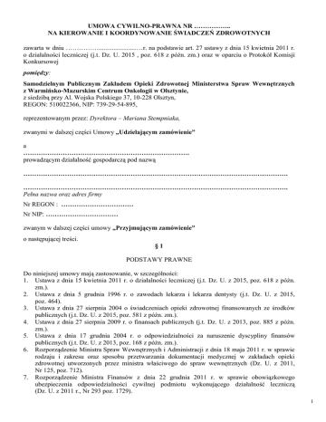 UMOWA CYWILNO-PRAWNA NR …………….. NA KIEROWANIE I KOORDYNOWANIE ŚWIADCZEŃ ZDROWOTNYCH zawarta w dniu …………….......................…r. na podstawie art. 27 ustawy z dnia 15 kwietnia 2011 r. o działalności leczniczej (j.t. Dz. U. 2015 , poz. 618 z późn. zm.) oraz w oparciu o Protokół Komisji Konkursowej pomiędzy: Samodzielnym Publicznym Zakładem Opieki Zdrowotnej Ministerstwa Spraw Wewnętrznych z Warmińsko-Mazurskim Centrum Onkologii w Olsztynie, z siedzibą przy Al. Wojska Polskiego 37, 10-228 Olsztyn, REGON: 510022366, NIP: 739-29-54-895, reprezentowanym przez: Dyrektora – Mariana Stempniaka, zwanymi w dalszej części Umowy „Udzielającym zamówienie” a …………………………………………………………………. prowadzącym działalność gospodarczą pod nazwą …………………………………………………………………………………………………………. …………………………………………………………………………………………………………. Pełna nazwa oraz adres firmy Nr REGON : …………………………… Nr NIP: …………………………… zwanym w dalszej części umowy „Przyjmującym zamówienie” o następującej treści. §1 PODSTAWY PRAWNE Do niniejszej umowy mają zastosowanie, w szczególności: 1. Ustawa z dnia 15 kwietnia 2011 r. o działalności leczniczej (j.t. Dz. U. z 2015, poz. 618 z późn. zm.). 2. Ustawa z dnia 5 grudnia 1996 r. o zawodach lekarza i lekarza dentysty (j.t. Dz. U. z 2015, poz. 464). 3. Ustawa z dnia 27 sierpnia 2004 o świadczeniach opieki zdrowotnej finansowanych ze środków publicznych (j.t. Dz. U. z 2015, poz. 581 z późn. zm.). 4. Ustawa z dnia 27 sierpnia 2009 r. o finansach publicznych (j.t. Dz. U. z 2013, poz. 885 z późn. zm.). 5. Ustawa z dnia 17 grudnia 2004 r. o odpowiedzialności za naruszenie dyscypliny finansów publicznych (j.t. Dz. U. z 2013, poz. 168 z późn. zm.). 6. Rozporządzenie Ministra Spraw Wewnętrznych i Administracji z dnia 18 maja 2011 r. w sprawie rodzaju i zakresu oraz sposobu przetwarzania dokumentacji medycznej w zakładach opieki zdrowotnej utworzonych przez ministra właściwego do spraw wewnętrznych (Dz. U. z 2011, Nr 125, poz. 712). 7. Rozporządzenie Ministra Finansów z dnia 22 grudnia 2011 r. w sprawie obowiązkowego ubezpieczenia odpowiedzialności cywilnej podmiotu wykonującego działalność leczniczą (Dz. U. z 2011 r., Nr 293 poz. 1729). 1 Ustawa z dnia 23 kwietnia 1964r. Kodeks Cywilny (j.t. Dz. U. z 2014, Nr 16; poz. 121 z późn. zm.). 9. Zmiany w przepisach wymienionych powyżej, dokonane w trakcie obowiązywania umowy. 10. Inne przepisy prawne obowiązujące w podmiotach leczniczych, mające zastosowanie przy udzielaniu świadczeń zdrowotnych. 8. §2 PRZEDMIOT UMOWY I ORGANIZACJA KIEROWANIA I KOORDYNACJI UDZIELANIA ŚWIADCZEŃ ZDROWOTNYCH Przedmiotem umowy jest zamówienie na kierowanie i koordynowanie udzielania świadczeń zdrowotnych przez Przyjmującego zamówienie w: 1) ………………………… 2) ...................................... oraz sprawowanie nadzoru z tytułu kierowania i koordynowania pracy personelu udzielającego świadczeń zdrowotnych w wymienionych komórkach organizacyjnych Udzielającego zamówienia. 2. W związku z kierowaniem i koordynowaniem udzielania świadczeń zdrowotnych przez personel udzielający świadczeń w wymienionych komórkach organizacyjnych Udzielającego zamówienia, Przyjmujący zamówienie zobowiązuje się do realizacji umowy z zachowaniem należytej staranności, zgodnie ze wskazaniami aktualnej wiedzy medycznej, dostępnymi metodami i środkami zapobiegania, rozpoznawania i leczenia chorób, respektując prawa pacjenta oraz zgodnie z ogólnie przyjętymi zasadami etyki zawodowej. 3. Świadczenia powinny być udzielane z uwzględnieniem optymalnych kosztów, tj. w taki sposób, aby zapewnić ich maksymalną skuteczność przy racjonalnych kosztach. 4. Przyjmujący zamówienie niezwłocznie informuje Udzielającego zamówienia o możliwym wystąpieniu konfliktu interesów podczas realizacji zadań. 5. Świadczenia udzielane w ramach niniejszej umowy wykonywane będą przez Przyjmującego zamówienie osobiście, z zastrzeżeniem ust.6. 6. W przypadku okresowego braku możliwości udzielania świadczeń Przyjmujący zamówienie zobowiązany jest do powiadomienia Udzielającego zamówienia o swojej nieobecności w terminie nie krótszym niż 3 dni robocze i zapewnienia zastępstwa. W takim przypadku Przyjmujący zamówienie może powierzyć wykonanie świadczeń osobie trzeciej posiadającej odpowiednie kwalifikacje, wyłącznie za zgodą Dyrektora/Zastępcy Dyrektora ds. Lecznictwa. Osobą trzecią jest osoba związana z Udzielającym zamówienia umową cywilnoprawną. O zmianie osoby udzielającej świadczenia Przyjmujący zamówienie powiadamia niezwłocznie Dział Kontraktowania i Rozliczeń. Wskazany obowiązek nie dotyczy zdarzeń losowych, których Przyjmujący zamówienie nie mógł przewidzieć i/lub im zapobiec. 7. Za działania i zaniechania osoby zastępującej Przyjmujący zamówienie odpowiada jak za własne działania i zaniechania. Ustanowienie zastępstwa odbywa się na koszt Przyjmującego zamówienie. 8. Osoba udzielająca świadczeń w zastępstwie Przyjmującego zamówienie zobowiązana jest do przestrzegania postanowień niniejszej umowy w takim samym zakresie jak Przyjmujący zamówienie. 9. Przyjmujący zamówienie oświadcza, że inne zawarte przez niego umowy z podmiotami trzecimi (w szczególności na udzielanie świadczeń zdrowotnych) nie wpłyną na obniżenie jakości udzielanych świadczeń objętych niniejszą umową oraz nie będą naruszały interesów Udzielającego zamówienia, a ponadto Przyjmujący zamówienie nie może prowadzić działalności konkurencyjnej wobec Udzielającego zamówienia w czasie wyznaczonym na realizację zadań objętych przedmiotem niniejszej umowy. 10. 