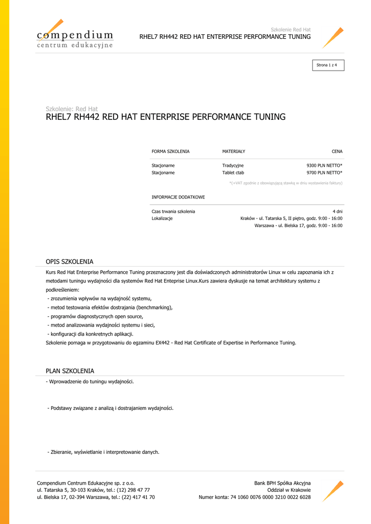 Szkolenie Red Hat RHEL7 RH442 RED HAT ENTERPRISE PERFORMANCE TUNING Strona 1 z 4 Szkolenie: Red Hat RHEL7 RH442 RED HAT ENTERPRISE PERFORMANCE TUNING FORMA SZKOLENIA MATERIAŁY CENA Stacjonarne Tradycyjne 9300 PLN NETTO* Stacjonarne Tablet ctab 9700 PLN NETTO* *(+VAT zgodnie z obowiązującą stawką w dniu wystawienia faktury) INFORMACJE DODATKOWE Czas trwania szkolenia Lokalizacje 4 dni Kraków - ul. Tatarska 5, II piętro, godz. 9:00 - 16:00 Warszawa - ul. Bielska 17, godz. 9:00 - 16:00 OPIS SZKOLENIA Kurs Red Hat Enterprise Performance Tuning przeznaczony jest dla doświadczonych administratorów Linux w celu zapoznania ich z metodami tuningu wydajności dla systemów Red Hat Enteprise Linux.Kurs zawiera dyskusje na temat architektury systemu z podkreśleniem: - zrozumienia wpływów na wydajność systemu, - metod testowania efektów dostrajania (benchmarking), - programów diagnostycznych open source, - metod analizowania wydajności systemu i sieci, - konfiguracji dla konkretnych aplikacji. Szkolenie pomaga w przygotowaniu do egzaminu EX442 - Red Hat Certificate of Expertise in Performance Tuning. PLAN SZKOLENIA - Wprowadzenie do tuningu wydajności. - Podstawy związane z analizą i dostrajaniem wydajności. - Zbieranie, wyświetlanie i interpretowanie danych. Compendium Centrum Edukacyjne sp. z o.o. ul. Tatarska 5, 30-103 Kraków, tel.: (12) 298 47 77 ul. Bielska 17, 02-394 Warszawa, tel.: (22) 417 41 70 Bank BPH Spółka Akcyjna Oddział w Krakowie Numer konta: 74 1060 0076 0000 3210 0022 6028 Szkolenie Red Hat RHEL7 RH442 RED HAT ENTERPRISE PERFORMANCE TUNING Strona 2 z 4 - Używanie podstawowych narzędzi do analizy i interpretacji danych. - Podstawowe pojęcia dotyczące wydajności. - Mechanizmy oraz podstawy podnoszenia wydajności systemu. - Ograniczanie wykorzystania zasobów. - Profilowanie sprzętu. - Analiza i zrozumienie sprzetu. - Profilowanie oprogramowania. - Analiza wydajności oraz wykorzystania procesora i pamięci aplikacji. - Przyspieszanie obsługi małych plików. - Tuning serwera dla obciążenia związanego z częstymi operacjami odczytu i zapisu małych plików. - Przyspieszanie zadań wykorzystujących duże zasoby pamięci. Compendium Centrum Edukacyjne sp. z o.o. ul. Tatarska 5, 30-103 Kraków, tel.: (12) 298 47 77 ul. Bielska 17, 02-394 Warszawa, tel.: (22) 417 41 70 Bank BPH Spółka Akcyjna Oddział w Krakowie Numer konta: 74 1060 0076 0000 3210 0022 6028 Szkolenie Red Hat RHEL7 RH442 RED HAT ENTERPRISE PERFORMANCE TUNING Strona 3 z 4 - Zarządzanie pamięcią i poprawa wydajności. - Poprawa wydajności zadań intensywnie wykorzystujących procesor. - Tuning aplikacji intensywnie wykorzystujących procesor. - Przyspieszanie działania serwera plików. - Zwiększenie wydajności działania podsystemu dyskowego i sieciowego dla obciążenia typowego w serwerze plików. - Przyspieszanie działania baz danych. - Tuning podsystemu pamięci i sieci dla obciążenia typowego w bazach danych. - Ograniczanie zużycia prądu. - Konfiguracja systemu w celu ograniczenia zużycia prądu - Przyśpieszanie działania wirtualizacji. - Konfiguracja systemów hosta i gościa w celu podniesienia wydajności działania wirtualizacji. Compendium Centrum Edukacyjne sp. z o.o. ul. Tatarska 5, 30-103 Kraków, tel.: (12) 298 47 77 ul. Bielska 17, 02-394 Warszawa, tel.: (22) 417 41 70 Bank BPH Spółka Akcyjna Oddział w Krakowie Numer konta: 74 1060 0076 0000 3210 0022 6028 Szkolenie Red Hat RHEL7 RH442 RED HAT ENTERPRISE PERFORMANCE TUNING Strona 4 z 4 WYMAGANIA DLA UCZESTNIKA - Certyfikacja Red Hat Certified Engineer (RHCE) lub ekwiwalentne doświadczenie. - Dla uczestników, którzy nie posiadają certyfikatu RHCSE, potwierdzenie właściwych umiejętności i wiedzy może być uzyskane poprzez ocenę umiejętności online: https://www.redhat.com/rhtapps/assessment/?partner=compendium_centrum. CERTYFIKATY Uczestnicy otrzymują certyfikat wystawiony imiennie oraz na firmę, sygnowany przez firmę Red Hat. PROWADZĄCY Autoryzowany wykładowca Red Hat. Compendium Centrum Edukacyjne sp. z o.o. ul. Tatarska 5, 30-103 Kraków, tel.: (12) 298 47 77 ul. Bielska 17, 02-394 Warszawa, tel.: (22) 417 41 70 Bank BPH Spółka Akcyjna Oddział w Krakowie Numer konta: 74 1060 0076 0000 3210 0022 6028