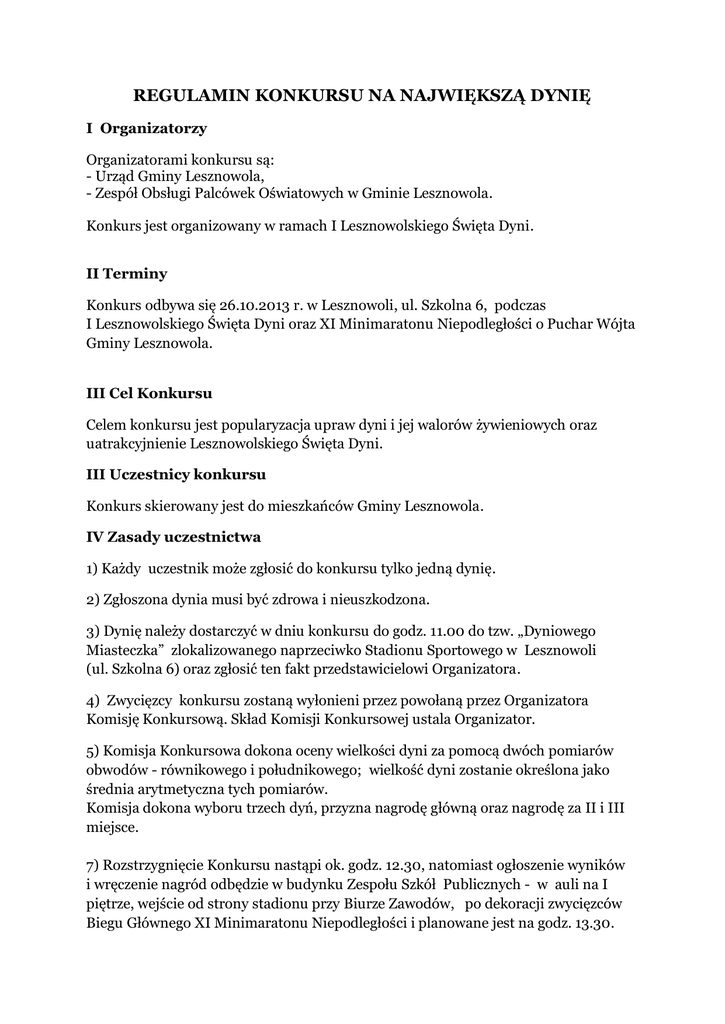 REGULAMIN KONKURSU NA NAJWIĘKSZĄ DYNIĘ I Organizatorzy Organizatorami konkursu są: - Urząd Gminy Lesznowola, - Zespół Obsługi Palcówek Oświatowych w Gminie Lesznowola. Konkurs jest organizowany w ramach I Lesznowolskiego Święta Dyni. II Terminy Konkurs odbywa się 26.10.2013 r. w Lesznowoli, ul. Szkolna 6, podczas I Lesznowolskiego Święta Dyni oraz XI Minimaratonu Niepodległości o Puchar Wójta Gminy Lesznowola. III Cel Konkursu Celem konkursu jest popularyzacja upraw dyni i jej walorów żywieniowych oraz uatrakcyjnienie Lesznowolskiego Święta Dyni. III Uczestnicy konkursu Konkurs skierowany jest do mieszkańców Gminy Lesznowola. IV Zasady uczestnictwa 1) Każdy uczestnik może zgłosić do konkursu tylko jedną dynię. 2) Zgłoszona dynia musi być zdrowa i nieuszkodzona. 3) Dynię należy dostarczyć w dniu konkursu do godz. 11.00 do tzw. „Dyniowego Miasteczka” zlokalizowanego naprzeciwko Stadionu Sportowego w Lesznowoli (ul. Szkolna 6) oraz zgłosić ten fakt przedstawicielowi Organizatora. 4) Zwycięzcy konkursu zostaną wyłonieni przez powołaną przez Organizatora Komisję Konkursową. Skład Komisji Konkursowej ustala Organizator. 5) Komisja Konkursowa dokona oceny wielkości dyni za pomocą dwóch pomiarów obwodów - równikowego i południkowego; wielkość dyni zostanie określona jako średnia arytmetyczna tych pomiarów. Komisja dokona wyboru trzech dyń, przyzna nagrodę główną oraz nagrodę za II i III miejsce. 7) Rozstrzygnięcie Konkursu nastąpi ok. godz. 12.30, natomiast ogłoszenie wyników i wręczenie nagród odbędzie w budynku Zespołu Szkół Publicznych - w auli na I piętrze, wejście od strony stadionu przy Biurze Zawodów, po dekoracji zwycięzców Biegu Głównego XI Minimaratonu Niepodległości i planowane jest na godz. 13.30. 8) Nagrody Organizator przyzna zwycięzcom konkursu puchary oraz nagrody rzeczowe: I miejsce - ekspres ciśnieniowy do kawy, II miejsce - patelnia ceramiczna, III miejsce – komplet noży kuchennych. V Wszystkie kwestie, których nie obejmuje niniejszy regulamin ustala i rozstrzyga Organizator. VI Uczestnictwo w Konkursie jest tożsame z akceptacją niniejszego regulaminu oraz zgodą na publikację zdjęć z wydarzenia i podaniem danych osobowych zwycięzców.