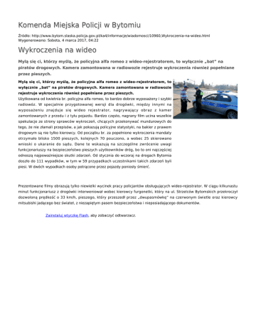 Komenda Miejska Policji w Bytomiu Źródło: http://www.bytom.slaska.policja.gov.pl/ka4/informacje/wiadomosci/10960,Wykroczenia-na-wideo.html Wygenerowano: Sobota, 4 marca 2017, 04:22 Wykroczenia na wideo Mylą się ci, którzy myślą, że policyjna alfa romeo z wideo-rejestratorem, to wyłącznie „bat” na piratów drogowych. Kamera zamontowana w radiowozie rejestruje wykroczenia również popełniane przez pieszych. Mylą się ci, którzy myślą, że policyjna alfa romeo z wideo-rejestratorem, to wyłącznie „bat” na piratów drogowych. Kamera zamontowana w radiowozie rejestruje wykroczenia również popełniane przez pieszych. Użytkowana od kwietnia br. policyjna alfa romeo, to bardzo dobrze wyposażony i szybki radiowóz. W specjalnie przygotowanej wersji dla drogówki, między innymi na wyposażeniu znajduje się wideo rejestrator, nagrywający obraz z kamer zamontowanych z przodu i z tyłu pojazdu. Bardzo często, nagrany film ucina wszelkie spekulacje ze strony sprawców wykroczeń, chcących przekonywać mundurowych do tego, że nie złamali przepisów, a jak pokazują policyjne statystyki, na bakier z prawem drogowym są nie tylko kierowcy. Od początku br. za popełnione wykroczenia mandaty otrzymało blisko 1500 pieszych, kolejnych 70 pouczono, a wobec 25 skierowano wnioski o ukaranie do sądu. Dane te wskazują na szczególne zwrócenie uwagi funkcjonariuszy na bezpieczeństwo pieszych użytkowników dróg, bo to oni najczęściej odnoszą najpoważniejsze skutki zdarzeń. Od stycznia do wczoraj na drogach Bytomia doszło do 111 wypadków, w tym w 59 przypadkach uczestnikami takich zdarzeń byli piesi. W dwóch wypadkach osoby potrącone przez pojazdy poniosły śmierć. Prezentowane filmy obrazują tylko niewielki wycinek pracy policjantów obsługujących wideo-rejestrator. W ciągu kilkunastu minut funkcjonariusz z drogówki interweniował wobec kierowcy furgonetki, który na ul. Strzelców Bytomskich przekroczył dozwoloną prędkość o 33 km/h, pieszego, który przeszedł przez „dwupasmówkę” na czerwonym świetle oraz kierowcy mitsubishi jadącego bez świateł, z niezapiętym pasem bezpieczeństwa i nieposiadającego dokumentów. Zainstaluj wtyczkę Flash, aby zobaczyć odtwarzacz. pobierz film - 2.45 MB Zainstaluj wtyczkę Flash, aby zobaczyć odtwarzacz. pobierz film - 4.15 MB Ocena: 0/5 (0) Tweetnij