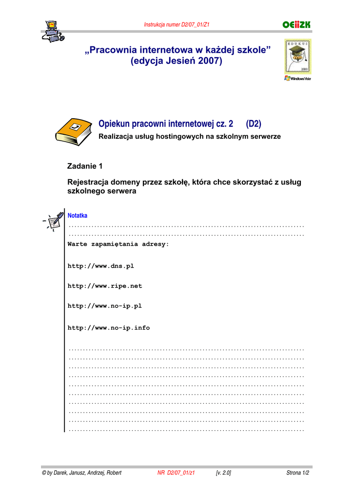 Instrukcja numer D2/07_01/Z1 „Pracownia internetowa w każdej szkole” (edycja Jesień 2007) Opiekun pracowni internetowej cz. 2 (D2) Realizacja usług hostingowych na szkolnym serwerze Zadanie 1 Rejestracja domeny przez szkołę, która chce skorzystać z usług szkolnego serwera Notatka ................................................................................... ................................................................................... Warte zapamiętania adresy: http://www.dns.pl http://www.ripe.net http://www.no-ip.pl http://www.no-ip.info ................................................................................... ................................................................................... ................................................................................... ................................................................................... ................................................................................... ................................................................................... ................................................................................... ................................................................................... ................................................................................... ................................................................................... © by Darek, Janusz, Andrzej, Robert NR D2/07_01/z1 [v. 2.0] Strona 1/2 Realizacja usług hostingowych na szkolnym serwerze Wskazówka – Jak poprawnie wypełnić formularz rejestracji domeny na stronie: http://www.dns.pl Jako pierwszy serwer DNS podajemy: • publiczny adres IP swojego serwera • nazwę serwera nadaną przez dostawcę Internetu np.: pa117.warszawa.sdi.tpnet.pl Poleceniem ping -a x.x.x.x (gdzie x.x.x.x jest adresem IP Państwa serwera) można uzyskać nazwę przyporządkowaną dla danego IP. Jako drugi DNS podaje się serwer, który będzie utrzymywał nazwę domeny. Usługę wpisu i następnie utrzymanie nazwy domen na serwerze nazw domenowych można wykupić lub otrzymać bezpłatnie u dostawcy usług internetowych. Uwaga: Należy także pamiętać, że w ISA Server musi być odblokowany w obu kierunkach port 53 (port usługi DNS). Zadbaliśmy już o to podczas korzystania z kreatora połączenia z siecią Internet Notatka – zakreśl swoją szkołę, której nazwy będziesz używał w dalszej części kursu 1. kosmici 2. meble 3. samochody 4. samoloty 5. dowcipy 6. zwierzaki 7. wypieki 8. kanapki 9. telefony 10. buty 11. koszulki 12. komputery 13. szklanki 14. mapy 15. ogrody 16. kawiarenki 17. kwiaty 18. bilety 19. teatry 20. kuchnia 21. restauracje 22. chomiki 23. zabytki 24. turystyka 25. wczasy 26. jeziora 27. sport 28. motocykle 29. rowery 30. zabawki 31. budownictwo 32. biuro Nazwa twojej domeny to: <nazwa_szkoły>.szz.oeiizk.waw.pl (gdzie zz to numer sali szkoleniowej) Zapisz nazwę twojej domeny: ................................................................................... © by Darek, Janusz, Andrzej, Robert NR D2/07_01/z1 [v. 2.0] Strona 2/2