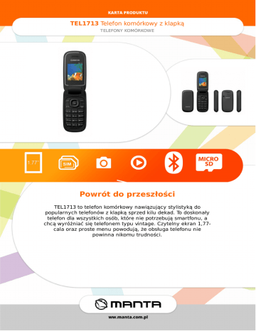 TEL1713Telefonkomórkowyzklapką TELEFONYKOMÓRKOWE Powrótdoprzeszłości TEL1713totelefonkomórkowynawiązującystylistykądo popularnychtelefonówzklapkąsprzedkiludekad.Todoskonały telefondlawszystkichosób,któreniepotrzebująsmartfonu,a chcąwyróżniaćsiętelefonemtypuvintage.Czytelnyekran1,77calaorazprostemenupowodują,żeobsługatelefonunie powinnanikomutrudności. TEL1713Telefonkomórkowyzklapką TELEFONYKOMÓRKOWE Specyfikacja Więcejniżtelefon TEL1713zpowodzeniemmożetakżestanowić rezerwowytelefon,nawypadekrozładowanasię smartfonu.Jestteżidealnydladziecka,na przykładnawyjazdczykolonię,gdzienietrudno byłobyozniszczenielubzgubieniedrogiego smartfonu.TelefonTEL1713wyposażonyjestw funkcjęDUALSIM,dziękiktórejmożeobsługiwać dwiekartySIM,cozatymidzieumożliwia jednoczesnekorzystaniezdwóchnumerów telefonównajednymurządzeniu. Multimedia Telefonposiadarównieżgniazdonakartępamięci MicroSD.Dziękitemuwprostysposóbmożna przekształcićgowodtwarzaczMP3.Wystarczy umieścićulubionąkolekcjęmuzykinakarcie pamięci.TelefonmatakżewbudowaneradioFM, jeśliwięcużytkownikowiznudzisięsłuchanie muzykiMP3,możesłuchaćswojejulubionejstacji radiowej. Przekątnaekranu 1.77" Wymiary(SxWxG) 95(176)x46x18(11)mm Waga 75g Wi-Fi NIE Dual-SIM Tak Bluetooth Tak Aparat Tak Gniazdokartpamięci MicroSD Pojemnośćakumulatora 500mAh ObsługiwanepasmaGSM 900/1800MHz RadioFM Tak OdtwarzanieMP3 TAK Obsługamultimediów TAK http://www.manta.com.pl/pl/tel1713 EAN:5902510600402