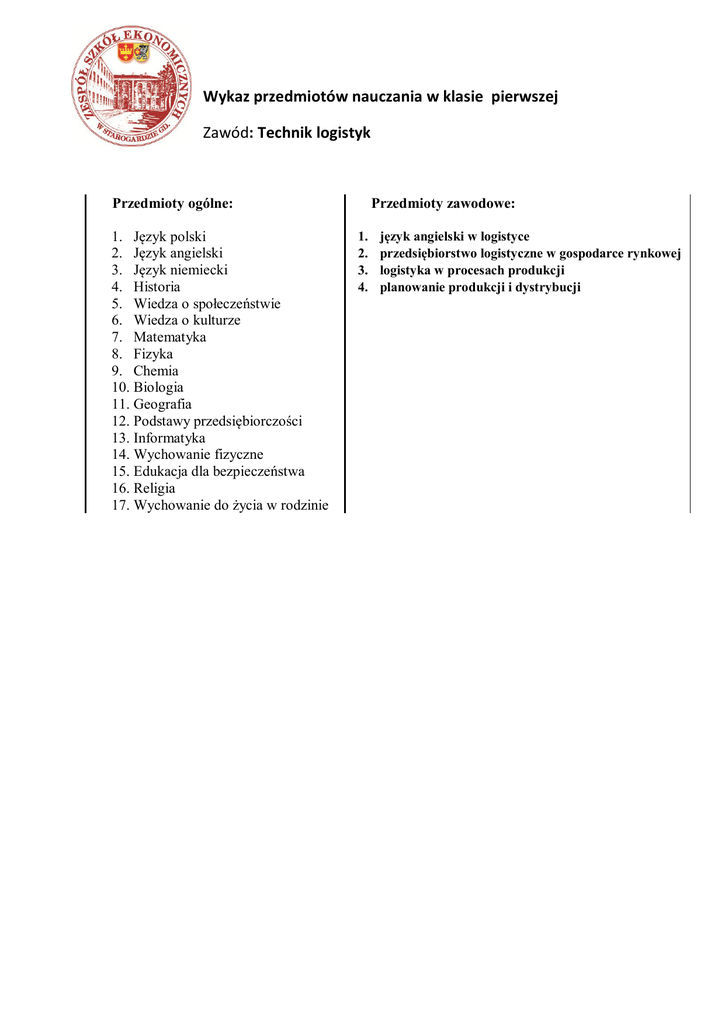 Wykaz przedmiotów nauczania w klasie pierwszej Zawód: Technik logistyk Przedmioty ogólne: 1. Język polski 2. Język angielski 3. Język niemiecki 4. Historia 5. Wiedza o społeczeństwie 6. Wiedza o kulturze 7. Matematyka 8. Fizyka 9. Chemia 10. Biologia 11. Geografia 12. Podstawy przedsiębiorczości 13. Informatyka 14. Wychowanie fizyczne 15. Edukacja dla bezpieczeństwa 16. Religia 17. Wychowanie do życia w rodzinie Przedmioty zawodowe: 1. 2. 3. 4. język angielski w logistyce przedsiębiorstwo logistyczne w gospodarce rynkowej logistyka w procesach produkcji planowanie produkcji i dystrybucji