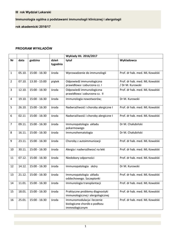 III rok Wydział Lekarski Immunologia ogólna z podstawami immunologii klinicznej i alergologii rok akademicki 2016/17 PROGRAM WYKŁADÓW godzina dzień tygodnia Wyklady IIIL 2016/2017 tytuł Wykladowca Nr data 1 05.10. 15:00 - 16:30 środa Wprowadzenie do immunologii Prof. dr hab. med. ML Kowalski 2 07.10. 13:30 - 15:00 piątek 3 12.10. 15:00 - 16:30 środa Odpowiedź immunologiczna prawidłowa i zaburzona cz. I Odpowiedź immunologiczna prawidłowa i zaburzona cz. II Prof. dr hab. med. ML Kowalski / Dr M. Kurowski Prof. dr hab. med. ML Kowalski 4 19.10. 15:00 - 16:30 środa Immunologia nowotworów; Dr M. Kurowski 5 26.10. 15:00 - 16:30 środa Nadwrażliwość i choroby alergiczne I Prof. dr hab. med. ML Kowalski 6 02.11 15:00 - 16:30 środa Nadwrażliwość i choroby alergiczne I Prof. dr hab. med. ML Kowalski 7 09.11. 15:00 - 16:30 środa Dr M. Chałubiński 8 16.11. 15:00 - 16:30 środa Immunopatologia układu pokarmowego Immunohematologia 9 23.11. 15:00 - 16:30 środa Choroby z autoimmunizacji Prof. dr hab. med. ML Kowalski 10 30.11. 15:00 - 16:30 środa Alergia i nadwrażliwosć na leki Prof. dr hab. med. ML Kowalski 11 07.12. 15:00 - 16:30 środa Niedobory odporności Prof. dr hab. med. ML Kowalski 12 14.12. 15:00 - 16:30 środa Immunopatologia skóry Dr M. Kurowski 13 21.12. 15:00 - 16:30 środa Prof. dr hab. med. ML Kowalski 14 11.01. 15:00 - 16:30 środa Immunopatologia układu oddechowego. Szczepionki Immunologia transplantacji 15 18.01. 15:00 - 16:30 środa Prof. dr hab. med. ML Kowalski 16 25.01. 15:00 - 16:30 środa Praktyczne problemy diagnostyki immunologicznej i alergologicznej Immunomodulacja i leczenie biologiczne chorób o podłozu immnologicznym 1 Dr M. Chałubiński Prof. dr hab. med. ML Kowalski Prof. dr hab. med. ML Kowalski PROGRAM SEMINARIÓW I ĆWICZEŃ Ćwiczenia Treści zajęć w grupach studenckich (seminaria i ćwiczenia praktyczne): STRUKTURA ĆWICZEŃ (3h lekcyjne – 135 minut) 1-8 ćwiczenie Wejściówka 15 minut Prezentacja 30 minut Seminarium 90 minut (w tym 15 minut część praktyczna/pracownia) STRUKTURA ĆWICZEŃ (2h lekcyjne – 90 minut) 9-10 ćwiczenie Wejściówka 15 minut Prezentacja 30 minut Seminarium 45 minut Ćwiczenie. 1. Wprowadzenie do immunologii. Budowa i funkcje układu odpornościowego. Kurowski) (dr Marcin Tydzień od. 3.10.2016 Podręcznik: Immunologia. Gołąb i wsp. 2013. Rozdz. 1,2 Wejściówka (15 minut) Prezentacja tematu (30 minut) Seminarium: Budowa i funkcje układu odpornościowego (90 minut) 1. Układ odpornościowy - główne funkcje, typy odpowiedzi immunologicznej, etapy odpowiedzi odpornościowej. 2. Komórki układu immunologicznego. 3. Narządy limfatyczne – budowa i funkcja Część praktyczna: Komórki układu immunologicznego. Metody pozyskiwania komórek do badań laboratoryjnych. (15 minut w trakcie części seminaryjnej) 1. Wykonanie przez studentów rozmazu krwi obwodowej. Wykonanie pierwszego etapu izolacji limfocytów. 2. Oglądanie preparatów pod mikroskopem – identyfikacja komórek układu odpornościowego, omówienie wzoru odsetkowego leukocytów krwi obwodowej. 3. BIOBANK 2 Ćwiczenie 2. Mechanizmy odpowiedzi nieswoistej. (lek. Agnieszka Drewnik) Tydzień od 10.10.2016. Podręcznik: Immunologia. Gołąb i wsp. 2013. Rozdz. 13,14,15 Wejściówka (15 minut) Prezentacja tematu (30 minut) Seminarium: Odporność wrodzona. (90 minut) 1. 2. 3. 4. 5. 4. Rozpoznawanie drobnoustrojów, receptory odpowiedzi nieswoistej. Komórki układu odpowiedzi nieswoistej. Humoralne elementy odpowiedzi nieswoistej – układ dopełniacza. Funkcje makrofagów i granulocytów. Współdziałanie swoistej i nieswoistej odpowiedzi odpornościowej. Cytotoksyczność zależna od przeciwciał. Część praktyczna: Pracownia diagnostyki immunologicznej. Metody oparte na reakcji antygen – przeciwciało, cz. 1. (15 minut w trakcie części seminaryjnej) 1. Omówienie zasady reakcji precypitacji i aglutynacji 2. Testy lateksowe – wykonanie oznaczenia RF i CRP 3. Przypadek kliniczny: niedobór odporności niedobór C1 inhibitora Ćwiczenie 3. Rozpoznawanie i prezentacja antygenów. (lek. Olga Brzezińska-Pawłowska Tydzień od 17.10.2016. Podręcznik: Immunologia. Gołąb i wsp. 2013. Rozdz. 4.4-4.6; 5; 9 Wejściówka (15 minut) Prezentacja tematu (30 minut) Seminarium: Rozpoznawanie i prezentacja antygenów. (90 minut) 1. 2. 3. 4. 5. 5. Antygeny: definicje, rodzaje Komórki APC Budowa układu MHC Populacje i subpopulacje limfocytów Obróbka antygenu i prezentacja w kontekście MHC Rozpoznawanie antygenów przez limfocyty B Część praktyczna: Pracownia transplantologii. (15 minut w trakcie części seminaryjnej) 1. Omówienie zasad kwalifikacji do przeszczepów. 2. Zasady doboru dawców do przeszczepów ransplantacyjnych. 3. Prezentacja ośrodka dawców szpiku. Przypadek kliniczny - przeszczep 3 i metody oznaczania antygenów Ćwiczenie 4. Budowa i funkcja przeciwciał oraz receptorów TCR. (dr Barbara Majkowska-Wojciechowska) Tydzień od 24.10.2016. Podręcznik: Immunologia. Gołąb i wsp. 2013. Rozdz.,3; 4.1-4.3; 22.1.1 Wejściówka (15 minut) Prezentacja tematu (30 minut) Seminarium: Immunoglobuliny. Rozpoznanie antygenu w mechanizmach odpowiedzi swoistej. (90 minut) 1. 2. 3. 4. 5. Klasy, podklasy przeciwciał- budowa, funkcja. Budowa receptorów TCR. Dojrzewanie i selekcja limfocytów T i B. Powstawanie przeciwciał, źródła różnorodności Ig. Powstawanie i generacja różnorodności receptorów TCR Część praktyczna: Metody oznaczania stężenia IgE. Część praktyczna: Diagnostyka chorób z autoimmunizacji. (15 minut w trakcie części seminaryjnej) 1. 2. 3. 4. Testy oparte o immunofluorescencję – pośrednią i bezpośrednią. Wykonanie pierwszego etapu testu immunofluorescencji pośredniej. Demonstracja przykładowych preparatów ANA i ANCA, ATA Przypadek kliniczny autoimmunizacja: choroba Hashimoto i toczeń. Przypadek kliniczny: Niedobór odporności humoralnej (CVID) Ćwiczenie 5. Odpowiedź typu komórko