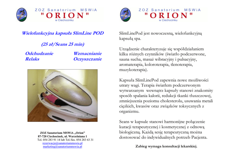 Wielofunkcyjna kapsuła SlimLine POD SlimLinePod jest nowoczesną, wielofunkcyjną kapsułą spa. (25 zł/Seans 25 min) Odchudzanie Relaks Wzmacnianie Oczyszczanie Urządzenie charakteryzuje się współdziałaniem kilku róŜnych czynników (światło podczerwone, sauna sucha, masaŜ wibracyjny i pulsacyjny, aromaterapia, koloroterapia, tlenoterapia, muzykoterapia). Kapsuła SlimLinePod zapewnia nowe moŜliwości utraty wagi. Terapia światłem podczerwonym wytwarzanym wewnątrz kapsuły stanowi znakomity sposób spalania kalorii, redukcji tkanki tłuszczowej, zmniejszenia poziomu cholesterolu, usuwania metali cięŜkich, kwasów oraz związków toksycznych z organizmu. ZOZ Sanatorium MSWiA „Orion” 87-720 Ciechocinek, ul. Warzelniana 1 Tel. 054 283 91 14 lub Tel./fax. 054 283 63 31 [email protected] [email protected] Seans w kapsule stanowi harmonijne połączenie kuracji terapeutycznej i kosmetycznej z odnową biologiczną. KaŜdą sesję terapeutyczną moŜna dostosować do indywidualnych potrzeb Pacjenta. Zabieg wymaga konsultacji lekarskiej.