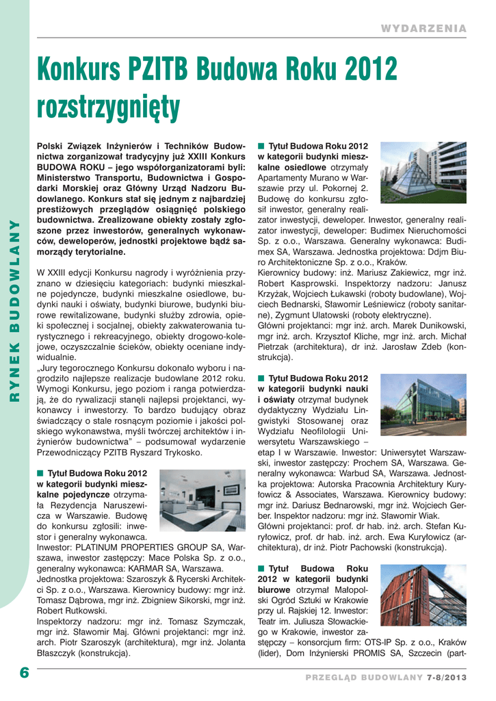 WYDA RZEN I A R YNE K BUDOWLANY Konkurs PZITB Budowa Roku 2012 rozstrzygnięty Polski Związek Inżynierów i Techników Budownictwa zorganizował tradycyjny już XXIII Konkurs BUDOWA ROKU – jego współorganizatorami byli: Ministerstwo Transportu, Budownictwa i Gospodarki Morskiej oraz Główny Urząd Nadzoru Budowlanego. Konkurs stał się jednym z najbardziej prestiżowych przeglądów osiągnięć polskiego budownictwa. Zrealizowane obiekty zostały zgłoszone przez inwestorów, generalnych wykonawców, deweloperów, jednostki projektowe bądź samorządy terytorialne. W XXIII edycji Konkursu nagrody i wyróżnienia przyznano w dziesięciu kategoriach: budynki mieszkalne pojedyncze, budynki mieszkalne osiedlowe, budynki nauki i oświaty, budynki biurowe, budynki biurowe rewitalizowane, budynki służby zdrowia, opieki społecznej i socjalnej, obiekty zakwaterowania turystycznego i rekreacyjnego, obiekty drogowo-kolejowe, oczyszczalnie ścieków, obiekty oceniane indywidualnie. „Jury tegorocznego Konkursu dokonało wyboru i nagrodziło najlepsze realizacje budowlane 2012 roku. Wymogi Konkursu, jego poziom i ranga potwierdzają, że do rywalizacji stanęli najlepsi projektanci, wykonawcy i inwestorzy. To bardzo budujący obraz świadczący o stale rosnącym poziomie i jakości polskiego wykonawstwa, myśli twórczej architektów i inżynierów budownictwa” – podsumował wydarzenie Przewodniczący PZITB Ryszard Trykosko. ■ Tytuł Budowa Roku 2012 w kategorii budynki mieszkalne pojedyncze otrzymała Rezydencja Naruszewicza w Warszawie. Budowę do konkursu zgłosili: inwestor i generalny wykonawca. Inwestor: PLATINUM PROPERTIES GROUP SA, Warszawa, inwestor zastępczy: Mace Polska Sp. z o.o., generalny wykonawca: KARMAR SA, Warszawa. Jednostka projektowa: Szaroszyk & Rycerski Architekci Sp. z o.o., Warszawa. Kierownicy budowy: mgr inż. Tomasz Dąbrowa, mgr inż. Zbigniew Sikorski, mgr inż. Robert Rutkowski. Inspektorzy nadzoru: mgr inż. Tomasz Szymczak, mgr inż. Sławomir Maj. Główni projektanci: mgr inż. arch. Piotr Szaroszyk (architektura), mgr inż. Jolanta Błaszczyk (konstrukcja). 6 ■ Tytuł Budowa Roku 2012 w kategorii budynki mieszkalne osiedlowe otrzymały Apartamenty Murano w Warszawie przy ul. Pokornej 2. Budowę do konkursu zgłosił inwestor, generalny realizator inwestycji, deweloper. Inwestor, generalny realizator inwestycji, deweloper: Budimex Nieruchomości Sp. z o.o., Warszawa. Generalny wykonawca: Budimex SA, Warszawa. Jednostka projektowa: Ddjm Biuro Architektoniczne Sp. z o.o., Kraków. Kierownicy budowy: inż. Mariusz Zakiewicz, mgr inż. Robert Kasprowski. Inspektorzy nadzoru: Janusz Krzyżak, Wojciech Łukawski (roboty budowlane), Wojciech Bednarski, Sławomir Leśniewicz (roboty sanitarne), Zygmunt Ulatowski (roboty elektryczne). Główni projektanci: mgr inż. arch. Marek Dunikowski, mgr inż. arch. Krzysztof Kliche, mgr inż. arch. Michał Pietrzak (architektura), dr inż. Jarosław Zdeb (konstrukcja). ■ Tytuł Budowa Roku 2012 w kategorii budynki nauki i oświaty otrzymał budynek dydaktyczny Wydziału Lingwistyki Stosowanej oraz Wydziału Neofilologii Uniwersytetu Warszawskiego – etap I w Warszawie. Inwestor: Uniwersytet Warszawski, inwestor zastępczy: Prochem SA, Warszawa. Generalny wykonawca: Warbud SA, Warszawa. Jednostka projektowa: Autorska Pracownia Architektury Kuryłowicz & Associates, Warszawa. Kierownicy budowy: mgr inż. Dariusz Bednarowski, mgr inż. Wojciech Gerber. Inspektor nadzoru: mgr inż. Sławomir Wiak. Główni projektanci: prof. dr hab. inż. arch. Stefan Kuryłowicz, prof. dr hab. inż. arch. Ewa Kuryłowicz (architektura), dr inż. Piotr Pachowski (konstrukcja). ■ Tytuł Budowa Roku 2012 w kategorii budynki biurowe otrzymał Małopolski Ogród Sztuki w Krakowie przy ul. Rajskiej 12. Inwestor: Teatr im. Juliusza Słowackiego w Krakowie, inwestor zastępczy – konsorcjum firm: OTS-IP Sp. z o.o., Kraków (lider), Dom Inżynierski PROMIS SA, Szczecin (partPRzeg l Ąd bu d owl any 7-8/2013 WYDAR ZEN I A ner). Generalny wykonawca: Przedsiębiorstwo Budownictwa Ogólnego SKOBUD Sp. z o.o., Żywiec. Jednostka projektowa: Krzysztof Ingarden, Jacek Ewý Architekci Sp. z o.o., Kraków. Kierownik budowy: mgr inż. Dariusz Burda, inspektorzy nadzoru: mgr inż. Jerzy Bochenek (branża konstrukcyjno-budowlana), inż. Stanisław Grochola (branża sanitarno-wentylacyjna), inż. Jan Goliński (branża elektryczna i słaboprądowa). Główni projektanci: dr inż. arch. Krzysztof Ingarden, mgr inż. arch. Jacek Ewý (architektura), mgr inż. Mariusz Szefer (konstrukcja). ■ Tytuł Budowa Roku 2012 w kategorii budynki biurowe otrzymał budynek biurowo-usługowy wraz z niezbędną infrastrukturą w Poznaniu przy ul. Grunwaldzkiej 182–196. Inwestor: 2 BUILD Sp. z o.o., Poznań, PIXEL1 Sp. z o.o., Poznań. Generalny wykonawca: Budimex SA z siedzibą w Warszawie, Oddział Budownictwa Ogólnego Północ w Poznaniu. Jednostki projektowe: JEMS Architekci Sp. z o.o., Warszawa, Architektura Lgl Sp. z o.o., Warszawa (konstrukcja), Roger Preston Polska Sp. z o.o., Warszawa (instalacje), Ultra Architects Sp.c., Poznań (wnętrza). Kierownik budowy: mgr inż. Sławomir Kubiak, inspektor nadzoru: mgr inż. Leszek Kaczmarek. Główni projektanci: mgr inż. Marcin Sadowski (architektura), mgr inż. Jolanta Kordelska-Lenarczyk (konstrukcja). ■ Tytuł Budowa Roku 2012 w kategorii budynki biurowe rewitalizowane otrzymał budynek LE PALAIS OFFICE w Warszawie przy ul. Próżnej 7–9. Inwestor: WARIMPEX (Polska) Sp. z o.o., Warszawa. Generalny wykonawca: PORR (Polska) SA, Warszawa. Jednostka projektowa: OP ARCHITEKTEN ZT Sp. z o.o., Warszawa. KiePR zeglĄ d bu d ow l an y 7-8/2013 ■ Tytuł Budowa Roku 2012 w kategorii budynki służby zdrowia, opieki społecznej i socjalnej otrzymała rozbudowa Szpitala Uniwersyteckiego nr 1 im. dr. A. Jurasza w Bydgoszczy. Inwestor: Uniwersytet Mikołaja Kopernika w Toruniu, Collegium Medicum im. Ludwika Rydygie
