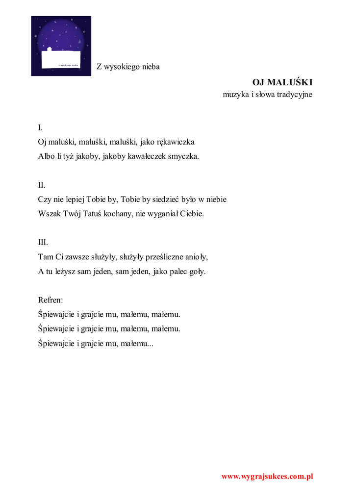 Z wysokiego nieba OJ MALUŚKI muzyka i słowa tradycyjne I. Oj maluśki, maluśki, maluśki, jako rękawiczka Albo li tyż jakoby, jakoby kawałeczek smyczka. II. Czy nie lepiej Tobie by, Tobie by siedzieć było w niebie Wszak Twój Tatuś kochany, nie wyganiał Ciebie. III. Tam Ci zawsze służyły, służyły prześliczne anioły, A tu leżysz sam jeden, sam jeden, jako palec goły. Refren: Śpiewajcie i grajcie mu, małemu, małemu. Śpiewajcie i grajcie mu, małemu, małemu. Śpiewajcie i grajcie mu, małemu... www.wygrajsukces.com.pl