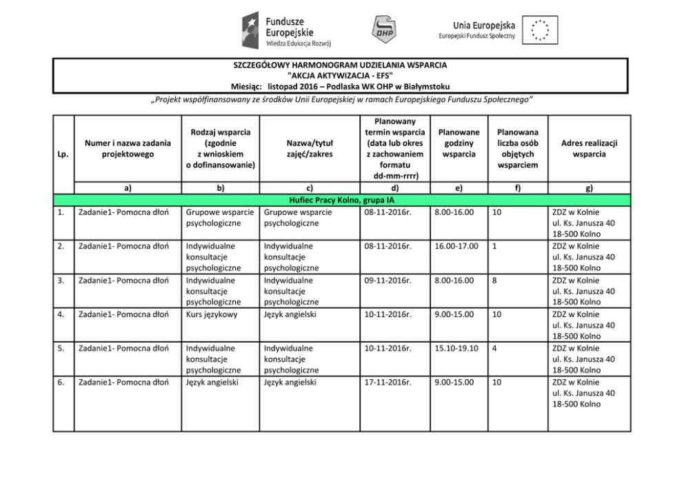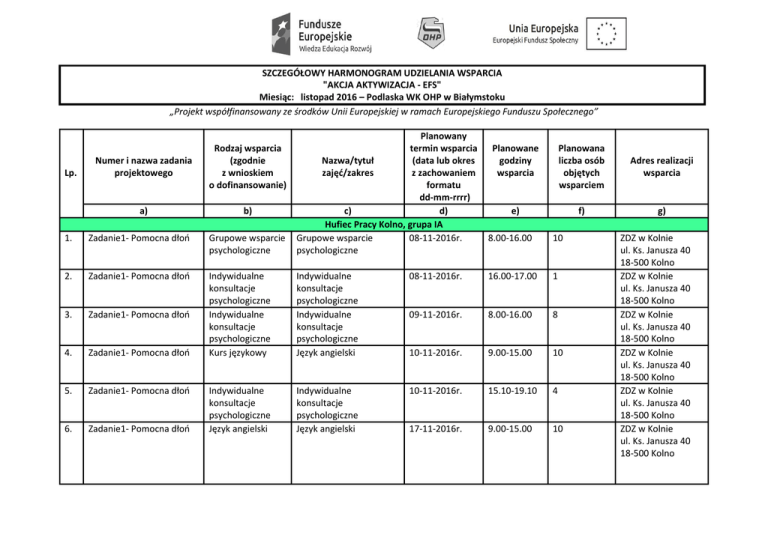 SZCZEGÓŁOWY HARMONOGRAM UDZIELANIA WSPARCIA "AKCJA AKTYWIZACJA - EFS" Miesiąc: listopad 2016 – Podlaska WK OHP w Białymstoku „Projekt współfinansowany ze środków Unii Europejskiej w ramach Europejskiego Funduszu Społecznego” 1. Zadanie1- Pomocna dłoń Grupowe wsparcie psychologiczne Planowany termin wsparcia Nazwa/tytuł (data lub okres zajęć/zakres z zachowaniem formatu dd-mm-rrrr) c) d) Hufiec Pracy Kolno, grupa IA Grupowe wsparcie 08-11-2016r. psychologiczne 2. Zadanie1- Pomocna dłoń 3. Zadanie1- Pomocna dłoń 4. Zadanie1- Pomocna dłoń Indywidualne konsultacje psychologiczne Indywidualne konsultacje psychologiczne Kurs językowy Indywidualne konsultacje psychologiczne Indywidualne konsultacje psychologiczne Język angielski 5. Zadanie1- Pomocna dłoń 6. Zadanie1- Pomocna dłoń Indywidualne konsultacje psychologiczne Język angielski Indywidualne konsultacje psychologiczne Język angielski Lp. Numer i nazwa zadania projektowego Rodzaj wsparcia (zgodnie z wnioskiem o dofinansowanie) a) b) Planowane godziny wsparcia Planowana liczba osób objętych wsparciem Adres realizacji wsparcia e) f) g) 8.00-16.00 10 08-11-2016r. 16.00-17.00 1 09-11-2016r. 8.00-16.00 8 10-11-2016r. 9.00-15.00 10 10-11-2016r. 15.10-19.10 4 17-11-2016r. 9.00-15.00 10 ZDZ w Kolnie ul. Ks. Janusza 40 18-500 Kolno ZDZ w Kolnie ul. Ks. Janusza 40 18-500 Kolno ZDZ w Kolnie ul. Ks. Janusza 40 18-500 Kolno ZDZ w Kolnie ul. Ks. Janusza 40 18-500 Kolno ZDZ w Kolnie ul. Ks. Janusza 40 18-500 Kolno ZDZ w Kolnie ul. Ks. Janusza 40 18-500 Kolno 7. Zadanie1- Pomocna dłoń Język angielski Język angielski 18-11-2016r. 9.00-15.00 4 8. Zadanie1- Pomocna dłoń Język angielski Język angielski 24-11-2016r. 9.00-15.00 10 9. Zadanie1- Pomocna dłoń 15.10-19.10 10 Zadanie1- Pomocna dłoń Indywidualne konsultacje psychologiczne Język angielski 24-11-2016r. 10. Indywidualne konsultacje psychologiczne Język angielski 25-11-2016r. 9.00-15.00 4 14.45-18.00 10 11. Zadanie1- Pomocna dłoń Grupowe wsparcie psychologiczne Hufiec Pracy Augustów, grupa IA Grupowe wsparcie 07-11-2016r. psychologiczne 12. Zadanie1- Pomocna dłoń Grupowe wsparcie psychologiczne Grupowe wsparcie psychologiczne 08-11-2016r. 14.45-18.00 10 13. Zadanie1- Pomocna dłoń Grupowe wsparcie psychologiczne Grupowe wsparcie psychologiczne 09-11-2016r. 14.30-16.00 10 14. Zadanie1- Pomocna dłoń Indywidualne konsultacje psychologiczne Indywidualne konsultacje psychologiczne 09-11-2016r. 16.00-18.00 2 8.00-13.00 10 – grupa IB 15. Zadanie1- Pomocna dłoń Poradnictwo Hufiec Pracy Suwałki, grupa IB Grupowe wsparcie 07-11-2016r. psychologiczne-treningi i warsztaty ZDZ w Kolnie ul. Ks. Janusza 40 18-500 Kolno ZDZ w Kolnie ul. Ks. Janusza 40 18-500 Kolno ZDZ w Kolnie ul. Ks. Janusza 40 18-500 Kolno ZDZ w Kolnie ul. Ks. Janusza 40 18-500 Kolno Gimnazjum nr 2 w Augustowie ul. Nowomiejska 41 16-300 Augustów Gimnazjum nr 2 w Augustowie ul. Nowomiejska 41 16-300 Augustów Gimnazjum nr 2 w Augustowie ul. Nowomiejska 41 16-300 Augustów Gimnazjum nr 2 w Augustowie ul. Nowomiejska 41 16-300 Augustów Sala wykładowa HP W Suwałkach ul. Kościuszki 76 16. Zadanie1- Pomocna dłoń Poradnictwo 17. Zadanie1- Pomocna dłoń Poradnictwo 18. Zadanie1- Pomocna dłoń Poradnictwo 19. Zadanie1- Pomocna dłoń Poradnictwo 20. Zadanie1- Pomocna dłoń Poradnictwo 21. Zadanie1- Pomocna dłoń Poradnictwo 22. Zadanie1- Pomocna dłoń Poradnictwo 23. Zadanie1- Pomocna dłoń 24. Zadanie1- Pomocna dłoń 25. Zadanie1- Pomocna dłoń Indywidualne zajęcia z doradztwa zawodowego Indywidualne zajęcia z doradztwa zawodowego Indywidualne zajęcia z doradztwa zawodowego Grupowe wsparcie 09-11-2016r. psychologiczne-treningi i warsztaty Indywidualne 14-11-2016r. konsultacje psychologiczne Indywidualne 18-11-2016r. konsultacje psychologiczne Indywidualne 21-11-2016r. konsultacje psychologiczne Indywidualne 23-11-2016r. konsultacje psychologiczne Indywidualne 28-11-2016r. konsultacje psychologiczne Indywidualne 02-12-2016r. konsultacje psychologiczne Hufiec Pracy Białystok, grupa II Indywidualne zajęcia z 03-11-2016r. doradztwa zawodowego 8.00-13.00 10 – grupa IB 8.00-13.00 3 – grupa IB 9.00-15.00 3 – grupa IB 8.00-13.00 3 – grupa IB 8.00-13.00 3 – grupa IB 8.00-13.00 3 – grupa IB 8.00-12.00 2 – grupa IB 8.00-16.00 2 Indywidualne zajęcia z doradztwa zawodowego 04-11-2016r. 8.00-16.00 2 Indywidualne zajęcia z doradztwa zawodowego 07-11-2016r. 8.00-16.00 2 Sala wykładowa HP W Suwałkach ul. Kościuszki 76 Sala wykładowa HP W Suwałkach ul. Kościuszki 76 Sala wykładowa HP W Suwałkach ul. Kościuszki 76 Sala wykładowa HP W Suwałkach ul. Kościuszki 76 Sala wykładowa HP W Suwałkach ul. Kościuszki 76 Sala wykładowa HP W Suwałkach ul. Kościuszki 76 Sala wykładowa HP W Suwałkach ul. Kościuszki 76 Hufiec Pracy w Białymstoku ul. NMP Królowej Rodzin 6 Białystok Hufiec Pracy w Białymstoku ul. NMP Królowej Rodzin 6 Białystok Hufiec Pracy w Białymstoku ul. NMP Królowej Rodzin 6 Białystok 26. Zadanie1- Pomocna dłoń 27. Zadanie1- Pomocna dłoń 28. Zadanie1- Pomocna dłoń 29. Zadanie1- Pomocna dłoń 30. Zadanie1- Pomocna dłoń 31. Zadanie1- Pomocna dłoń 32. Zadanie1- Pomocna dłoń Indywidualne zajęcia z doradztwa zawodowego Indywidualne zajęcia z doradztwa zawodowego Grupowe wsparcie psychologiczne – treningi i warsztaty Indywidualne zajęcia z doradztwa zawodowego 08-11-2016r. 8.00-16.00 2 Indywidualne zajęcia z doradztwa zawodowego 10-11-2016r. 8.00-16.00 2 Grupowe wsparcie psychologiczne – treningi i warsztaty 15-11-2016r. 10.00-14.00 10 Indywidualne zajęcia z doradztwa zawodowego Grupowe wsparcie psychologiczne – treningi i warsztaty Indywidualne zajęcia z doradztwa zawodowego 15-11-2016r. 9.00-10.00 14.00-15.00 2 Grupowe wsparcie psychologiczne – treningi i warsztaty 16-11-2016r. 10.00-14.00 10 Indywidualne zajęcia z doradztwa zawodowego Grupowe wsparcie psychologiczne – treningi i warsztaty Indywidualne zajęcia z doradztwa