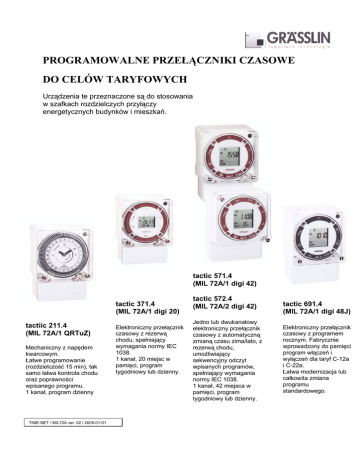 PROGRAMOWALNE PRZEŁĄCZNIKI CZASOWE DO CELÓW TARYFOWYCH Urządzenia te przeznaczone są do stosowania w szafkach rozdzielczych przyłączy energetycznych budynków i mieszkań. tactic 571.4 (MIL 72A/1 digi 42) tactic 371.4 (MIL 72A/1 digi 20) tactiic 211.4 (MIL 72A/1 QRTuZ) Mechaniczny z napędem kwarcowym. Łatwe programowanie (rozdzielczość 15 min), tak samo łatwa kontrola chodu oraz poprawności wpisanego programu. 1 kanał, program dzienny TIME-NET / MIL72A ver. 02 / 2005-01-01 Elektroniczny przełącznik czasowy z rezerwą chodu, spełniający wymagania normy IEC 1038. 1 kanał, 20 miejsc w pamięci, program tygodniowy lub dzienny. tactic 572.4 (MIL 72A/2 digi 42) Jedno lub dwukanałowy elektroniczny przełącznik czasowy z automatyczną zmianą czasu zima/lato, z rezerwą chodu, umożliwiający sekwencyjny odczyt wpisanych programów, spełniający wymagania normy IEC 1038. 1 kanał, 42 miejsca w pamięci, program tygodniowy lub dzienny. tactic 691.4 (MIL 72A/1 digi 48J) Elektroniczny przełącznik czasowy z programem rocznym. Fabrycznie wprowadzony do pamięci program włączeń i wyłączeń dla taryf C-12a i C-22a. Łatwa modernizacja lub całkowita zmiana programu standardowego. Dane techniczne: Układ Wymiary Napięcie zasilania Inne napięcia zasilania Ochrona przepięciowa Pobór mocy Wyjście Obciążalność styków przy: -obciążeniu rezystancyjnym -obciążeniu indukcyjnym cosϕ=0.6 Zakres temperatury pracy Rodzaj ochrony Klasa ochrony Dokładność chodu Rezerwa chodu Czas ładowania baterii litowej Rozdzielczość programowania Pojemność pamięci Ciężar Przełączanie czasu zima/lato tactic 211.4 MIL 72A/1 QRTuZ kwarcowy mech. 74x102,5x56 220-240V, 50Hz do uzgodnienia min. 6 kV 2VA mikrowyłącznik tactic 371.4 tactic 571(2).4 tactic 691.4 MIL 72A/1 digi20 MIL 72A/1(2) digi 42s/w MIL 72A/1 digi 48J kwarcowy cyfr. kwarcowy cyfr. kwarcowy cyfr. 74x102,5x56 74x102,5x56 74x102,5x56 220-240V, 50Hz 220-240V, 50Hz 220-240V, 50Hz do uzgodnienia do uzgodnienia do uzgodnienia min. 6 kV min. 8 kV min. 8 kV 4,4VA 4,4VA 4,4VA przekaźnik przekaźnik przekaźnik 16A / 250V 50Hz 10A / 250V 50Hz 2,5A / 250V 50Hz 2A / 250V 50Hz -200C do +550C -200C do +550C IP 51 IP 51 II II 0 ±1s/24h przy 20 C ±1s/24h przy 200C 150h 6 miesięcy 70h 70h 15minut 1minuta brak 20 rozkazów 100g 100g brak 1h - ręcznie 10A / 250V 50Hz 2A / 250V 50Hz -250C do +550C IP 51 II ±1s/24h przy 200C 2000h 70h 1minuta 42 rozkazy 100g opis poniżej 16A / 250V 50Hz 2,5A / 250V 50Hz -250C do +550C IP 51 II ±1s/24h przy 200C 2000h 70h 1minuta 48 rozkazów 100g opis poniżej * w niskich temperaturach funkcja wyświetlania jest ograniczona przełącznik funkcjonuje prawidłowo do temperatury określonej w tabeli Przełączanie czasu zima/lato w tactic 571.4 i 572.4: a- automatyczne programowanie przez dostawcę zgodnie z ustaleniami Unii Europejskiej b- możliwość zmiany programu przez użytkownika w ustalonych datach lub w ustalonym dniu określonego tygodnia i miesiąca Możliwość tworzenia bloków dni tygodnia w przełącznikach tactic 371.4 , 571.4 , 572.4 , 691.4: 1, 2, 3, 4, 5, 6, 7 od poniedziałku do niedzieli 1, 2, 3, 4, 5, 6, od poniedziałku do soboty 1, 2, 3, 4, 5, -, od poniedziałku do piątku -, -, -, -, -, 6, 7 sobota, niedziela 1, -, -, -, -, -, pojedyncze dni Możliwość tworzenia dowolnych kombinacji pojedynczych dni tygodnia w tactic 571.4 , 572.4 , 691.4 np. : 1, -, 3, -, 5, -, poniedziałek, środa, piątek -, -, -, -, 6, -, 7 piątek, niedziela Schemat połączeń listwy zaciskowej. Wersja tactic...DU do montażu na standardowej tablicy licznikowej. (widok tylnej ściany montażowej przełącznika) Wymiary zewnętrzne urządzenia.