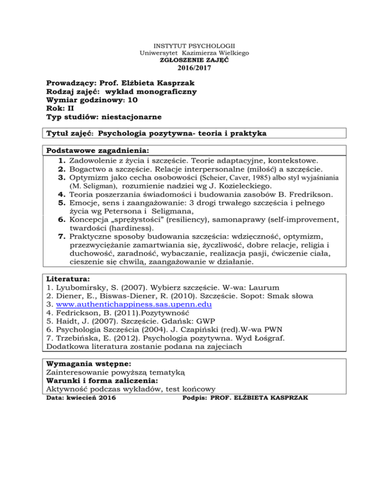 INSTYTUT PSYCHOLOGII Uniwersytet Kazimierza Wielkiego ZGŁOSZENIE ZAJĘĆ 2016/2017 Prowadzący: Prof. Elżbieta Kasprzak Rodzaj zajęć: wykład monograficzny Wymiar godzinowy: 10 Rok: II Typ studiów: niestacjonarne Tytuł zajęć: Psychologia pozytywna- teoria i praktyka Podstawowe zagadnienia: 1. Zadowolenie z życia i szczęście. Teorie adaptacyjne, kontekstowe. 2. Bogactwo a szczęście. Relacje interpersonalne (miłość) a szczęście. 3. Optymizm jako cecha osobowości (Scheier, Caver, 1985) albo styl wyjaśniania (M. Seligman), rozumienie nadziei wg J. Kozieleckiego. 4. Teoria poszerzania świadomości i budowania zasobów B. Fredrikson. 5. Emocje, sens i zaangażowanie: 3 drogi trwałego szczęścia i pełnego życia wg Petersona i Seligmana, 6. Koncepcja „sprężystości” (resiliency), samonaprawy (self-improvement, twardości (hardiness). 7. Praktyczne sposoby budowania szczęścia: wdzięczność, optymizm, przezwyciężanie zamartwiania się, życzliwość, dobre relacje, religia i duchowość, zaradność, wybaczanie, realizacja pasji, ćwiczenie ciała, cieszenie się chwilą, zaangażowanie w działanie. Literatura: 1. Lyubomirsky, S. (2007). Wybierz szczęście. W-wa: Laurum 2. Diener, E., Biswas-Diener, R. (2010). Szczęście. Sopot: Smak słowa 3. www.authentichappiness.sas.upenn.edu 4. Fedrickson, B. (2011).Pozytywność 5. Haidt, J. (2007). Szczęście. Gdańsk: GWP 6. Psychologia Szczęścia (2004). J. Czapiński (red).W-wa PWN 7. Trzebińska, E. (2012). Psychologia pozytywna. Wyd Łośgraf. Dodatkowa literatura zostanie podana na zajęciach Wymagania wstępne: Zainteresowanie powyższą tematyką Warunki i forma zaliczenia: Aktywność podczas wykładów, test końcowy Data: kwiecień 2016 Podpis: PROF. ELŻBIETA KASPRZAK