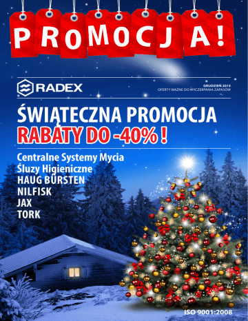 GRUDZIEŃ 2015 OFERTY WAŻNE DO WYCZERPANIA ZAPASÓW ŚWIĄTECZNA PROMOCJA RABATY DO -40% ! Centralne Systemy Mycia Śluzy Higieniczne HAUG BÜRSTEN NILFISK JAX TORK ISO 9001:2008 Środki Chemiczne Produkt Opis Śluzy Higieniczne Centralne Systemy Sprzęt Higieniczny Mycia Cena Produkt Opis SPRZĘT TECHNICZNY Stacja Dezynfekcji Spodów nawierzchniowa / zagłębiona Stacja dezynfekcji obuwia SDS 01 jest jednym z elementów śluzy sanitarnej w zakładach przemysłu spożywczego. Służy do wykonania dezynfekcji spodów obuwia pracowników udających się do obszarów produkcyjnych. Wąż w podwójnym oplocie stalowym 20/25m obustronnie zakuty Oleje i Smary Środki Higieniczne Bęben kpl. AV1100/AV3500 z mechanizmem samozwijającym 2400,1400,- Możliwe nawinięcie 20,25, 30 mb węża. Wykonany ze stali nierdzewnej. Wpływają wydatnie na przedłużenie żywotności węży oraz podniesienie higieny i bezpieczeństwa pracy. Cena 2628\3618,1900\2600,- Wąż SUPER THERMOCLEAN 20/25 MB obustronnie zakuty Wąż w oplocie syntetycznym. Wytrzymały, elastyczny i odporny na plątanie. Wykonany z sześciu warstw włókien poliestrowych. Powierzchnia zewnętrzna jest odporna na produkty oleiste i detergenty. Zakres temperaturowy: od -10 do 70°C, ciśnienie robocze max 40 bar 719\859,520\640,- Wąż ½ w podwójnym oplocie stalowym. Zakres temperaturowy pracy od -15°C do +95°C, maksymalne ciśnienie pracy 220 bar. Pistolet AKBO Pistolety wykonane są ze stali nierdzewnej i pokryte osłoną z gumy. Ich unikalna konstrukcja zapobiega przypadkowemu naciśnięciu oraz skierowaniu strumienia do siebie. 313,210,- 639\719,520\645,- Lanca płucząca LP650 175,110,- Lanca pianowa LP250 260,143,- JEDNOSTKI POMPOWE Jednostka Pompowa JPR 3/250 E (z obudową) – podstawowy element Centralnego Systemu Mycia. Podnosi ciśnienie wody, która jest doprowadzana do stacji satelitarnych oraz punktów płukania. Możliwa jest jednoczesna praca 2-3 stacji satelitarnych pracujących w cyklu płukania. -ciśnienie nominalne wody na wyjściu ok. 20 bar -wydajność nominalna 75 l/min -minimalne ciśnienie wody na wejściu 2,5 bar -zasilanie 3x400 V -moc silnika pompy 2,2 kW. Wymiary (wys. x szer. x gł.) 125x52x28 mm. Jednostka Pompowa JPR 5/270 E (z obudową) - podstawowy element Centralnego Systemu Mycia. Podnosi ciśnienie wody, która jest doprowadzana do stacji satelitarnych oraz punktów płukania. Możliwa jest jednoczesna praca 4-5 stacji satelitarnych pracujących w cyklu płukania. -ciśnienie nominalne wody na wyjściu ok. 20 bar -wydajność nominalna 125l/min -minimalne ciśnienie wody na wejściu 2,5 bar -zasilanie 3x400 V - moc silnika pompy 4,0 kW. Wymiary (wys. x szer. x gł.) 160x52x28 mm. 16 918,12 000,- Jednostka Pompowa JPR 3/250 EB (bez obudowy) – podstawowy element Centralnego Systemu Mycia. Podnosi ciśnienie wody, która jest doprowadzana do stacji satelitarnych oraz punktów płukania. Możliwa jest jednoczesna praca 2-3 stacji satelitarnych pracujących w cyklu płukania. -ciśnienie nominalne wody na wyjściu ok. 20 bar -wydajność nominalna 75 l/min -minimalne ciśnienie wody na wejściu 2,5 bar -zasilanie 3x400 V -moc silnika pompy 2,2 kW. Wymiary (wys. x szer. x gł.) 125x52x28 mm. 19 100,13 500,- Jednostka Pompowa JPR 5/270 EB (bez obudowy) - podstawowy element Centralnego Systemu Mycia. Podnosi ciśnienie wody, która jest doprowadzana do stacji satelitarnych oraz punktów płukania. Możliwa jest jednoczesna praca 4-5 stacji satelitarnych pracujących w cyklu płukania. -ciśnienie nominalne wody na wyjściu ok. 20 bar -wydajność nominalna 125l/min -minimalne ciśnienie wody na wejściu 2,5 bar -zasilanie 3x400 V - moc silnika pompy 4,0 kW. Wymiary (wys. x szer. x gł.) 160x52x28 mm. 15 418,11 000,- 17 600,12 500,- STACJE SATELITARNE Stacja satelitarna SR 25-1 jest elementem peryferyjnym (satelitarnym) Centralnego Systemu Mycia. Jest to niewielkich rozmiarów urządzenie, które podłączone do zakładowej instalacji sprężonego powietrza oraz ciepłej wody pod ciśnieniem do 25 bar umożliwia łatwe wykonanie wszystkich czynności higienicznych tj.: • płukanie wstępne pod ciśnieniem do 25 bar, • nakładanie piany środka myjącego, • dezynfekcję natryskową lub pianową. SR 25-1: stacja jednoinżektorowa (1 dozownik, 1 wąż zasysający środek chemiczny) Stacja satelitarna SR 25-2P jest elementem peryferyjnym (satelitarnym) 3309,1980,- T JĄ Y W OK A W KO Podane ceny netto nie zawierają podatku VAT oraz kosztów dostawy. Copywright © 2015-2016 RADEX S.A. i/lub podmioty powiązane. !!! A A ZJ Centralnego Systemu Mycia. Jest to niewielkich rozmiarów urządzenie, które podłączone do zakładowej instalacji sprężonego powietrza oraz ciepłej wody pod ciśnieniem do 25 bar umożliwia 5375,łatwe wykonanie wszystkich czynności higienicznych tj.: 2980,• płukanie wstępne pod ciśnieniem do 25 bar, • nakładanie piany środka myjącego, • dezynfekcję natryskową lub pianową. SR 25-2P: stacja dwuinżektorowa (2 dozowniki, 2 węże zasysające środki chemiczne, 1 układ pianowania - oznacza to, że jeden ze środków może być podawany tylko w postaci natryskowej) WWW.RADEX.COM.PL Produkt Środki Chemiczne Śluzy Higieniczne Centralne Systemy Sprzęt Higieniczny Mycia Produkt Opis Cena KOMPLETNE PUNKTY MYJĄCE Opis Kompletny punkt mycia z wężem 20/25m na bębnie Oleje i Smary Środki Higieniczne Cena Kompletny punkt mycia z wężem 20/25m na wieszaku stacja satelitarna SR25-1, wieszak KP35 na poj. z płynem, zawór motylkowy 1/2” z szybkozłączem 1/2”, wieszak WL60 na lance, zawór kulowy 1/2” kpl., zawór kulowy 1/2” z mikrozłączem pow., wąż Semperit 1/2” 20/25 mb, zestaw lanc (płucząca pianowa dezynfekcyjna), bęben AV 1100/AV3500 kpl., wąż przyłączeniowy 1/2’’ z szybkozłączem 1/2” stacja satelitarna SR25-1, wieszak WW20 na wąż, wieszak KP35 na poj. z płynem, zawór motylkowy 1/2” z szybkozłączem 1/2”, wieszak WL60 na lan