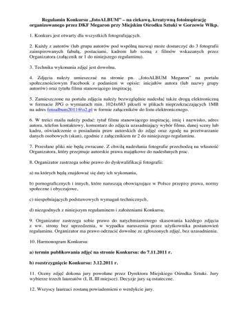 Regulamin Konkursu „fotoALBUM” – na ciekaw, kreatywn fotoinspiracj organizowanego przez DKF Megaron przy Miejskim Orodku Sztuki w Gorzowie Wlkp. 1. Konkurs jest otwarty dla wszystkich fotografujcych. 2. Kady z autorów (lub grupa autorów pod wspóln nazw) moe dostarczy do 3 fotografii zainspirowanych fabuł, postaciami, kadrem lub scen z filmów wskazanych przez Organizatora (załcznik nr 1 do niniejszego regulaminu). 3. Technika wykonania zdj jest dowolna. 4. Zdjcia naley umieszcza na stronie pn. „fotoALBUM Megaron” na portalu społecznociowym Facebook z podaniem w opisie: inicjałów autora (lub nazwy grupy autorów) oraz tytułu filmu stanowicego inspiracj. 5. Zamieszczone na portalu zdjcia naley bezwzgldnie nadesła take drog elektroniczn w formacie JPG o wymiarach min. 1024x683 pikseli w plikach nieprzekraczajcych 1MB na adres [email protected] w formie załczników do listu elektronicznego. 6. W treci maila naley poda: tytuł filmu stanowicego inspiracj, imi i nazwisko, adres autora, telefon kontaktowy, komentarz do zdjcia uzasadniajcy wybór filmu, danej sceny lub kadru, owiadczenie o posiadaniu praw autorskich do zdj oraz zgod na przetwarzanie danych osobowych (skan), zgodnie z załcznikiem nr 2 do niniejszego regulaminu. 7. Przesłane pliki nie bd zwracane. Z chwil nadesłania fotografie przechodz na własno Organizatora, który przejmuje autorskie prawa majtkowe do nadesłanych prac. 8. Organizator zastrzega sobie prawo do dyskwalifikacji fotografii: a) na których bd znajdowa si daty ich wykonania, b) pornograficznych i innych, które naruszaj obowizujce w Polsce przepisy prawa, normy społeczne i obyczajowe, c) niespełniajcych podstawowych wymaga technicznych, d) niezgodnych z niniejszym regulaminem i załoeniami Konkursu. 9. Organizator zastrzega sobie prawo do natychmiastowego skasowania kadego zdjcia z ww. strony bez uprzedzenia, w wypadku naruszenia przez uytkownika postanowie regulaminu. Organizator ma prawo odrzuci dowolne ze zgłoszonych zdj, bez uzasadnienia. 10. Harmonogram Konkursu: a) termin publikowania zdj na stronie Konkursu: do 7.11.2011 r. b) rozstrzygnicie Konkursu: 3.12.2011 r. 11. Oceny zdj dokona jury powołane przez Dyrektora Miejskiego Orodka Sztuki. Jury wybierze trzech laureatów (I, II, III miejsce). Decyzje jury s ostateczne. 12. Wszyscy laureaci zostan powiadomieni o werdykcie jury. 13. Dodatkowo, 9 zdj, które zbior najwicej „Lubi to” na stronie Konkursu na portalu Facebook otrzyma „wyrónienia publicznoci” w Konkursie. 14. Udział w Konkursie jest jednoznaczny z nieodpłatnym udzieleniem prawa do nieodpłatnego wykorzystywania prac w nastpujcych polach eksploatacji: druku w dowolnej liczbie publikacji i w dowolnym nakładzie, uywania ich w Internecie oraz w innych formach utrwale, nadajcych si do rozpowszechniania w ramach działa Organizatora. 15. Nagrodami w Konkursie s: I m-ce – 700 zł II m-ce – 500 zł III m-ce – 400 zł przekazane zwycizcom w formie ubra firmy House. Fundatorem nagród jest firma LPP S.A. Laureaci i wyrónieni otrzymaj take zestawy płyt DVD, gadety filmowe. Nagrody rzeczowe nie podlegaj zamianie na inne ani zamianie na ekwiwalent pieniny. 16. Odbiór ubra firmy House nastpi w wybranym przez Laureata sklepie po uprzednim kontakcie z Organizatorem. Pozostałe nagrody przesłane zostan laureatom na koszt Organizatora w okresie 10 dni od daty ogłoszenia wyników Konkursu. 17. Organizator planuje wydanie zdj w formie kalendarza na rok 2012. 18. Umieszczenie prac na stronie Konkursu na portalu Facebook oznacza akceptacj warunków Konkursu i regulaminu, którego ostateczna interpretacja naley do jury Konkursu. adne odwołania nie zostan uwzgldnione. 19. Organizator zastrzega sobie prawo do przerwania lub odwołania Konkursu. 20. Organizator zastrzega sobie moliwo wprowadzenia zmian do regulaminu w dowolnym czasie bez potrzeby informowania uczestników Konkursu. Zmiany obowizuj od momentu ich wprowadzenia. 21. Udział w Konkursie jest równoznaczny z wyraeniem przez osoby uczestniczce zgody na przetwarzanie przez Organizatora ich danych osobowych na potrzeby Konkursu oraz w celach marketingowych Organizatora (ustawa o ochronie danych osobowych z dnia 29.08.1997r. Dz.U. Nr 133 poz.833 z póz. zm.). Osoby uczestniczce w Konkursie potwierdzaj swoj zgod poprzez przesłanie do Organizatora owiadczenia zgodnie z załcznikiem nr 2 do niniejszego regulaminu. 22. Wszelkie sprawy nieuregulowane w niniejszym regulaminie rozstrzyga Organizator. Załcznik nr 1. Lista filmów: Załcznik nr 2. Owiadczenie uczestnika Konkursu: Owiadczam, i posiadam pełni praw autorskich do nadesłanych przeze mnie zdj oraz wyraam zgod na przetwarzanie przez Organizatora danych osobowych na potrzeby Konkursu oraz w celach marketingowych Organizatora (ustawa o ochronie danych osobowych z dnia 29.08.1997 r. Dz.U. Nr 133 poz. 833 z póz. zm.). ……………………………………………………... Podpis uczestnika (lub osoby reprezentujcej grup)