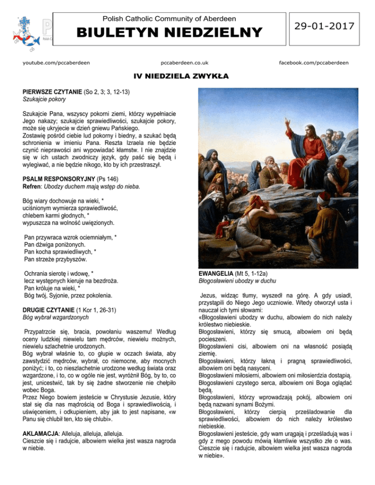 Polish Catholic Community of Aberdeen BIULETYN NIEDZIELNY youtube.com/pccaberdeen pccaberdeen.co.uk 29-01-2017 facebook.com/pccaberdeen IV NIEDZIELA ZWYKŁA PIERWSZE CZYTANIE (So 2, 3; 3, 12-13) Szukajcie pokory Szukajcie Pana, wszyscy pokorni ziemi, którzy wypełniacie Jego nakazy; szukajcie sprawiedliwości, szukajcie pokory, może się ukryjecie w dzień gniewu Pańskiego. Zostawię pośród ciebie lud pokorny i biedny, a szukać będą schronienia w imieniu Pana. Reszta Izraela nie będzie czynić nieprawości ani wypowiadać kłamstw. I nie znajdzie się w ich ustach zwodniczy język, gdy paść się będą i wylegiwać, a nie będzie nikogo, kto by ich przestraszył. PSALM RESPONSORYJNY (Ps 146) Refren: Ubodzy duchem mają wstęp do nieba. Bóg wiary dochowuje na wieki, * uciśnionym wymierza sprawiedliwość, chlebem karmi głodnych, * wypuszcza na wolność uwięzionych. Pan przywraca wzrok ociemniałym, * Pan dźwiga poniżonych. Pan kocha sprawiedliwych, * Pan strzeże przybyszów. Ochrania sierotę i wdowę, * lecz występnych kieruje na bezdroża. Pan króluje na wieki, * Bóg twój, Syjonie, przez pokolenia. DRUGIE CZYTANIE (1 Kor 1, 26-31) Bóg wybrał wzgardzonych Przypatrzcie się, bracia, powołaniu waszemu! Według oceny ludzkiej niewielu tam mędrców, niewielu możnych, niewielu szlachetnie urodzonych. Bóg wybrał właśnie to, co głupie w oczach świata, aby zawstydzić mędrców, wybrał, co niemocne, aby mocnych poniżyć; i to, co nieszlachetnie urodzone według świata oraz wzgardzone, i to, co w ogóle nie jest, wyróżnił Bóg, by to, co jest, unicestwić, tak by się żadne stworzenie nie chełpiło wobec Boga. Przez Niego bowiem jesteście w Chrystusie Jezusie, który stał się dla nas mądrością od Boga i sprawiedliwością, i uświęceniem, i odkupieniem, aby jak to jest napisane, «w Panu się chlubił ten, kto się chlubi». AKLAMACJA: Alleluja, alleluja, alleluja. Cieszcie się i radujcie, albowiem wielka jest wasza nagroda w niebie. EWANGELIA (Mt 5, 1-12a) Błogosławieni ubodzy w duchu Jezus, widząc tłumy, wyszedł na górę. A gdy usiadł, przystąpili do Niego Jego uczniowie. Wtedy otworzył usta i nauczał ich tymi słowami: «Błogosławieni ubodzy w duchu, albowiem do nich należy królestwo niebieskie. Błogosławieni, którzy się smucą, albowiem oni będą pocieszeni. Błogosławieni cisi, albowiem oni na własność posiądą ziemię. Błogosławieni, którzy łakną i pragną sprawiedliwości, albowiem oni będą nasyceni. Błogosławieni miłosierni, albowiem oni miłosierdzia dostąpią. Błogosławieni czystego serca, albowiem oni Boga oglądać będą. Błogosławieni, którzy wprowadzają pokój, albowiem oni będą nazwani synami Bożymi. Błogosławieni, którzy cierpią prześladowanie dla sprawiedliwości, albowiem do nich należy królestwo niebieskie. Błogosławieni jesteście, gdy wam urągają i prześladują was i gdy z mego powodu mówią kłamliwie wszystko złe o was. Cieszcie się i radujcie, albowiem wielka jest wasza nagroda w niebie». Zwróćmy uwagę na jedno z ośmiu błogosławieństw: „Błogosławieni, którzy płaczą, albowiem oni będą pocieszeni”. Najczęściej uważamy, że człowiek, który płacze, nie zawsze płacze przy rachunku sumienia. Płacze dlatego, że jest chory, dlatego że nie udało mu się życie, że nie ma mieszkania, płacze, bo pokrzywdzono go przy wypłacie. Uważa, że pociechę znajdzie, gdy dzięki Panu Bogu odzyska zdrowie, nagle zrobi karierę, dostanie mieszkanie, powiedzą mu o podwyżce. Nie tylko o to chodzi. Pocieszenie można znaleźć w rozumieniu, że to, czego się boimy, przed czym uciekamy, może nas zbliżyć do Boga. ks. Jan Twardowski ŚWIATŁOŚĆ WIECZNA JUŻ JEJ ŚWIECI Wspólnota Prowincji Polskiej Salwatorianów z wielkim smutkiem przyjęła informację o tragicznej śmierci wolontariuszki Wolontariatu Misyjnego Salvator Heleny Kmieć. Miała ona miejsce dnia 24 stycznia br. w boliwijskiej miejscowości Cochabamba. Wiadomość ta jest tym smutniejsza, że jej śmierć nastąpiła w wyniku umyślnego działania drugiego człowieka, który dla osiągnięcia niewiadomego jeszcze celu, zadał nożem śmiertelne rany. W tym wyjątkowym czasie jednoczymy się z Rodziną śp. Heleny, przyjaciółmi i wszystkimi, których jej śmierć dotknęła. Nie tylko współczujemy i ogarniamy modlitwą, ale podejmujemy konkretne działania związane z procedurami następującymi w tego typu sytuacjach. W szczególny sposób wspieramy wolontariuszkę Anitę Szuwald, która razem z śp. Heleną realizowała posługę dla dzieci w Cochabamba. Mimo tego, że ocalała, bardzo cierpi z powodu straty Przyjaciółki oraz pozostałych okoliczności tego tragicznego zajścia. Wyrazy solidarności i wdzięczności kierujemy również pod adresem Sióstr Służebniczek Dębickich, które umożliwiły salwatoriańskim wolontariuszkom realizację ich misyjnego powołania, a obecnie koordynują działania na miejscu i otaczają opieką Anitę. Zaangażowanie w wolontariat już w założeniach świadczy o nieprzeciętności człowieka. Wolontariat misyjny jest motywowany pragnieniem dzielenia się Dobrą Nowiną z drugim człowiekiem, nie tylko słowem, ale przede wszystkim przez pełnienie dzieł Miłosierdzia. Śp. Helenka z WMS-u była i pozostanie wzorem wyjątkowego zaangażowania. Służąc drugiemu człowiekowi wykorzystywała swoje liczne talenty i umiejętności, była otwarta, wrażliwa oraz silna i odważna. Jej życie i wybory, jakich dokonała – po prostu – MIAŁY SENS! W ostatnich dniach, pod adresem polskiego prowincjała oraz duszpasterzy Wolontariatu Misyjnego Salvator, przesyłane są wyrazy współczucia, wsparcia oraz wspomnienia o Śp. Helence, które mają formę świadectw o jej pięknej życiowej postawie, nazywanej nawet świętością. (...) ks. Piotr Filas SDS prowincjał Helena Kmieć urodziła się 9 lutego 1991 roku. Pochodziła z Libiąża. Do Wolonta